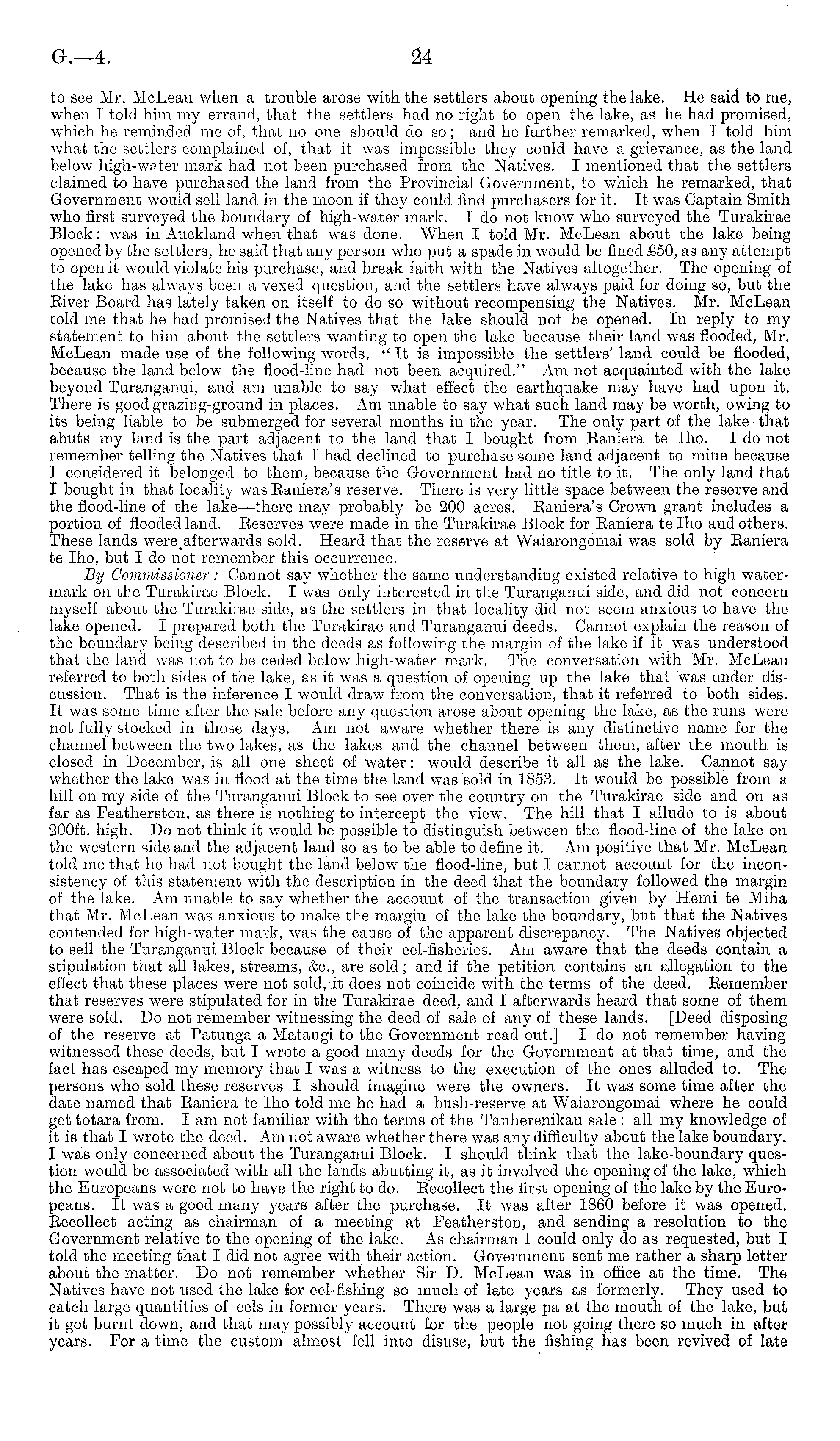 to see Mr. McLean when a trouble arose with the settlers about opening the lake. He said to me, when I told him my errand, that the settlers had no right to open the lake, as he had promised, which he reminded me of, that no one should do so; and he further remarked, when I told him what the settlers complained of, that it was impossible they could have a grievance, as the land below high-water mark had not been purchased from the Natives. I mentioned that the settlers claimed to have purchased the land from the Provincial Government, to which he remarked, that Government would sell land in the moon if they could find purchasers for it. It was Captain Smith who first surveyed the boundary of high-water mark. Ido not know who surveyed the Turakirae Block: was in Auckland when that was done. When I told Mr. McLean about the lake being opened by the settlers, he said that any person who put a spade in would be fined £50, as any attempt to open it would violate his purchase, and break faith with the Natives altogether. The opening of the lake has always been a vexed question, and the settlers have always paid for doing so, but the Eiver Board has lately taken on itself to do so without recompensing the Natives. Mr. McLean told me that he had promised the Natives that the lake should not be opened. In reply to my statement to him about the settlers wanting to open the lake because their land was flooded, Mr. McLean made use of the following words, "It is impossible the settlers' land could be flooded, because the land below the flood-line had not been acquired." Am not acquainted with the lake beyond Turanganui, and am unable to say what effect the earthquake may have had upon it. There is good grazing-ground in places. Am unable to say what such land may be worth, owing to its being liable to be submerged for several months in the year. The only part of the lake that abuts my land is the part adjacent to the land that 1 bought from Baniera te Iho. Ido not remember telling the Natives that I had declined to purchase some land adjacent to mine because I considered it belonged to them, because the Government had no title to it. The only land that I bought in that locality wasEaniera's reserve. There is very little space between the reserve and the flood-line of the lake —there may probably be 200 acres. Eaniera's Grown grant includes a portion of flooded land. Eeserves were made in the Turakirae Block for Eaniera te Iho and others. These lands were.afterwards sold. Heard that the reserve at Waiarongomai was sold by Eaniera te Iho, but I do not remember this occurrence. By Commissioner : Cannot say whether the same understanding existed relative to high watermark on the Turakirae Block. I was only interested in the Turanganui side, and did not concern myself about the Turakirae side, as the settlers in that locality did not seem anxious to have the lake opened. I prepared both the Turakirae and Turanganui deeds. Cannot explain the reason of the boundary being described in the deeds as following the margin of the lake if it was understood that the land was not to be ceded below high-water mark. The conversation with Mr. McLean referred to both sides of the lake, as it was a question of opening up the lake that was under discussion. That is the inference I would draw from the conversation, that it referred to both sides. It was some time after the sale before any question arose about opening the lake, as the runs were not fully stocked in those days. Am not aware whether there is any distinctive name for the channel between the two lakes, as the lakes and the channel between them, after the mouth is closed in December, is all one sheet of water: would describe it all as the lake. Cannot say whether the lake was in flood at the time the land was sold in 1853. It would be possible from a hill on my side of the Turanganui Block to see over the country on the Turakirae side and on as far as Featherston, as there is nothing to intercept the view. The hill that I allude to is about 200 ft. high. Do not think it would be possible to distinguish between the flood-line of the lake on the western side and the adjacent land so as to be able to define it. Am positive that Mr. McLean told me that he had not bought the land below the flood-line, but I cannot account for the inconsistency of this statement with the description in the deed that the boundary followed the margin of the lake. Am unable to say whether the account of the transaction given by Hemi te Miha that Mr. McLean was anxious to make the margin of the lake the boundary, but that the Natives contended for high-water mark, was the cause of the apparent discrepancy. The Natives objected to sell the Turanganui Block because of their eel-fisheries. Am aware that the deeds contain a stipulation that all lakes, streams, &c, are sold; and if the petition contains an allegation to the effect that these places were not sold, it does not coincide with the terms of the deed. Eemember that reserves were stipulated for in the Turakirae deed, and I afterwards heard that some of them were sold. Do not remember witnessing the deed of sale of any of these lands. [Deed disposing of the reserve at Patunga a Matangi to the Government read out.] I do not remember having witnessed these deeds, but I wrote a good many deeds for the Government at that time, and the fact has escaped my memory that I was a witness to the execution of the ones alluded to. The persons who sold these reserves I should imagine were the owners. It was some time after the date named that Eaniera te Iho told me he had a bush-reserve at Waiarongomai where he could get totara from. lam not familiar with the terms of the Tauherenikau sale : all my knowledge of it is that I wrote the deed. Am not aware whether there was any difficulty about the lake boundary. I was only concerned about the Turanganui Block. I should think that the lake-boundary question would be associated with all the lands abut