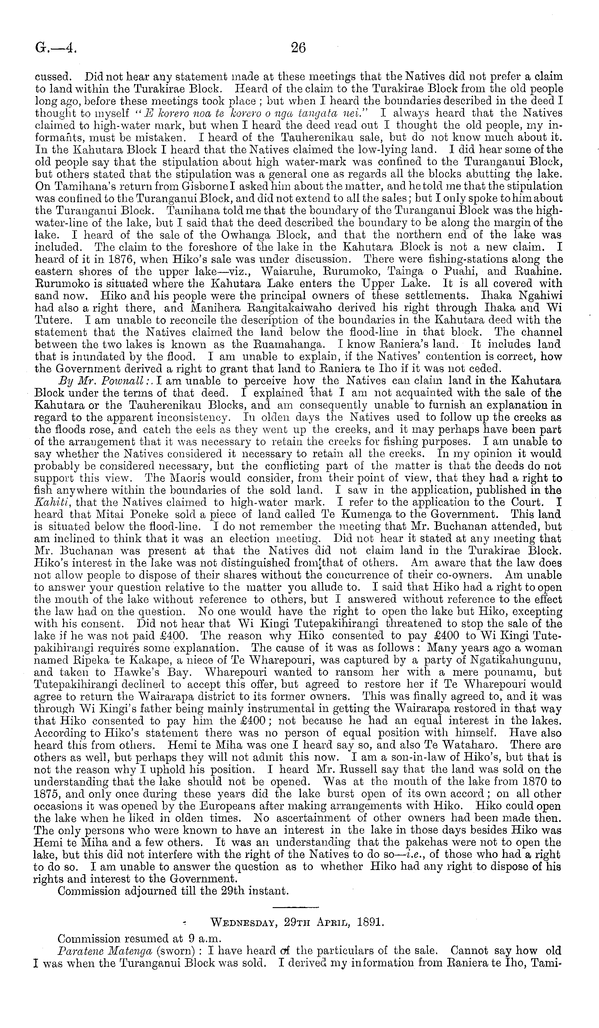 Wednesday, 29th Apbil, 1891. Commission resumed at 9 a.m. Paratene Matenga (sworn) : I have heard of the particulars of the sale. Cannot say how old I was when the Turanganui Block was sold. I derived my information from Eanierate Iho, Tami-