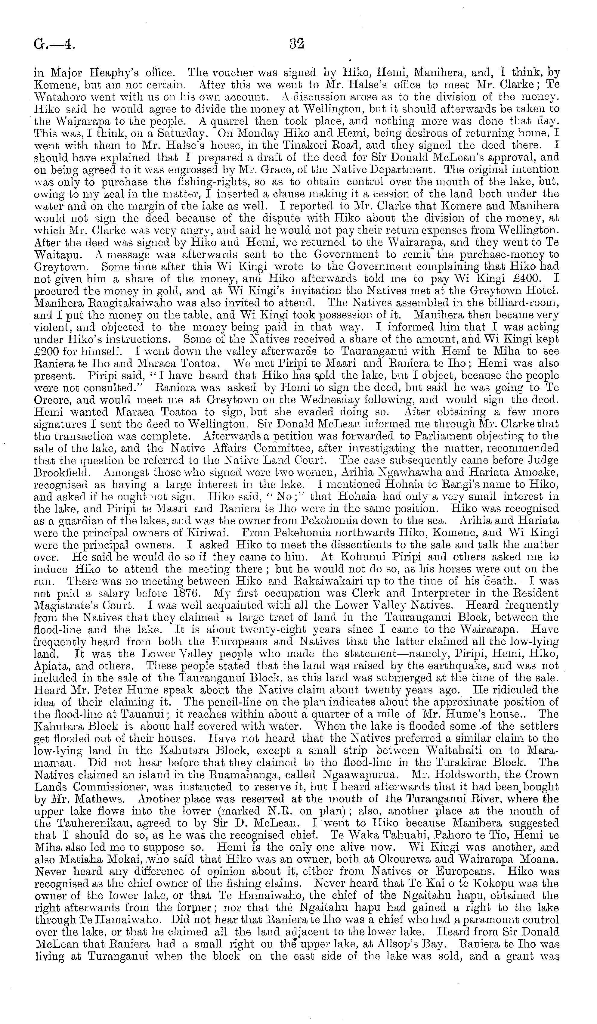 in Major Heaphy's office. The voucher was signed by Hiko, Hemi, Manihera, and, I think, by Komene, but am not certain. After this we went to Mr. Halse's office to meet Mr. Clarke; Te Watahoro went with us on his own account. A discussion arose as to the division of the money. Hiko said he would agree to divide the money at Wellington, but it should afterwards be taken to the Wairarapa to the people. A quarrel then took place, and nothing more was done that clay. This was, I think, on a Saturday. On Monday Hiko and Hemi, being desirous of returning home, I went with them to Mr. Halse's house, in the Tinakori Eoad, and they signed the deed there. I should have explained that I prepared a draft of the deed for Sir Donald McLean's approval, and on being agreed to it was engrossed by Mr. Grace, of the Native Department. The original intention was only to purchase the fishing-rights, so as to obtain control over the mouth of the lake, but, owing to my zeal in the matter, I inserted a clause, making it a cession of the land both under the water and on the margin of the lake as well. I reported to Mr. Clarke that Komere and Manihera would not sign the deed because of the dispute with Hiko about the division of the money, at which Mr. Clarke was very angry, and said he would not pay their return expenses from Wellington. After the deed was signed by Hiko and Hemi, we returned to the Wairarapa, and they went to Te Waitapu. A message was afterwards sent to the Government to remit the purchase-money to Greytown. Some time after this Wi Kingi wrote to the Government complaining that Hiko had not given him a share of the money, and Hiko afterwards told me to pay Wi Kingi £400. I procured the money in gold, and at Wi Kingi's invitation the Natives met at the Greytown Hotel. Manihera Eangitakaiwaho was also invited to attend. The Natives assembled in the billiard-room, and I put the money on the table, and Wi Kingi took possession of it. Manihera then became very violent, and objected to the money being paid in that way. I informed him that I was acting under Hiko's instructions. Some of the Natives received a share of the amount, and Wi Kingi kept £200 for himself. I went down the valley afterwards to Tauranganui with Hemi te Miha to see Eaniera te Iho and Maraea Toatoa. We met Piripi te Maari and Eaniera te Iho; Hemi was also present. Piripi said, "I have heard that Hiko has spld the lake, but I object, because the people were not consulted." Eaniera was asked by Hemi to sign the deed, but said he was going to Te Oreore, and would meet me at Greytown on the Wednesday following, and would sign the deed. Hemi wanted Maraea Toatoa to sign, but she evaded doing so. After obtaining a few more signatures I sent the deed to Wellington. Sir Donald McLean informed me through Mr. Clarke that the transaction was complete. Afterwards a petition was forwarded to Parliament objecting to the sale of the lake, and the Native Affairs Committee, after investigating the matter, recommended that the question be referred to the Native Land Court. The case subsequently came before Judge Brookfield. Amongst those who signed were two women, Arihia Ngawhawha and Hariata Amoake, recognised as having a large interest in the lake. I mentioned Hohaia te Eangi'sname to Hiko, and asked if he ought not sign. Hiko said, "No ;" that Hohaia had only a very small interest in the lake, and Piripi te Maari and Baniera te Iho were in the same position. Hiko was recognised as a guardian of the lakes, and was the owner from Pekehomia down to the sea. Arihia and Hariata were the principal owners of Kiriwai. From Pekehomia northwards Pliko, Komene, and Wi Kingi were the principal owners. I asked Hiko to meet the dissentients to the sale and talk the matter over. He said he would do so if they came to him. At Kohunui Piripi and others asked me to induce Hiko to attend the meeting there ; but he would not do so, as his horses were out on the run. There was no meeting between Hiko and Eakaiwakairi up to the time of his death. I was not paid a salary before 1876. My first occupation was Clerk and Interpreter in the Eesident Magistrate's Court. I was well acquainted with all the Low 7 er Valley Natives. Heard frequently from the Natives that they claimed a large tract of land in the Tauranganui Block, between the flood-line and the lake. It is about twenty-eight years since I came to the Wairarapa. Have frequently heard from both the Europeans and Natives that the latter claimed all the low-lying land. It was the Lower Valley people who made the statement—namely, Piripi, Hemi, Hiko, Apiata, and others. These people stated that the land was raised by the earthquake, and was not included in the sale of the Tauranganui Block, as this land was submerged at the time of the sale. Heard Mr. Peter Hume speak about the Native claim about twenty years ago. He ridiculed the idea of their claiming it. The pencil-line on the plan indicates about the approximate position of the flood-line at Tauanui; it reaches within about a quarter of a mile of Mr. Hume's house.. The Kahutara Block is about half covered with water. When the lake is flooded some .of the settlers get flooded out of their houses. Have not heard that the Natives preferred a similar claim to the low-lying land in the Kahutara Block, except a small strip between Waitahaiti on to Maramamau. Did not hear before that they claimed to the flood-line in the Turakirae Block. The Natives claimed an island in the Euamahanga, called Ngaawapurua. Mr. Holdsworth, the Crown Lands Commissioner, was instructed to reserve it, but I heard afterwards that it had been bought by Mr. Mathews. Another place was reserved at the mouth of the Turanganui Eiver, where the upper lake flows into the lower (marked N.E. on plan); also, another place at the mouth of the Tauherenikau, agreed to by Sir D. McLean. I went to Hiko because Manihera suggested that I should do so, as he was the recognised chief. Te Waka Tahuahi, Pahor