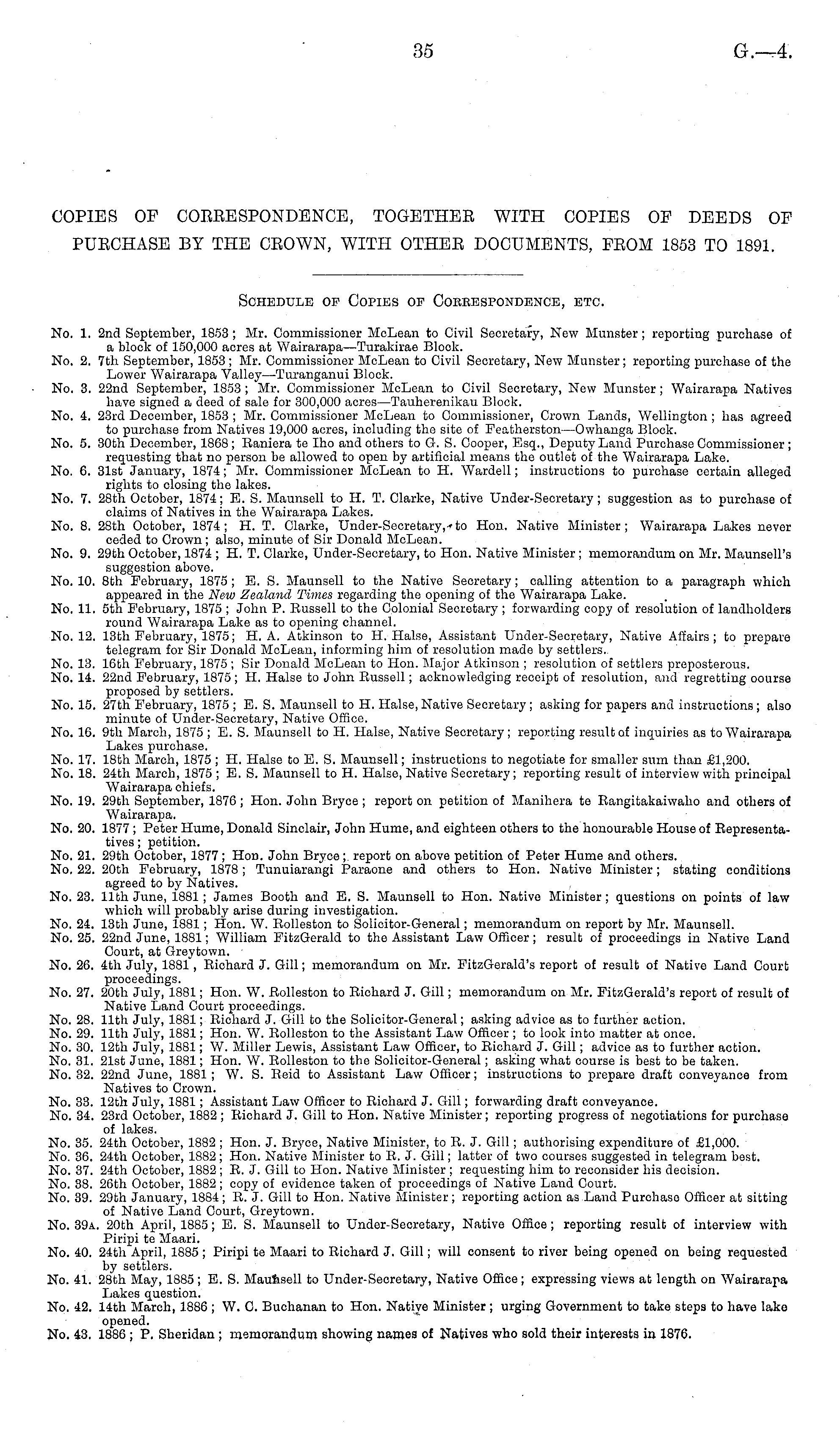 COPIES OP COEEESPONDENCE, TOGETHEE WITH COPIES OP DEEDS OP PDECHASE BY THE CEOWN, WITH OTHEE DOCUMENTS, FEOM 1853 TO 1891. Schedule of Copies op Coeeespondence, etc. No. 1. 2nd September, 1853 ; Mr. Commissioner McLean to Civil Secretary, New Munsfcer; reporting purchase of a block of 150,000 acres at Wairarapa—Turakirae Block. No. 2. 7th September, 1853; Mr. Commissioner McLean to Civil Secretary, New Minister; reporting purchase of the Lower Wairarapa Valley—Turanganui Block. No. 3. 22nd September, 1853 ; Mr. Commissioner McLean to Civil Secretary, New Mvinster ; Wairarapa Natives have signed a deed of sale for 300,000 acres—Tauherenikau Block. No. 4. 23rd December, 1853 ; Mr. Commissioner McLean to Commissioner, Crown Lands, Wellington ; has agreed to purchase from Natives 19,000 acres, including the site of Featherston—Owhanga Block. No. 5. 30th December, 1868; Raniera te Iho and others to G. S. Cooper, Esq., Deputy Land Purchase Commissioner ; requesting that no person be allowed to open by artificial means the outlet of the Wairarapa Lake. No. 6. 31st January, 1874; Mr. Commissioner McLean to H. Wardell; instructions to purchase certain alleged rights to closing the lakes. No. 7. 28th October, 1874; E. S. Maunsell to H. T. Clarke, Native Under-Secretary; suggestion as to purchase of claims of Natives in the Wairarapa Lakes. No. 8. 28th October, 1874; H. T. Clarke, Under-Secretary,'to Hon. Native Minister; Wairarapa Lakes never ceded to Crown; also, minute of Sir Donald McLean. No. 9. 29th October, 1874 ; H. T. Clarke, Under-Secretary, to Hon. Native Minister ; memorandum on Mr. Maunsell's suggestion above. No. 10. Bth February, 1875 ;E. S. Maunsell to the Native Secretary; calling attention to a paragraph which appeared in the New Zealand Times regarding the opening of the Wairarapa Lake. No. 11. sth February, 1875 ; John P. Eussell to the Colonial Secretary ; forwarding copy of resolution of landholders round Wairarapa Lake as to opening channel. No. 12. 13th February, 1875; H. A. Atkinson to H. Halse, Assistant Under-Secretary, Native Affairs; to prepare telegram for Sir Donald McLean, informing him of resolution made by settlers. No. 13. 16th February, 1875 ; Sir Donald McLean to Hon. Major Atkinson ; resolution of settlers preposterous. No. 14. 22nd February, 1875; H. Halse to John Eussell; acknowledging receipt of resolution, and regretting oourse proposed by settlers. No. 15. 27th February, 1875 ; E. S. Maunsell to H. Halse, Native Secretary ; asking for papers and instructions ; also minute of Under-Secretary, Native Office. No. 16. 9th March, 1875 ; E. S. Maunsell to H. Halse, Native Secretary; reporting result of inquiries as to Wairarapa Lakes purchase. No. 17. 18th March, 1875 ;H. Halse to E. S. Maunsell; instructions to negotiate for smaller sum than £1,200. No. 18. 24th March, 1875 ; E.S. Maunsell to H. Halse, Native Secretary; reporting result of interview with principal Wairarapa chiefs. No. 19. 29th September, 1876 ; Hon. John Bryce ; report on petition of Manihera te Rangitakaiwaho and others of Wairarapa. No. 20. 1877 ; Peter Hume, Donald Sinclair, John Hume, and eighteen others to the honourable House of Representatives ; petition. No. 21. 29th October, 1877 ; Hon. John Bryce ; report on above petition of Peter Hume and others. No. 22. 20th February, 1878 ; Tunuiarangi Paraone and others to Hon. Native Minister; stating conditions agreed to by Natives. No. 23. 11th June, 1881 ; James Booth and E. S. Maunsell to Hon. Native Minister; questions on points of law which will probably arise during investigation. No. 24. 13th June, 1881; Hon. W. Rolleston to Solicitor-General; memorandum on report by Mr. Maunsell. No. 25. 22nd June, 1881; William FitzGerald to the Assistant Law Officer; result of proceedings in Native Land Court, at Greytown. No. 26. 4th July, 1881 , Richard J. Gill; memorandum on Mr. FitzGerald's report of result of Native Land Court proceedings. No. 27. 20th July, 1881; Hon. W. ftolleston to Richard J. Gill; memorandum on Mr. FitzGerald's report of result of Native Land Court proceedings. No. 28. 11th July, 1881; Richard J. Gill to the Solicitor-General; asking advice as to further action. No. 29. 11th July, 1881; Hon. W. Rolleston to the Assistant Law Officer ;to look into matter at once. No. 30. 12th July, 1881; W. Miller Lewis, Assistant Law Officer, to Richard J. Gill; advice as to further action. No. 81. 21st June, 1881; Hon. W. Rolleston to the Solicitor-General; asking what course is best to be taken. No. 32. 22nd June, 1881 ;W. S. Reid to Assistant Law Officer; instructions to prepare draft conveyance from Natives to Crown. No. 33. 12th July, 1881; Assistant Law Officer to Richard J. Gill; forwarding draft conveyance. No. 34. 23rd October, 1882 ; Richard J. Gill to Hon. Native Minister; reporting progress of negotiations for purchase of lakes. No. 35. 24th October, 1882 ; Hon. J. Bryce, Native Minister, to R. J. Gill; authorising expenditure of £1,000. No. 36. 24th October, 1882 ; Hon. Native Minister to R. J. Gill; latter of two courses suggested in telegram best. No. 37. 24th October, 1882 ; R. J. Gill to Hon. Native Minister ; requesting him to reconsider his decision. No. 38. 26th October, 1882 ; copy of evidence taken of proceedings of Native Land Court. No. 39. 29th January, 1884; R. J. Gill to Hon. Native Minister; reporting action as Land Purchase Officer at sitting of Native Land Court, Greytown. No. 39a. 20th April, 1885; E. S. Maunsell to Under-Secretary, Native Office; reporting result of interview with Piripi te Maari. No. 40. 24th April, 1885; Piripi te Maari to Richard J. Gill; will consent to river being opened on being requested by settlers. No. 41. 28th May, 1885 ; E. S. Maunsell to Under-Secretary, Native Office ; expressing views at length on Wairarapa Lakes question. No. 42. 14th March, 1886 ; W. C. Buchanan to Hon. Native Minister ; urging Government to take steps to have lake opened. No. 43. 1886 ; P. Sheridan 