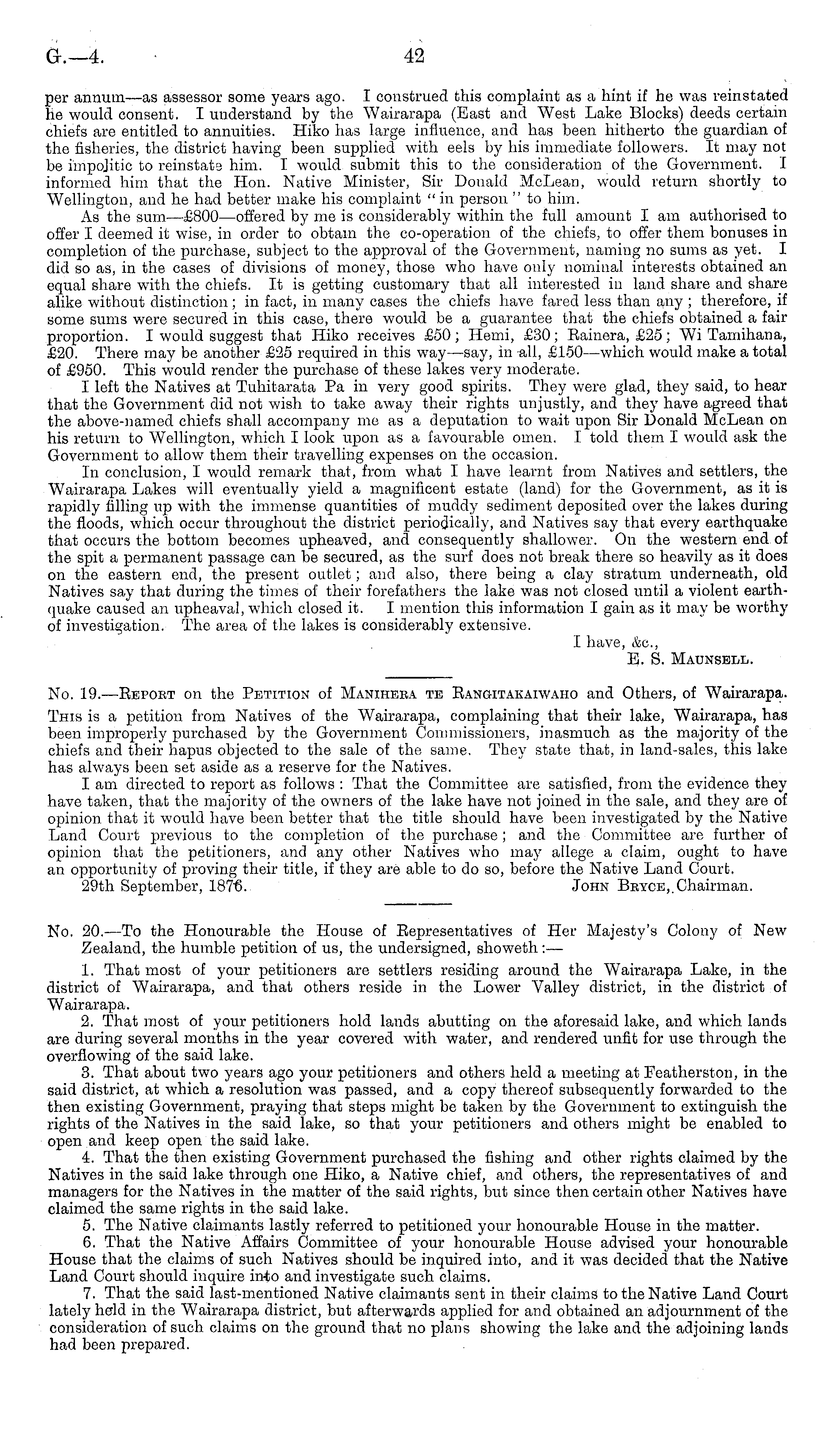 No. 20.—T0 the Honourable the House of Eepresentatives of Her Majesty's Colony of New Zealand, the humble petition of us, the undersigned, showeth : — 1. That most of your petitioners are settlers residing around the Wairarapa Lake, in the district of Wairarapa, and that others reside in the Lower Valley district, in the district of Wairarapa. 2. That most of your petitioners hold lands abutting on the aforesaid lake, and which lands are during several months in the year covered with water, and rendered unfit for use through the overflowing of the said lake. 3. That about two years ago your petitioners and others held a meeting at Featherston, in the said district, at which a resolution was passed, and a copy thereof subsequently forwarded to the then existing Government, praying that steps might be taken by the Government to extinguish the rights of the Natives in the said lake, so that your petitioners and others might be enabled to open and keep open the said lake. 4. That the then existing Government purchased the fishing and other rights claimed by the Natives in the said lake through one Hiko, a Native chief, and others, the representatives of and managers for the Natives in the matter of the said rights, but since then certain other Natives have claimed the same rights in the said lake. 5. The Native claimants lastly referred to petitioned your honourable House in the matter. 6. That the Native Affairs Committee of your honourable House advised your honourable House that the claims of such Natives should be inquired into, and it was decided that the Native Land Court should inquire into and investigate such claims. 7. That the said last-mentioned Native claimants sent in their claims to the Native Land Court lately held in the Wairarapa district, but afterwards applied for and obtained an adjournment of the consideration of such claims on the ground that no plans showing the lake and the adjoining lands had been prepared.