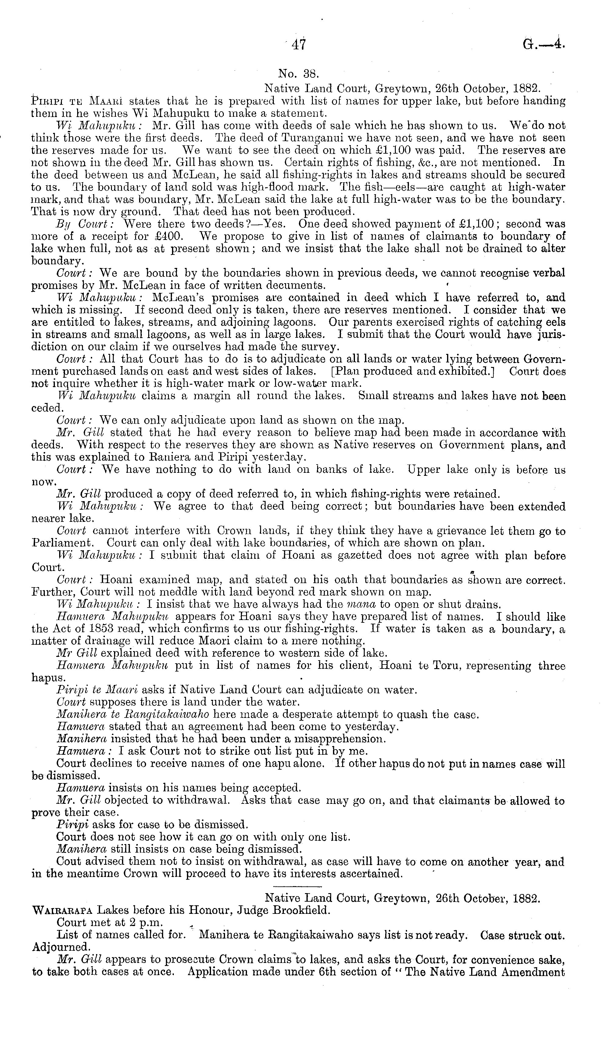 No. 38. Native Land Court, Greyfcown, 26th October, 1882. Piripi te Maabl states that he is prepared with list of names for upper lake, but before handing them in he wishes Wi Mahupuku to make a statement. Wi Mahupuku : Mr. Gill has come with deeds of sale which he has shown to us. We'do not think those were the first deeds. The deed of Turanganui we have not seen, and we have not seen the reserves made for us. We want to see the deed on which £1,100 was paid. The reserves are not shown in the deed Mr. Gill has shown us. Certain rights of fishing, &c., are not mentioned. In the deed between us and McLean, he said all fishing-rights in lakes and streams should be secured to us. The boundary of land sold was high-flood mark. The fish—eels—are caught at high-water mark, and that was boundary, Mr. McLean said the lake at full high-water was to be the boundary. That is now dry ground. That deed has not been produced. By Court: Were there two deeds?— Yes. One deed showed payment of £1,100 ; second was more of a receipt for £400. We propose to give in list of names of claimants to boundary of lake when full, not as at present shown; and we insist that the lake shall not be drained to alter boundary. Court: We are bound by the boundaries shown in previous deeds, we cannot recognise verbal promises by Mr. McLean in face of written decuments. Wi Mahupwku : McLean's promises are contained in deed which I have referred to, and which is missing. If second deed only is taken, there are reserves mentioned. I consider that we are entitled to lakes, streams, and adjoining lagoons. Our parents exercised rights of catching eels in streams and small lagoons, as well as in large lakes. I submit that the Court would have jurisdiction on our claim if we ourselves had made the survey. Court: All that Court has to do is to adjudicate on all lands or water lying between Government purchased lands on east and west sides of lakes. [Plan produced and exhibited.] Court does not inquire whether it is high-water mark or low-water mark. Wi Mahupuku, claims a margin all round the lakes. Small streams and lakes have not been ceded. Court: We can only adjudicate upon land as shown on the map. Mr. Gill stated that he had every reason to believe map had been made in accordance with deeds. With respect to the reserves they are shown as Native reserves on Government plans, and this was explained to Eaniera and Piripi yesterday. Court: We have nothing to do with land on banks of lake. Upper lake only is before us now. Mr. Gill produced a copy of deed referred to, in which fishing-rights were retained. Wi Mahupuku : We agree to that deed being correct; but boundaries have been extended nearer lake. Court cannot interfere with Crown lauds, if they think they have a grievance let them go to Parliament. Court can only deal with lake boundaries, of which are shown on plan. Wi Mahupuku : I submit that claim of Hoani as gazetted does not agree with plan before Court. Court: Hoani examined map, and stated on his oath that boundaries as shown are correct. Further, Court will not meddle with land beyond red mark shown on map. Wi Mahupuku : I insist that we have always had the viana to open or shut drains. Hamuera Mahupuku appears for Hoani says they have prepared list of names. I should like the Act of 1853 read, which confirms to us our fishing-rights. If water is taken as a boundary, a matter of drainage will reduce Maori claim to a mere nothing. Mr Gill explained deed with reference to western side of lake. Hamuera Mahupuku put in list of names for his client, Hoani te Toru, representing three hapus. Piripi te Mauri asks if Native Land Court can adjudicate on water. Court supposes there is land under the water. Manihera te Hangitakaiwaho here made a desperate attempt to quash the case. Hamuera stated that an agreement had been come to yesterday. Manihera insisted that he had been under a misapprehension. Hamuera: I ask Court not to strike out list put in by me. Court declines to receive names of one hapu alone. If other hapus do not put in names case will be dismissed. Hamuera insists on his names being accepted. Mr. GUI objected to withdrawal. Asks that case may go on, and that claimants be allowed to prove their case. Piripi asks for case to be dismissed. Court does not see how it can go on with only one list. Manihera still insists on case being dismissed. Cout advised them not to insist on withdrawal, as case will have to come on another year, and in the meantime Crown will proceed to have its interests ascertained.