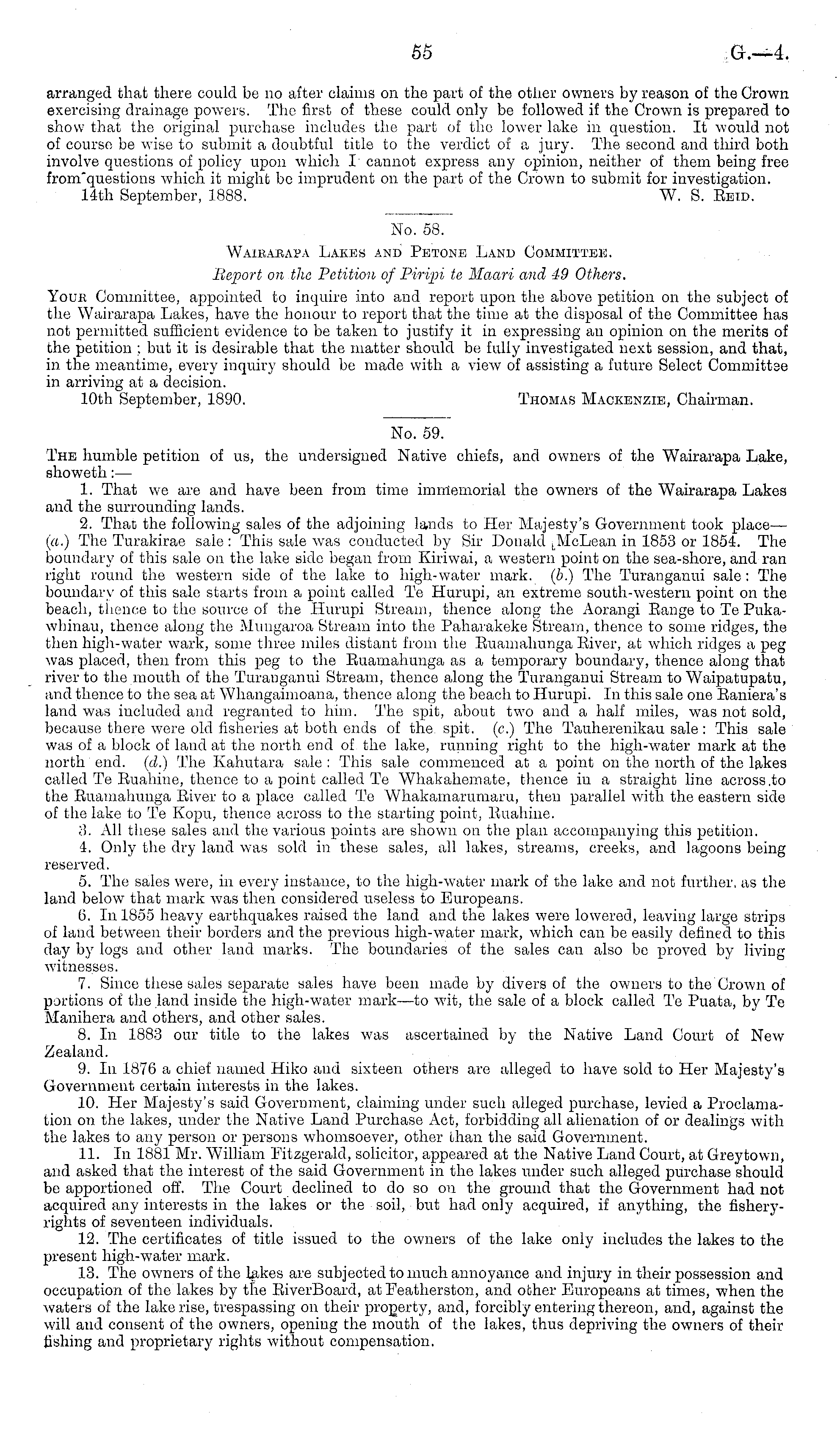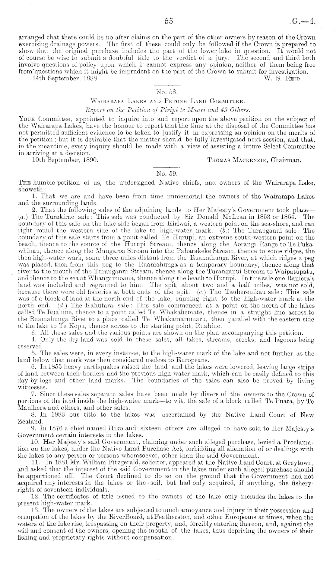 No. 59. The humble petition of us, the undersigned Native chiefs, and owners of the Wairarapa Lake, showeth:— 1. That we are and have been from time imm'einorial the owners of the Wairarapa Lakes and the surrounding lands. 2. That the following sales of the adjoining lands to Her Majesty's Government took place— (a.) The Turakirae sale: This sale was conducted by Sir Donald L McLean in 1853 or 1854. The boundary of this sale on the lake side began from Kiriwai, a western point on the sea-shore, and ran right round the western side of the lake to high-water mark, (b.) The Turanganni sale : The boundary of this sale starts from a point called Te Hurupi, an extreme south-western point on the beach, thence to the source of the Hurupi Stream, thence along the Aorangi Bange to Te Pukawbinau, thence along the Mungaroa Stream into the Paharakeke Stream, thence to some ridges, the then high-water wark, some three miles distant from the Euamahunga River, at which ridges a peg was placed, then from this peg to the Euamahuuga as a temporary boundary, thence along that river to the mouth of the Turanganui Stream, thence along the Turanganui Stream to Waipatupatu, and thence to the sea at Whangahnoana, thence along the beach to Hurupi. In this sale one Eaniera's laud was included and regranted to him. The spit, about two and a half miles, was not sold, because there were old fisheries at both ends of the. spit, (c.) The Tauherenikau sale : This sale was of a block of land at the north end of the lake, running right to the high-water mark at the north end. (d.) The Kahutara sale : This sale commenced at a point on the north of the lakes called Te Euahine, thence to a point called Te Whakahemate, thence in a straight line across .to the Euamahunga Eiver to a place called Te Whakamarumaru, then parallel with the eastern side of the lake to Te Kopu, thence across to the starting point, Euahine. 3. All these sales and the various points are shown on the plan accompanying this petition. 4. Only the dry land was sold in these sales, all lakes, streams, creeks, and lagoons being reserved. 5. The sales were, in every instance, to the high-water mark of the lake and not further, as the laud below that mark was then considered useless to Europeans. (5. In 1855 heavy earthquakes raised the land and the lakes were lowered, leaving large strips of land between their borders and the previous high-water mark, which can be easily defined to this day by logs and other land marks. The boundaries of the sales can also be proved by living witnesses. 7. Since these sales separate sales have been made by divers of the owners to the Crown of portions of the land inside the high-water mark —to wit, the sale of a block called Te Puata, by Te Manihera and others, and other sales. 8. In 1883 our title to the lakes was ascertained by the Native Land Court of New Zealand. 9. In 1876 a chief named Hiko and sixteen others are alleged to have sold to Her Majesty's Government certain interests in the lakes. 10. Her Majesty's said Government, claiming under such alleged purchase, levied a Proclamation on the lakes, under the Native Land Purchase Act, forbidding all alienation of or dealings with the lakes to any person or persons whomsoever, other than the said Government. 11. In 1881 Mr. William Fitzgerald, solicitor, appeared at the Native Land Court, at Greytown, and asked that the interest of the said Government in the lakes under such alleged purchase should be apportioned off. The Court declined to do so on the ground that the Government had not acquired any interests in the lakes or the soil, but had only acquired, if anything, the fisheryrights of seventeen individuals. 12. The certificates of title issued to the owners of the lake only includes the lakes to the present high-water mark. 13. The owners of the Likes are subjected to much annoyance and injury in their possession and occupation of the lakes by the Eiverßoard, at Featherston, and other Europeans at times, when the waters of the lake rise, trespassing on their property, and, forcibly entering thereon, and, against the will and consent of the owners, opening the mouth of the lakes, thus depriving the owners of their fishing and proprietary rights without compensation.