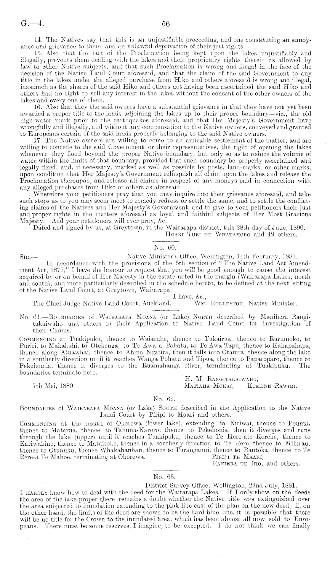 14. The Natives say that this is an unjustifiable proceeding, and one constituting an annoyance and grievance to them, and an unlawful deprivation of their just rights. 15. Also that the fact of the Proclamation being kept upon the lakes unjustifiably and illegally, prevents them dealing with the lakes and their proprietary rights therein as allowed by law to other Native subjects, and that such Proclamation is wrong and illegal in the face of the decision of the Native Land Court aforesaid, and that the claim of the said Government to any title in the lakes under the alleged purchase from Hiko and others aforesaid is wrong and illegal, inasmuch as the shares of the said Hiko and others not having been ascertained the said Hiko and others had no right to sell any interest in the lakes without the consent of the other owners of the lakes and every one of them. 16. Also that they the said owners have a substantial grievance in that they have not yet been awarded a proper title to the lands adjoining the lakes up to their proper boundary—viz., the old high-water mark prior to the earthquakes aforesaid, and that Her Majesty's Government have wrongfully and illegally, and without any compensation to the Native owners, conveyed and granted to Europeans certain of the said lands properly belonging to the said Native owners. 17. The Native owners are willing to come to an amicable settlement of the matter, and are willing to concede to the said Government, or their representatives, the right of opening the lakes whenever they flood beyond the proper Native boundary, but only so as to reduce the volume of water within the limits of that boundary, provided that such boundary be properly ascertained and legally fixed, and, if necessary, marked as well as possible by posts, laud-marks, or other marks, upon condition that Her Majesty's' Government relinquish all claim upon the lakes and release the Proclamation thereupon, and release all claims in respect of any moneys paid in connection with any alleged purchases from Hiko or others as aforesaid. Wherefore your petitioners pray that you may inquire into their grievance aforesaid, and take such steps as to you may seem meet to remedy redress or settle the same, and to settle the conflicting claims of the Natives and Her Majesty's Government, and to give to your petitioners their just and proper rights in the matters aforesaid as loyal and faithful subjects of Her Most Gracious Majesty. And your petitioners will ever pray, etc. Dated and signed by us, at Greytown, in the Wairarapa district, this 28th day of June, 1890. Hoani Turi te Whatahoro and 49 others.