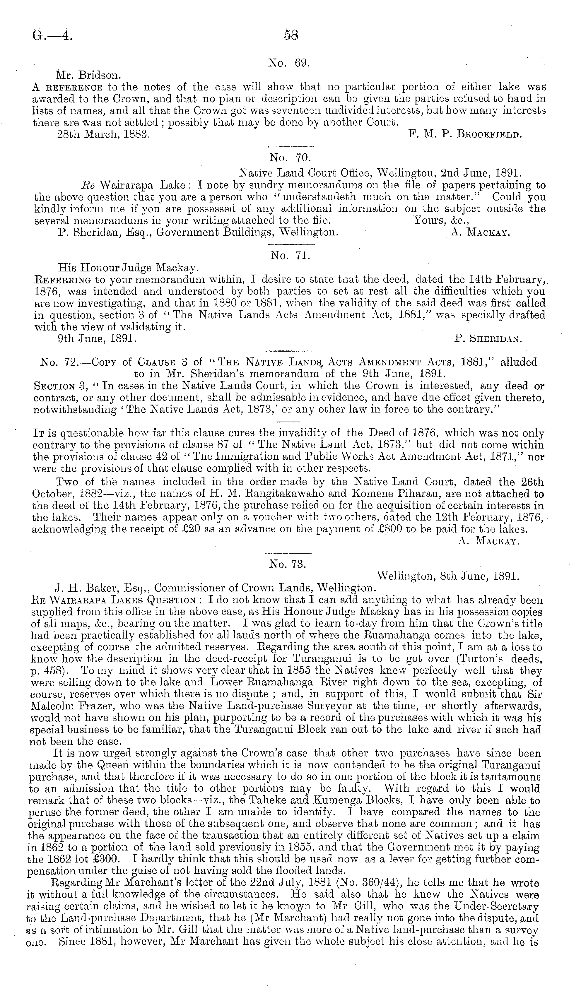 No. 71. His Honour Judge Mackay. Befeebing to your memorandum within, I desire to state tnat the deed, dated the 14th February, 1876, was intended and understood by both parties to set at rest all the difficulties which you are now investigating, and that in 1880 or 1881, when the validity of the said deed was first called in question, section 3 of "The Native Lands Acts Amendment Act, 1881," was specially drafted with the view of validating it. 9th June, 1891. P. Shebidan.