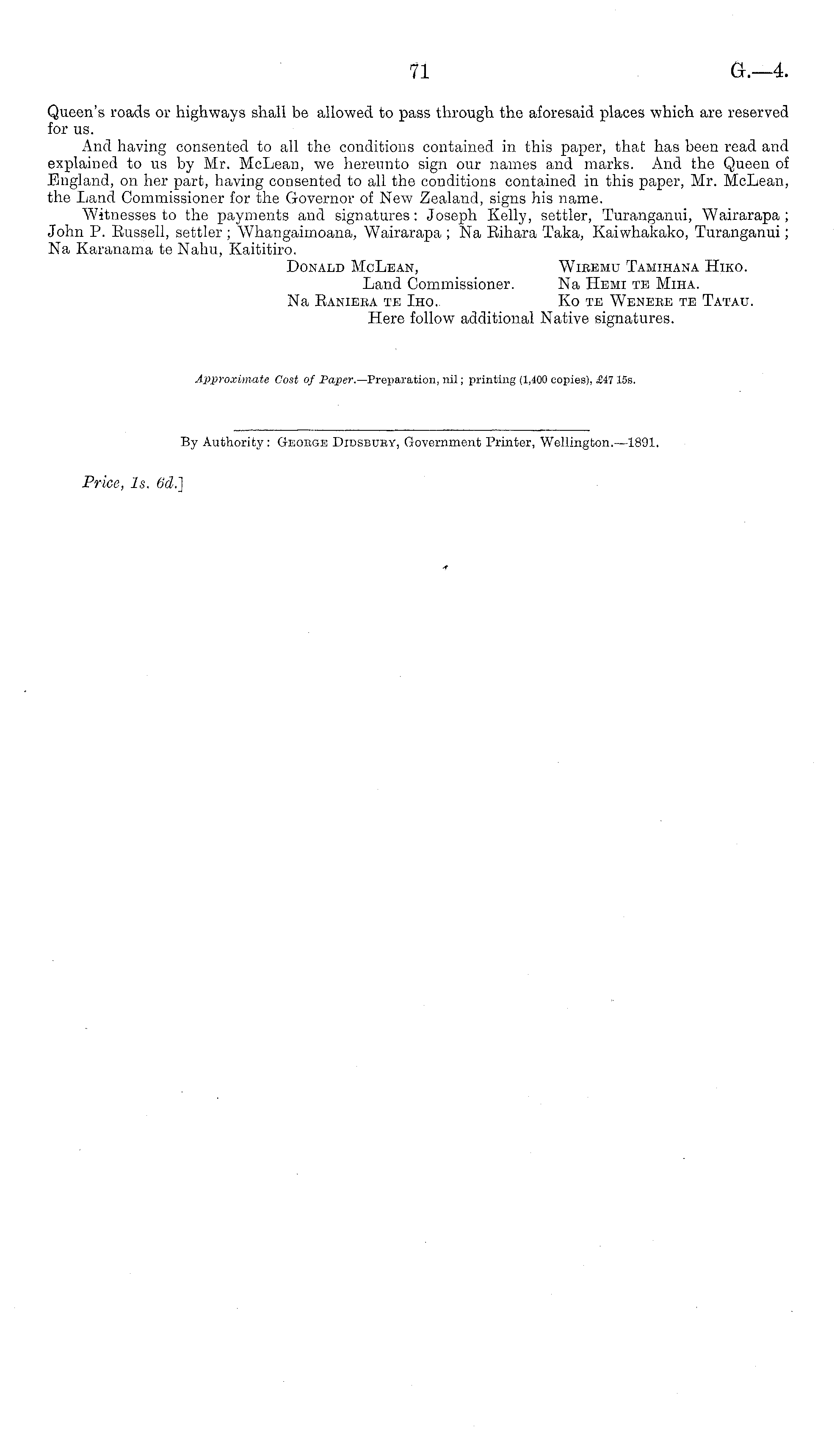 Queen's roads or highways shall bo allowed to pass through the aforesaid places which are reserved for us. And having consented to all the conditions contained in this paper, that has been read and explained to us by Mr. McLean, we hereunto sign our names and marks. And the Queen of England, on her part, having consented to all the conditions contained in this paper, Mr. McLean, the Land Commissioner for the Governor of New Zealand, signs his name. Witnesses to the payments and signatures : Joseph Kelly, settler, Turanganui, Wairarapa ; John P. Eussell, settler ; Whangaimoana, Wairarapa ; Na Eihara Taka, Kaiwhakako, Turanganui; Na Karanama te Nahu, Kaititiro. Donald McLean, Wihemu Tamihana Hiko. Land Commissioner. Na Hemi te Miha. Na Eanieka te Iho. Ko te Wenebe te Tatau. Here follow additional Native signatures. Approximate Cost of Paper. —Preparation, nil; printing (1,400 copies), .£47 15s. By Authority: George Didsbuky, Government Printer, Wellington.—lß9l. Price, Is. 6d.]