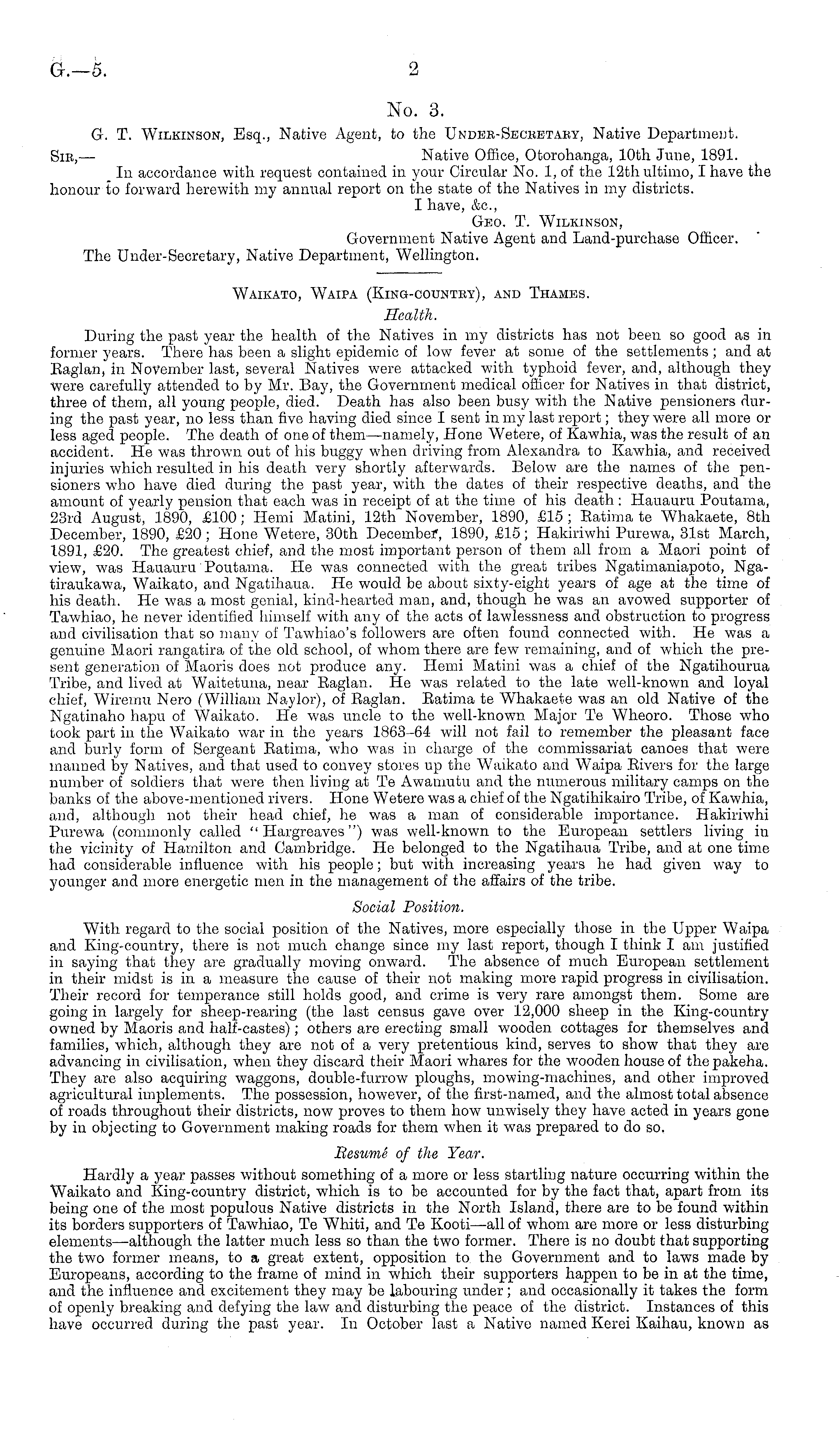 No. 3. G. T. Wilkinson, Esq., Native Agent, to the Undek-Secketary, Native Department. Sic, — Native Office, Otorohanga, 10th June, 1891. In accordance with request contained in your Circular No. 1, of the 12th ultimo, I have the honour to forward herewith my annual report on the state of the Natives in my districts. I have, &c, Geo. T. Wilkinson, Government Native Agent and Land-purchase Officer. The Under-Secretary, Native Department, Wellington.