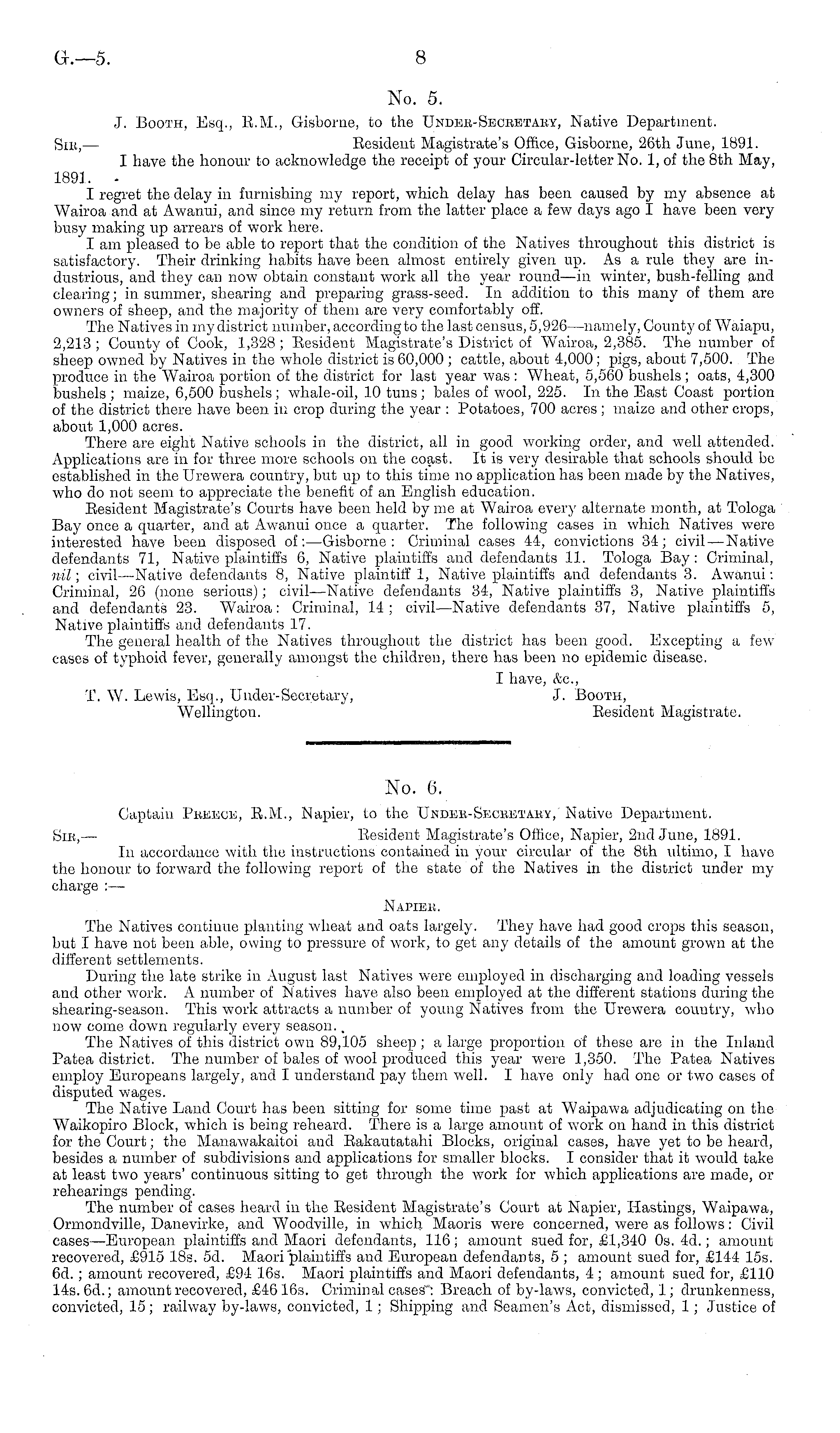 No. 5. J. Booth, Esq., E.M., Gisborne, to the Under-Seobetaky, Native Department. Sns, — Resident Magistrate's Office, Gisborne, 26th June, 1891. I have the honour to acknowledge the receipt of your Circular-letter No. 1, of the Bth May, 1891. - I regret the delay in furnishing my report, which delay has been caused by my absence at Wairoa and at Awanui, and since my return from the latter place a few days ago I have been very busy making up arrears of work here. I am pleased to be able to report that the condition of the Natives throughout this district is satisfactory. Their drinking habits have been almost entirely given up. As a rule they are industrious, and they can now obtain constant work all the year round —in winter, bush-felling and clearing; in summer, shearing and preparing grass-seed. In addition to this many of them are owners of sheep, and the majority of them are very comfortably off. The Natives in my district number, according to the last census, 5,926 —namely, County of Waiapu, 2,213 ; County of Cook, 1,328 ; Eesident Magistrate's District of Wairoa, 2,385. The number of sheep owned by Natives in the whole district is 60,000 ; cattle, about 4,000; pigs, about 7,500. The produce in the Wairoa portion of the district for last year was : Wheat, 5,560 bushels ; oats, 4,300 bushels; maize, 6,500 bushels; whale-oil, 10 tuns; bales of wool, 225. In the East Coast portion of the district there have been in crop during the year : Potatoes, 700 acres ; maize and other crops, about 1,000 acres. There are eight Native schools in the district, all in good working order, and well attended. Applications are in for three more schools on the coast. It is very desirable that schools should be established in the Urewera country, but up to this time no application has been made by the Natives, who do not seem to appreciate the benefit of an English education. Resident Magistrate's Courts have been held by me at Wairoa every alternate month, at Tologa Bay once a quarter, and at Awanui once a quarter. The following cases in which Natives were interested have been disposed of: —Gisborne: Criminal cases 44, convictions 34; civil — Native defendants 71, Native plaintiffs 6, Native plaintiffs and defendants 11. Tologa Bay : Criminal, nil ; civil—Native defendants 8, Native plaintiff 1, Native plaintiffs and defendants 3. Awanui: Criminal, 26 (none serious); civil—Native defendants 34, Native plaintiffs 3, Native plaintiff's and defendants 23. Wairoa: Criminal, 14 ; civil —Native defendants 37, Native plaintiffs 5, Native plaintiffs and defendants 17. The general health of the Natives throughout the district has been good. Excepting a few cases of typhoid fever, generally amongst the children, there has been no epidemic disease. I have, &c, T. W. Lewis, Esq., Under-Secretary, J. Booth, Wellington. Resident Magistrate.