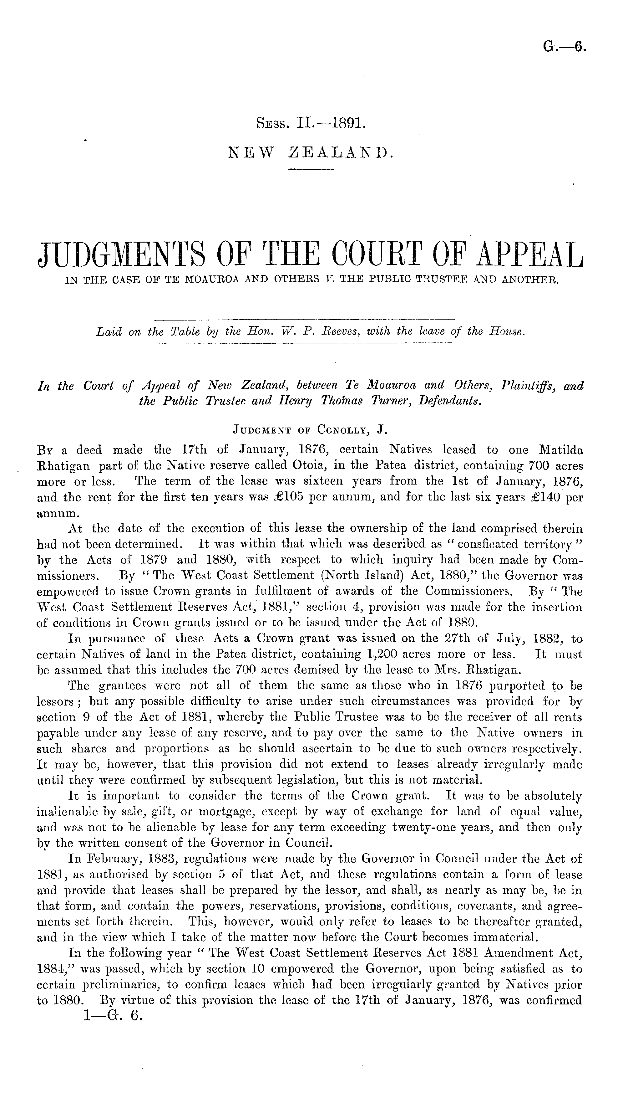 In the Court of Appeal of New Zealand, between Te Moauroa and Others, Plaintiffs, and the Public Trustee and Henry Thomas Turner, Defendants. Judgment of Ccnolly, J. By a deed made the 17th of January, 1876, certain Natives leased to one Matilda Rhatigan part of the Native reserve called Otoia, in the Patea district, containing 700 acres more or less. The term of the lease was sixteen years from the Ist of January, 1876, and the rent for the first ten years was £105 per annum, and for the last six years £140 per annum. At the date of the execution of this lease the ownership of the land comprised therein had not been determined. It was within that which was described as " consfieated territory " by the Acts of 1879 and 1880, with respect to which inquiry had been made by Commissioners. By " The West Coast Settlement (North Island) Act, 1880," the Governor was empowered to issue Crown grants in fulfilment of awards of the Commissioners. By " The West Coast Settlement Reserves Act, 1881," section 4, provision was made for the insertion of conditions in Crown grants issued or to be issued under the Act of 1880. In pursuance of these Acts a Crown grant was issued on the 27th of July, 1882, to certain Natives of land in the Patea district, containing 1,200 acres more or less. It must be assumed that this includes the 700 acres demised by the lease to Mrs. Rhatigan. The grantees were not all of them the same as those who in 1876 purported to be lessors ; but any possible difficulty to arise under such circumstances was provided for by section 9 of the Act of 1881, whereby the Public Trustee was to be the receiver of all rents payable under any lease of any reserve, and to pay over the same to the Native owners in such shares and proportions as he should ascertain to be due to such owners respectively. It may be, however, that this provision did not extend to leases already irregularly made until they were confirmed by subsequent legislation, but this is not material. It is important to consider the terms of the Crown grant. It was to be absolutely inalienable by sale, gift, or mortgage, except by way of exchange for land of equal value, and was not to be alienable by lease for any term exceeding twenty-one years, and then only by the written consent of the Governor in Council. In February, 1883, regulations were made by the Governor in Council under the Act of 1881, as authorised by section 5 of that Act, and these regulations contain a form of lease and provide that leases shall be prepared by the lessor, and shall, as nearly as may be, be in that form, and contain the powers, reservations, provisions, conditions, covenants, and agreements set forth therein. This, however, would only refer to leases to be thereafter granted, and in the view which I take of the matter now before the Court becomes immaterial. In the following year " The West Coast Settlement Reserves Act 1881 Amendment Act, 1884," was passed, which by section 10 empowered the Governor, upon being satisfied as to certain preliminaries, to confirm leases which had" been irregularly granted by Natives prior to 1880. By virtue of this provision the lease of the 17th of January, 1876, was confirmed l—a. 6.