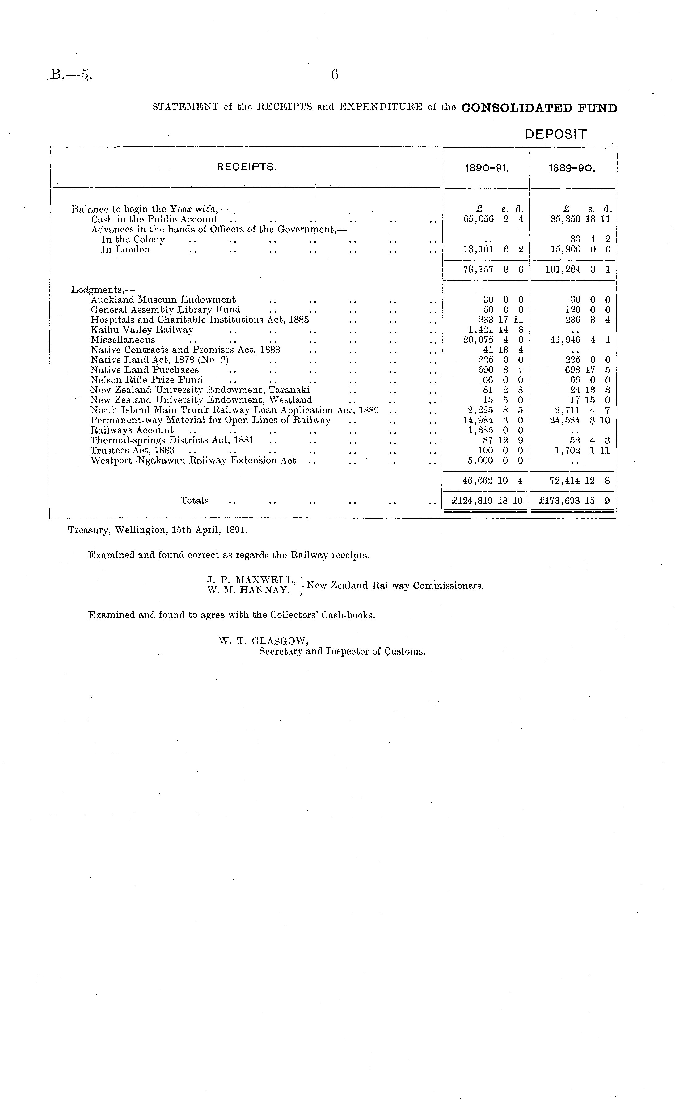 Treasur}', Wellington, 15th April, 1891. Examined and found correct as regards the Railway receipts. J. P. MAXWELL, } „ „ , ,„ .. „ W M HANNAY ,-New Zealand Railway Commissioners. Examined and found to agree with the Collectors' Cash-books. W. T. GLASGOW, Secretary and Inspector of Customs.