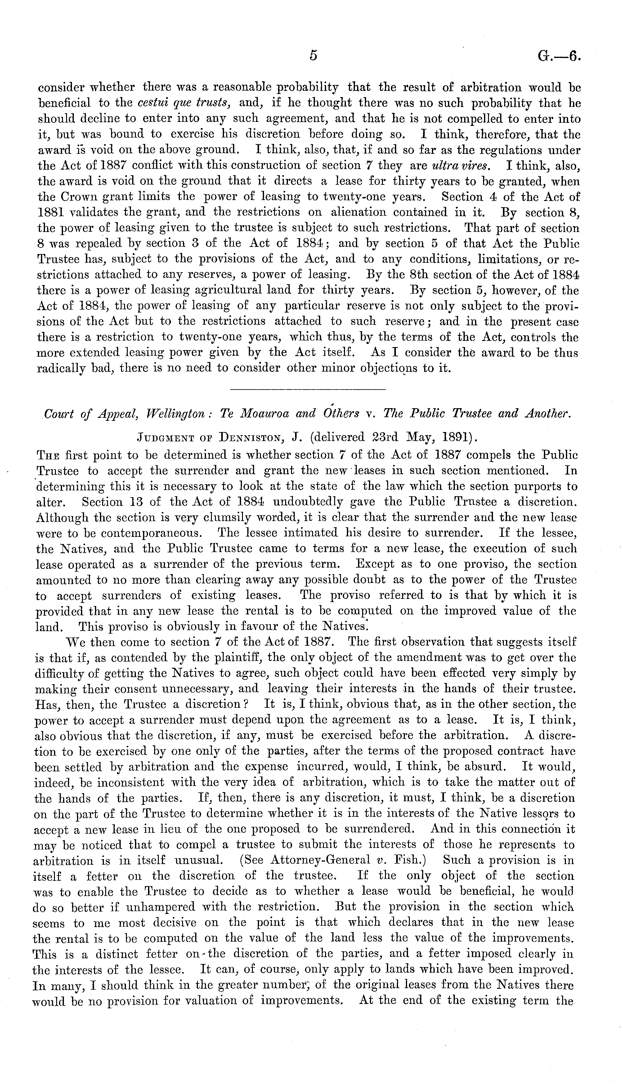 Court of Appeal, Wellington : Te Moauroa and Others v. The Public Trustee and Another. Judgment or Denniston, J. (delivered 23rd May, 1891). The first point to be determined is whether section 7 of the Act of 1887 compels the Public Trustee to accept the surrender and grant the new leases in such section mentioned. In determining this it is necessary to look at the state of the law which the section purports to alter. Section 13 of the Act of 1884 undoubtedly gave the Public Trustee a discretion. Although the section is very clumsily worded, it is clear that the surrender and the new lease were to be contemporaneous. The lessee intimated his desire to surrender. If the lessee, the Natives, and the Public Trustee came to terms for a new lease, the execution of such lease operated as a surrender of the previous term. Except as to one proviso, the section amounted to no more than clearing away any possible doubt as to the power of the Trustee to accept surrenders of existing leases. The proviso referred to is that by which it is provided that in any new lease the rental is to be computed on the improved value of the land. This proviso is obviously in favour of the Natives. "We then come to section 7of the Act of 1887. The first observation that suggests itself is that if, as contended by the plaintiff, the only object of the amendment was to get over the difficulty of getting the Natives to agree, such object could have been effected very simply by making their consent unnecessary, and leaving their interests in the hands of their trustee. Has, then, the Trustee a discretion ? It is, I think, obvious that, as in the other section, the power to accept a surrender must depend upon the agreement as to a lease. It is, I think, also obvious that the discretion, if any, must be exercised before the arbitration. A discretion to be exercised by one only of the parties, after the terms of the proposed contract have been settled by arbitration and the expense incurred, would, I think, be absurd. It would, indeed, be inconsistent with the very idea of arbitration, which is to take the matter out of the hands of the parties. If, then, there is any discretion, it must, I think, be a discretion on the part of the Trustee to determine whether it is in the interests of the Native lessors to accept a new lease in lieu of the one proposed to be surrendered. And in this connection it may be noticed that to compel a trustee to submit the interests of those he represents to arbitration is in itself unusual. (See Attorney-General v. Fish.) Such a provision is in itself a fetter on the discretion of the trustee. If the only object of the section was to enable the Trustee to decide as to whether a lease would be beneficial, he would do so better if unhampered with the restriction. But the provision in the section whiclv seems to me most decisive on the point is that which declares that in the new lease the rental is to be computed on the value of the land less the value of the improvements. This is a distinct fetter on • the discretion of the parties, and a fetter imposed clearly in the interests of the lessee. It can, of course, only apply to lands which have been improved. In many, I should think in the greater number, of the original leases from the Natives there would be no provision for valuation of improvements. At the end of the existing term the