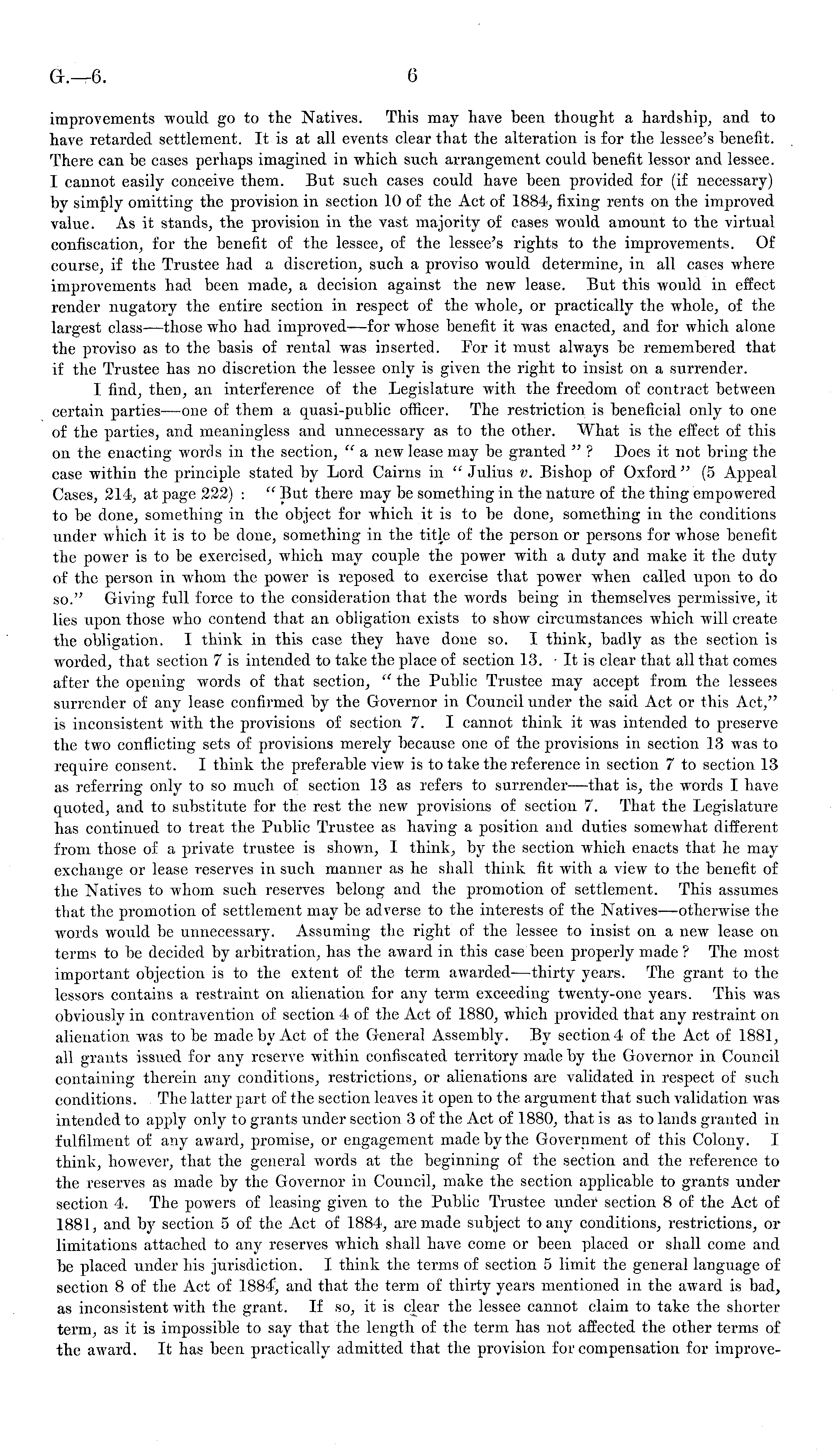 improvements would go to the Natives. This may have been thought a hardship, and to have retarded settlement. It is at all events clear that the alteration is for the lessee's benefit. There can be cases perhaps imagined in which such arrangement could benefit lessor and lessee. I cannot easily conceive them. But such cases could have been provided for (if necessary) by simply omitting the provision in section 10 of the Act of 1884, fixing rents on the improved value. As it stands, the provision in the vast majority of cases would amount to the virtual confiscation, for the benefit of the lessee, of the lessee's rights to the improvements. Of course, if the Trustee had a discretion, such a proviso would determine, in all cases where improvements had been made, a decision against the new lease. But this would in effect render nugatory the entire section in respect of the whole, or practically the whole, of the largest class —those who had improved-—for whose benefit it was enacted, and for which alone the proviso as to the basis of rental was inserted. For it must always be remembered that if the Trustee has no discretion the lessee only is given the right to insist on a surrender. I find, then, an interference of the Legislature with the freedom of contract between certain parties —one of them a quasi-public officer. The restriction is beneficial only to one of the parties, and meaningless and unnecessary as to the other. What is the effect of this on the enacting words in the section, " a new lease may be granted " ? Does it not bring the case within the principle stated by Lord Cairns in " Julius v. Bishop of Oxford" (5 Appeal Cases, 214, at page 222) : " But there may be something in the nature of the thing empowered to be done, something in the object for which it is to be done, something in the conditions under which it is to be done, something in the title of the person or persons for whose benefit the power is to be exercised, which may couple the power with a duty and make it the duty of the person in w rhom the power is reposed to exercise that power when called upon to do so." Giving full force to the consideration that the words being in themselves permissive, it lies upon those who contend that an obligation exists to show circumstances which will create the obligation. I think in this case they have done so. I think, badly as the section is worded, that section 7 is intended to take the place of section 13. • It is clear that all that comes after the opening words of that section, " the Public Trustee may accept from the lessees surrender of any lease confirmed by the Governor in Council under the said Act or this Act," is inconsistent with the provisions of section 7. I cannot think it was intended to preserve the two conflicting sets of provisions merely because one of the provisions in section 13 was to require consent. I think the preferable view is to take the reference in section 7to section 13 as referring only to so much of section 13 as refers to surrender^that is, the words I have quoted, and to substitute for the rest the new provisions of section 7. That the Legislature has continued to treat the Public Trustee as having a position and duties somewhat different from those of a private trustee is shown, I think, by the section which enacts that he may exchange or lease reserves in such manner as he shall think fit with a view to the benefit of the Natives to whom such reserves belong and the promotion of settlement. This assumes that the promotion of settlement may be adverse to the interests of the Natives—otherwise the words would be unnecessary. Assuming the right of the lessee to insist on a new lease on terms to be decided by arbitration, has the award in this case been properly made ? The most important objection is to the extent of the term awarded-—thirty years. The grant to the lessors contains a restraint on alienation for any term exceeding twenty-one years. This was obviously in contravention of section 4 of the Act of 1880, which provided that any restraint on alienation was to be made by Act of the General Assembly. By section 4of the Act of 1881, all grants issued for any reserve within confiscated territory made by the Governor in Council containing therein any conditions, restrictions, or alienations are validated in respect of such conditions. The latter part of the section leaves it open to the argument that such validation was intended to apply only to grants under section 3 of the Act of 1880, that is as to lands granted in fulfilment of any award, promise, or engagement made by the Government of this Colony. I think, however, that the general words at the beginning of the section and the reference to the reserves as made by the Governor in Council, make the section applicable to grants under section 4. The powers of leasing given to the Public Trustee undei* section Bof the Act of 1881, and by section 5 of the Act of 1884, are made subject to any conditions, restrictions, or limitations attached to any reserves which shall have come or been placed or shall come and be placed under his jurisdiction. I think the terms of section 5 limit the general language of section 8 of the Act of 1884, and that the term of thirty years mentioned in the award is bad, as inconsistent with the grant. If so, it is clear the lessee cannot claim to take the shorter term, as it is impossible to say that the length of the term has not affected the other terms of the award. It has been practically admitted that the provision for compensation for improve-