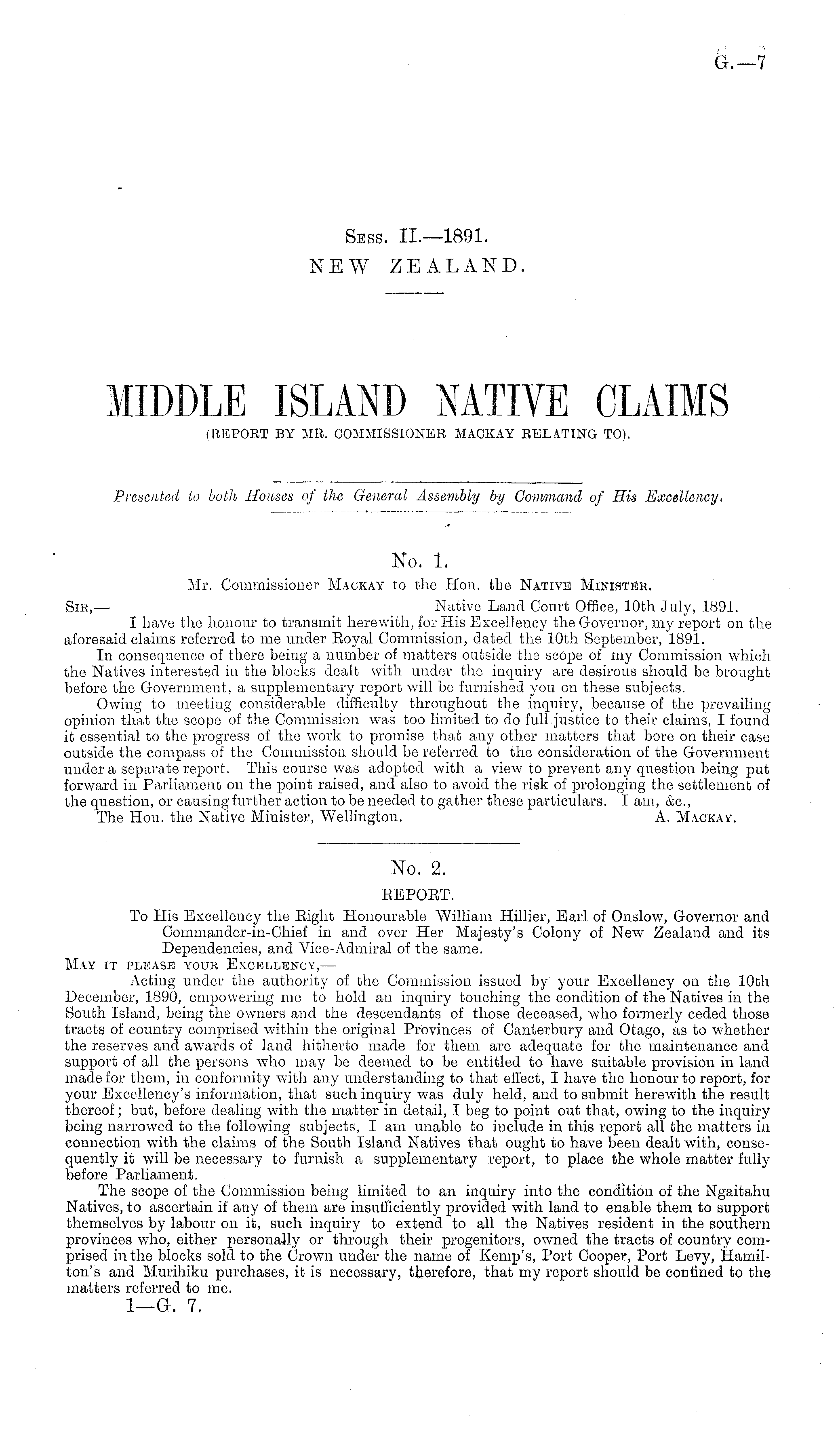 No. 2. BEPOBT. To His Excellency the Eight Honourable William Hillier, Eail of Onslow, Governor and Commander-in-Chief in and over Her Majesty's Colony of New Zealand and its Dependencies, and Vice-Admiral of the same. May it please youb Excellency,— Acting under the authority of the Commission issued by your Excellency on the 10th December, 1890, empowering me to hold an inquiry touching the condition of the Natives in the South Island, being the owners and the descendants of those deceased, who formerly ceded those tracts of country comprised within the original Provinces of Canterbury and Otago, as to whether the reserves and awards of laud hitherto made for them are adequate for the maintenance and support of all the persons who may be deemed to bo entitled to have suitable provision in land made for them, in conformity with any understanding to that effect, I have the honour to report, for your Excellency's information, that such inquiry was duly held, and to submit herewith the result thereof; but, before dealing with the matter in detail, I beg to point out that, owing to the inquiry being narrowed to the following subjects, I am unable to include in this report all the matters in connection with the claims of the South Island Natives that ought to have been dealt with, consequently it will be necessary to furnish a supplementary report, to place the whole matter fully before Parliament. The scope of the Commission being limited to an inquiry into the condition of the Ngaitahu Natives, to ascertain if any of them are insufficiently provided with land to enable them to support themselves by labour on it, such inquiry to extend to all the Natives resident in the southern provinces who, either personally or through their progenitors, owned the tracts of country comprised in the blocks sold to the Crown under the name of Kemp's, Port Cooper, Port Levy, Hamilton's and Murihiku purchases, it is necessary, therefore, that my report should be confined to the matters referred to me. I— G. 7.