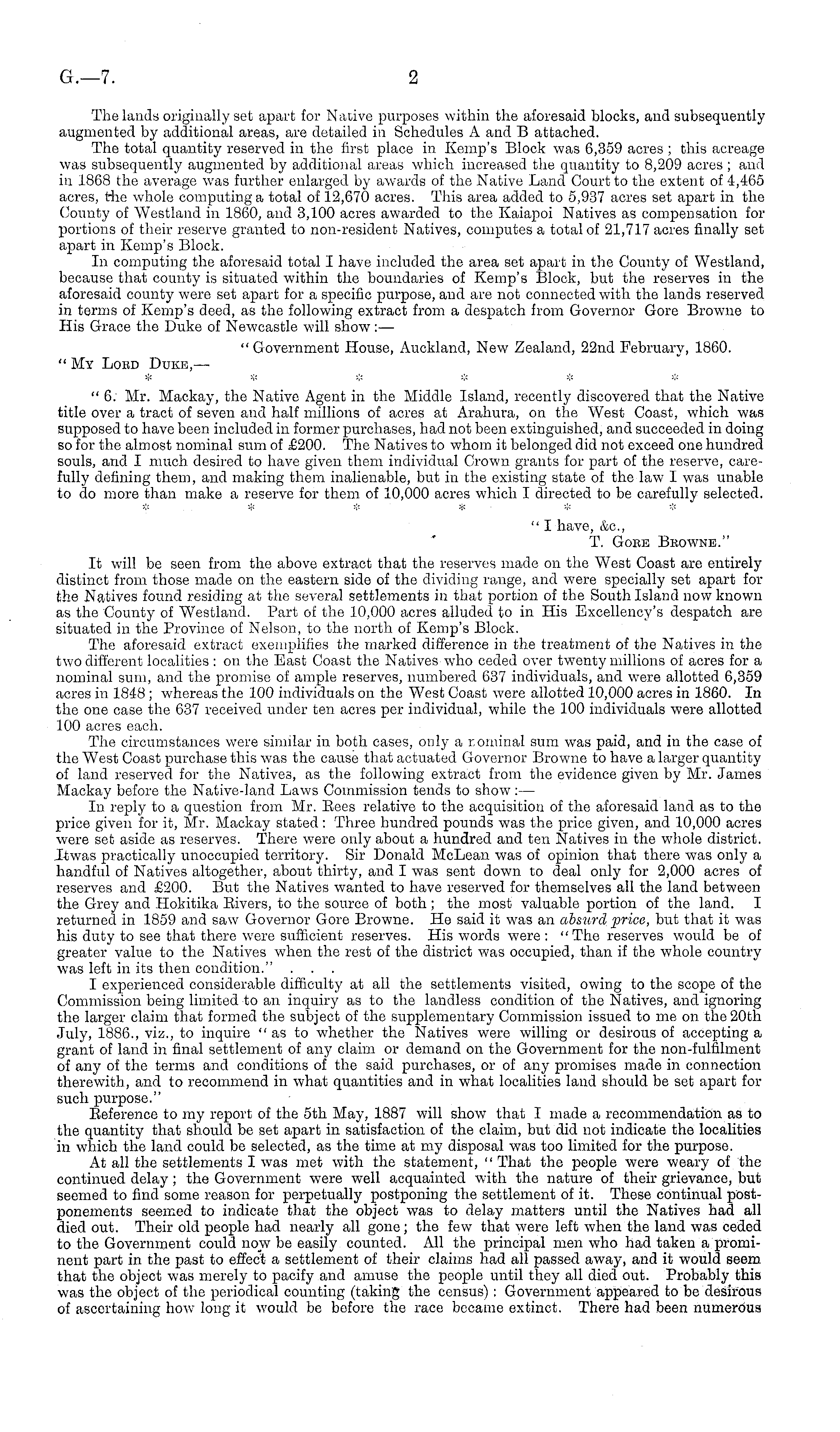 The lands originally set apart for Native purposes within the aforesaid blocks, and subsequently augmented by additional areas, are detailed in Schedules A and B attached. The total quantity reserved in the first place in Kemp's Block was 6,359 acres ; this acreage was subsequently augmented by additional areas which increased the quantity to 8,209 acres ; and in 1868 the average was further enlarged by awards of the Native Land Court to the extent of 4,465 acres, the whole computing a total of 12,670 acres. This area added to 5,937 acres set apart in the County of Westland in 1860, and 3,100 acres awarded to the Kaiapoi Natives as compensation for portions of their reserve granted to non-resident Natives, computes a total of 21,717 acres finally set apart in Kemp's Block. In computing the aforesaid total I have included the area set apart in tlie County of Westland, because that county is situated within the boundaries of Kemp's Block, but the reserves in the aforesaid county were set apart for a specific purpose, and are not connected with the lands reserved in terms of Kemp's deed, as the following extract from a despatch from Governor Gore Browne to His Grace the Duke of Newcastle will show:— " Government House, Auckland, New Zealand, 22nd February, 1860. " My Lokd Duke, — " 6. Mr. Mackay, the Native Agent in the Middle Island, recently discovered that the Native title over a tract of seven and half millions of acres at Arahura, on the West Coast, which was supposed to have been included in former purchases, had not been extinguished, and succeeded in doing so for the almost nominal sum of £200. The Natives to whom it belonged did not exceed one hundred souls, and I much desired to have given them individual Crown grants for part of the reserve, carefully defining them, and making them inalienable, but in the existing state of the law I was unable to do more than make a reserve for them of 10,000 acres which I directed to be carefully selected. " I have, &c, T. Gobe Bkowne." It will be seen from the above extract that the reserves made on the West Coast are entirely distinct from those made on the eastern side of the dividing range, and were specially set apart for the Natives found residing at the several settlements in that portion of the South Island now known as the County of Westland. Part of the 10,000 acres alluded to in His Excellency's despatch are situated in the Province of Nelson, to the north of Kemp's Block. The aforesaid extract exemplifies the marked difference in the treatment of the Natives in the two different localities : on the East Coast the Natives who ceded over twenty millions of acres for a nominal sum, and the promise of ample reserves, numbered 637 individuals, and were allotted 6,359 acres in 1848 ; whereas the 100 individuals on the West Coast were allotted 10,000 acres in 1860. In the one case the 637 received under ten acres per individual, while the 100 individuals were allotted 100 acres each. The circumstances were similar in both cases, only a r.ominal sum was paid, and in the case of the West Coast purchase this was the cause that actuated Governor Browne to have a larger quantity of land reserved for the Natives, as the following extract from the evidence given by Mr. James Mackay before the Native-land Laws Commission tends to show : — In reply to a question from Mr. Eees relative to the acquisition of the aforesaid land as to the price given for it, Mr. Mackay stated: Three hundred pounds was the price given, and 10,000 acres were set aside as reserves. There were only about a hundred and ten Natives in the whole district. Itwas practically unoccupied territory. Sir Donald McLean was of opinion that there was only a handful of Natives altogether, about thirty, and I was sent down to deal only for 2,000 acres of reserves and £200. But the Natives wanted to have reserved for themselves all the land between the Grey and Hokitika Eivers, to the source of both; the most valuable portion of the land. I returned in 1859 and saw Governor Gore Browne. He said it was an absurd price, but that it was his duty to see that there were sufficient reserves. His words were : "The reserves would be of greater value to the Natives when the rest of the district was occupied, than if the whole country was left in its then condition." . . . I experienced considerable difficulty at all the settlements visited, owing to the scope of the Commission being limited to an inquiry as to the landless condition of the Natives, and ignoring the larger claim that formed the subject of the supplementary Commission issued to me on the 20th July, 1886., viz., to inquire " as to whether the Natives were willing or desirous of accepting a grant of land in final settlement of any claim or demand on the Government for the non-fulfilment of any of the terms and conditions of the said purchases, or of any promises made in connection therewith, and to recommend in what quantities and in what localities land should be set apart for such purpose." Eeference to my report of the sth May, 1887 will show that I made a recommendation as to the quantity that should be set apart in satisfaction of the claim, but did not indicate the localities in which the land could be selected, as the time at my disposal was too limited for the purpose. At all the settlements I was met with the statement, "That the people were weary of the continued delay; the Government were well acquainted with the nature of their grievance, but seemed to find some reason for perpetually postponing the settlement of it. These continual postponements seemed to indicate that the object was to delay matters until the Natives had all clied out. Their old people had nearly all gone ; the few that were left when the land was ceded to the Government could now be easily counted. All the principal men who had taken a prominent part in the past to effect a settlement of their claims had all passed away, and it would seem that t
