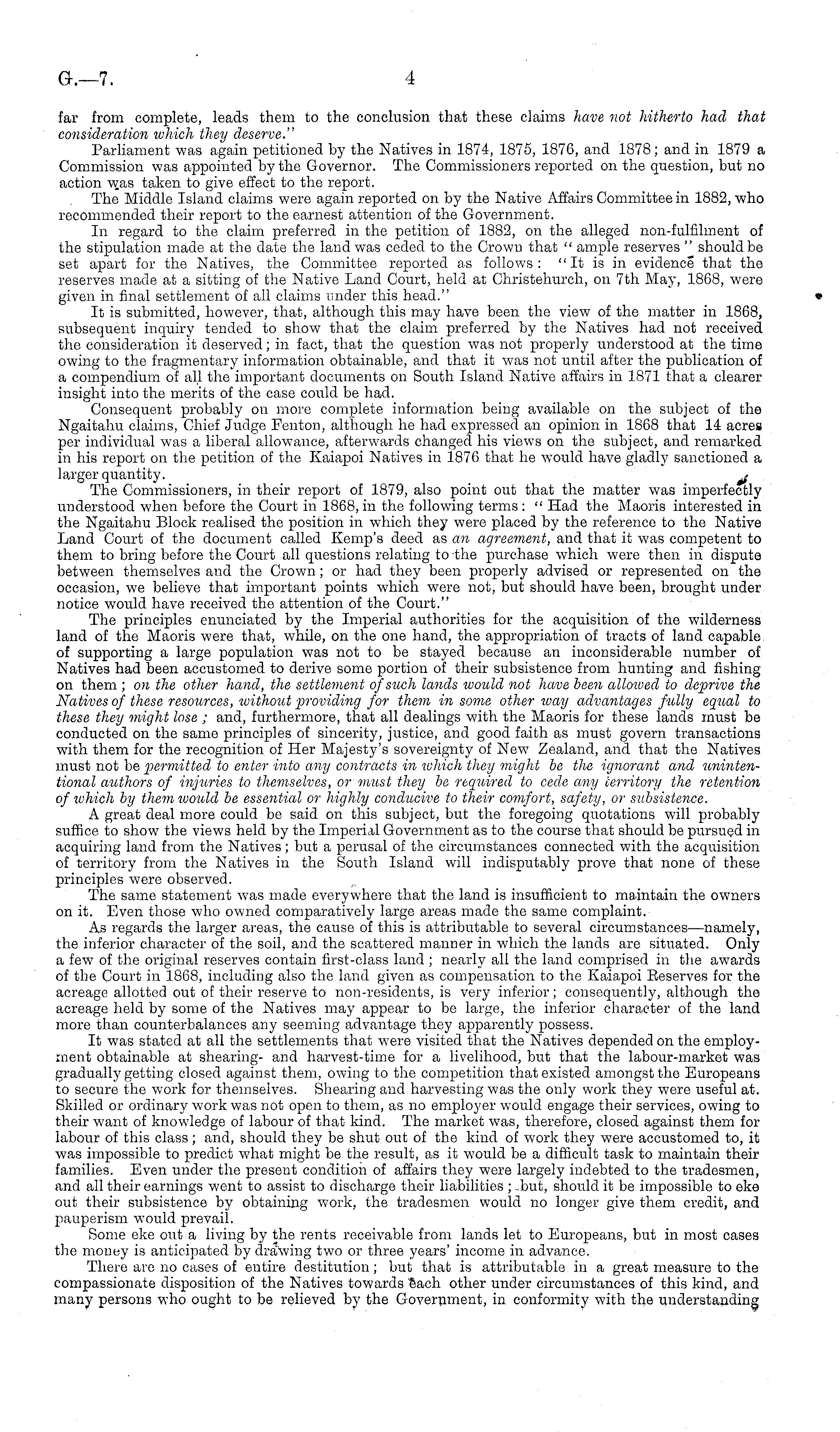 far from complete, leads them to the conclusion that these claims have not hitherto had that consideration which they deserve." Parliament was again petitioned by the Natives in 1874, 1875, 1876, and 1878; and in 1879 a Commission was appointed by the Governor. The Commissioners reported on the question, but no action was taken to give effect to the report. The Middle Island claims were again reported on by the Native Affairs Committee in 1882, who recommended their report to the earnest attention of the Government. In regard to the claim preferred in the petition of 1882, on the alleged non-fulfilment of the stipulation made at the date the land was ceded to the Crown that " ample reserves " should be set apart for the Natives, the Committee reported as follows: "It is in evidence that the reserves made at a sitting of the Native Land Court, held at Christehurch, on 7th May, 1868, were given in final settlement of all claims under this head." It is submitted, however, that, although this may have been the view of the matter in 1868, subsequent inquiry tended to show that the claim preferred by the Natives had not received the consideration it deserved; in fact, that the question was not properly understood at the time owing to the fragmentary information obtainable, and that it was not until after the publication of a compendium of all the important documents on South Island Native affairs in 1871 that a clearer insight into the merits of the case could be had. Consequent probably on more complete information being available on the subject of the Ngaita.hu claims, Chief Judge Penton, although he had expressed an opinion in 1868 that 14 acres per individual was a liberal allowance, afterwards changed his views on the subject, and remarked in his report on the petition of the Kaiapoi Natives in 1876 that he would have gladly sanctioned a larger quantity. - The Commissioners, in their report of 1879, also point out that the matter was imperfectly understood when before the Court in 1868, in the following terms : " Had the Maoris interested in the Ngaitahu Block realised the position in which they were placed by the reference to the Native Land Court of the document called Kemp's deed as an agreement, and that it was competent to them to bring before the Court all questions relating to the purchase which were then in dispute between themselves and the Crown ; or had they been properly advised or represented on the occasion, we believe that important points which were not, but should have been, brought under notice would have received the attention of the Court." The principles enunciated by the Imperial authorities for the acquisition of the wilderness land of the Maoris were that, while, on the one hand, the appropriation of tracts of land capable of supporting a large population was not to be stayed because an inconsiderable number of Natives had been accustomed to derive some portion of their subsistence from hunting and fishing on them ; on the other hand, the settlement of such lands would not have been allowed to deprive the Natives of these resources, without providing for them in some other way advantages fully equal to these they might lose ; and, furthermore, that all dealings with the Maoris for these lands must be conducted on the same principles of sincerity, justice, and good faith as must govern transactions with them for the recognition of Her Majesty's sovereignty of New Zealand, and that the Natives must not be permitted to enter into any contracts in which they might be the ignorant and unintentional authors of injuries to themselves, or must they be required to cede any territory the retention of which by them would be essential or highly conducive to their comfort, safety, or subsistence. A great deal more could be said on this subject, but the foregoing quotations will probably suffice to show the views held by the Imperial Government as to the course that should be pursued in acquiring land from the Natives; but a perusal of the circumstances connected with the acquisition of territory from the Natives in the South Island will indisputably prove that none of these principles were observed. The same statement was made everywhere that the land is insufficient to maintain the owners on it. Even those who owned comparatively large areas made the same complaint. As regards the larger areas, the cause of this is attributable to several circumstances—namely, the inferior character of the soil, and the scattered manner in which the lands are situated. Only a few of the original reserves contain first-class land ; nearly all the land comprised in the awards of the Court in 1868, including also the land given as compensation to the Kaiapoi Eeserves for the acreage allotted out of their reserve to non-residents, is very inferior; consequently, although the acreage held by some of the Natives may appear to be large, the inferior character of the land more than counterbalances any seeming advantage they apparently possess. It was stated at all the settlements that were visited that the Natives depended on the employment obtainable at shearing- and harvest-time for a livelihood, but that the labour-market was gradually getting closed against them, owing to the competition that existed amongst the Europeans to secure the work for themselves. Shearing and harvesting was the only work they were useful at. Skilled or ordinary work was not open to them, as no employer would engage their services, owing to their want of knowledge of labour of that kind. The market was, therefore, closed against them for labour of this class; and, should they be shut out of the kind of work they were accustomed to, it was impossible to predict what might be the result, as it would be a difficult task to maintain their families. Even under the present condition of affairs they were largely indebted to the tradesmen, and all their earnings went to assist to discharge their liabilities ; but, should it be 