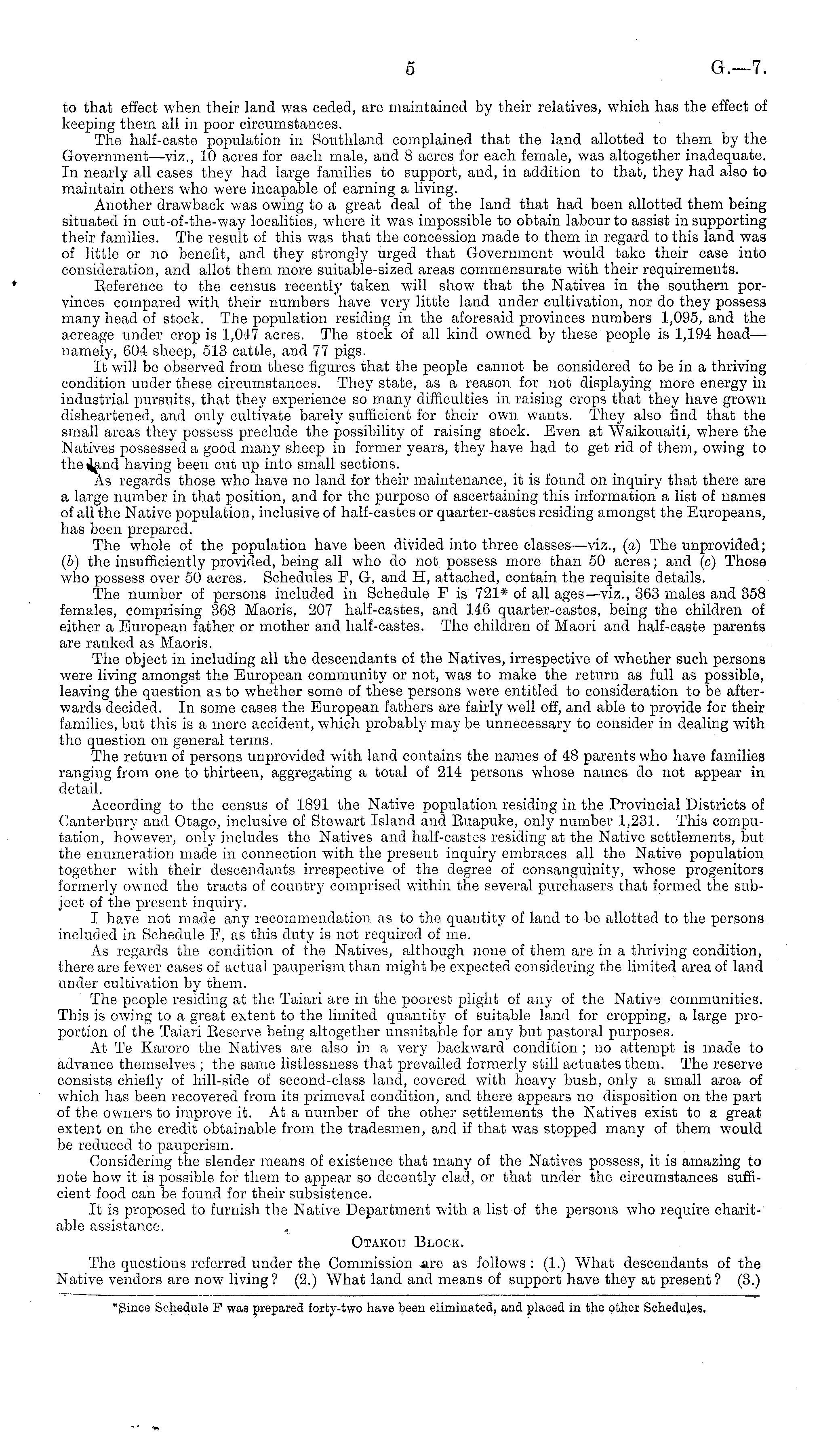 to that effect when their land was ceded, are maintained by their relatives, which has the effect of keeping them all in poor circumstances. The half-caste population in Southland complained that the land allotted to them by the Government—viz., 10 acres for each male, and 8 acres for each female, was altogether inadequate. In nearly all cases they had large families to support, and, in addition to that, they had also to maintain others who were incapable of earning a living. Another drawback was owing to a great deal of the land that had been allotted them being situated in out-of-the-way localities, where it was impossible to obtain labour to assist in supporting their families. The result of this was that the concession made to them in regard to this land was of little or no benefit, and they strongly urged that Government would take their case into consideration, and allot them more suitable-sized areas commensurate with their requirements. Beference to the census recently taken will show that the Natives in the southern porvinces compared with their numbers have very little land under cultivation, nor do they possess many head of stock. The population residing in the aforesaid provinces numbers 1,095, and the acreage under crop is 1,047 acres. The stock of all kind owned by these people is 1,194 head — namely, 604 sheep, 513 cattle, and 77 pigs. It will be observed from these figures that the people cannot be considered to be in. a thriving condition under these circumstances. They state, as a reason for not displaying more energy in industrial pursuits, that they experience so many difficulties in raising crops that they have grown disheartened, and only cultivate barely sufficient for their own. wants. They also find that the small areas they possess preclude the possibility of raising stock. Even at Waikouaiti, where the Natives possessed a good many sheep in former years, they have had to get rid of them, owing to the il^nd having been cut up into small sections. As regards those who have no land for their maintenance, it is found on inquiry that there are a large number in that position, and for the purpose of ascertaining this information a list of names of all the Native population, inclusive of half-castes or quarter-castes residing amongst the Europeans, has been prepared. The whole of the population have been divided into three classes—viz., (a) The unprovided; (_) the insufficiently provided, being all who do not possess more than 50 acres; and (c) Those who possess over 50 acres. Schedules E, G, and H, attached, contain the requisite details. The number of persons included in Schedule P is 721* of all ages—viz., 363 males and 358 females, comprising 368 Maoris, 207 half-castes, and 146 quarter-castes, being the children of either a European father or mother and half-castes. The children of Maori and half-caste parents are ranked as Maoris. The object in including all the descendants of the Natives, irrespective of whether such persons were living amongst the European community or not, was to make the return as full as possible, leaving the question as to whether some of these persons were entitled to consideration to be afterwards decided. In some cases the European fathers are fairly well off, and able to provide for their families, but this is a mere accident, which probably may be unnecessary to consider in dealing with the question on general terms. The return of persons unprovided with land contains the names of 48 parents who have families ranging from one to thirteen, aggregating a total of 214 persons whose names do not appear in detail. According to the census of 1891 the Native population residing in the Provincial Districts of Canterbury and Otago, inclusive of Stewart Island and Buapuke, only number 1,231. This computation, however, only includes the Natives and half-castes residing at the Native settlements, but the enumeration made in connection with the present inquiry embraces all the Native population together with their descendants irrespective of the degree of consanguinity, whose progenitors formerly owned the tracts of country comprised within the several purchasers that formed the subject of the present inquiry. I have not made any recommendation as to the quantity of land to be allotted to the persons included in Schedule F, as this duty is not required of me. As regards the condition of the Natives, although none of them are in a thriving condition, there are fewer cases of actual pauperism than might be expected considering the limited area of land under cultivation by them. The people residing at the Taiari are in the poorest plight of any of the Native communities. This is owing to a great extent to the limited quantity of suitable land for cropping, a large proportion of the Taiari Eeserve being altogether unsuitable for any but pastoral purposes. At Te Karoro the Natives are also in a very backward condition ; no attempt is made to advance themselves ; the same listlessness that prevailed formerly still actuates them. The reserve consists chiefly of hill-side of second-class land, covered with heavy bush, only a small area of which has been recovered from its primeval condition, and there appears no disposition on tire part of the owners to improve it. At a number of the other settlements the Natives exist to a great extent on the credit obtainable from the tradesmen, and if that was stopped many of them would be reduced to pauperism. Considering the slender means of existence that many of the Natives possess, it is amazing to note how it is possible for them to appear so decently clad, or that under the circumstances sufficient food can be found for their subsistence. It is proposed to furnish the Native Department with a list of the persons who require charitable assistance. . Otakou Block. The questions referred under the Commission are as follows : (1.) What descendants of the Native vendors are now living? (2.) What land and mean