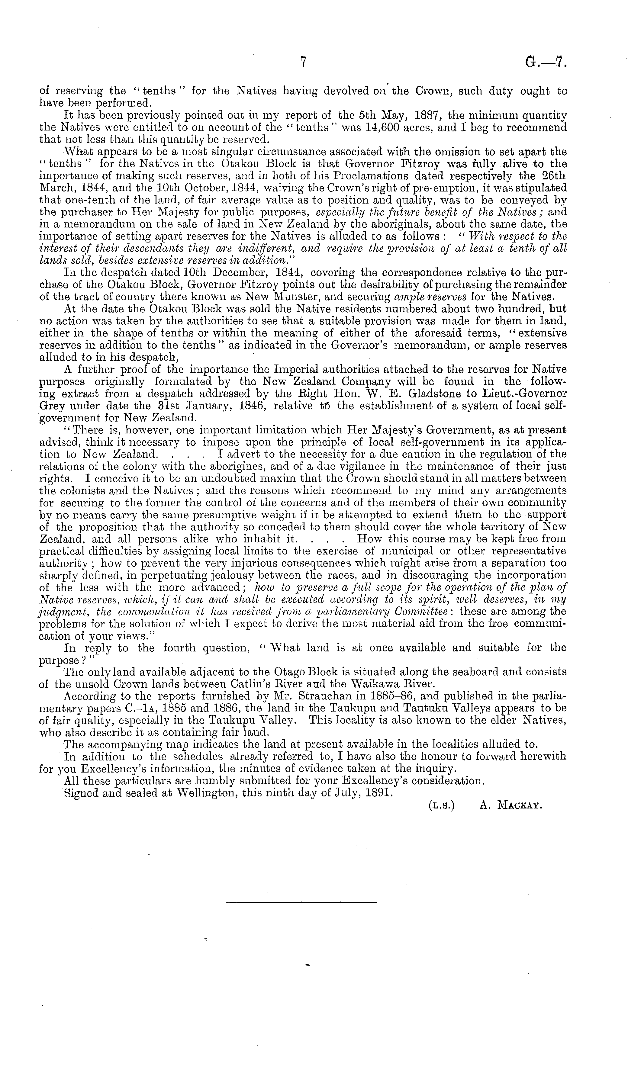 of reserving the " tenths " for the Natives having devolved on the Crown, such duty ought to have been performed. It has been previously pointed out in my report of the sth May, 1887, the minimum quantity the Natives were entitled to on account of the " tenths " was 14,600 acres, and I beg to recommend that not less than this quantity be reserved. What appears to be a most singular circumstance associated with the omission to set apart the "tenths" for the Natives in the Otakou Block is that Governor Fitzroy was fully alive to the importance of making such reserves, and in both of his Proclamations dated respectively the 26th March, 1844, and the 10th October, 1844, waiving the Crown's right of pre-emption, it was stipulated that one-tenth of the land, of fair average value as to position and quality, was to be conveyed by the purchaser to Her Majesty for public purposes, especially the future benefit of the Natives ; and in a memorandum on the sale of land in New Zealand by the aboriginals, about the same date, the importance of setting apart reserves for the Natives is alluded to as follows : " With respect to the interest of their descendants they are indifferent, and require the provision of at least a tenth of all lands sold, besides extensive reserves in addition." In the despatch dated 10th December, 1844, covering the correspondence relative to the purchase of the Otakou Block, Governor Fitzroy points out the desirability of purchasing the remainder of the tract of country there known as New Munster, and securing ample reserves for the Natives. At the date the Otakou Block was sold the Native residents numbered about two hundred, but no action was taken by the authorities to see that a suitable provision was made for them in land, either in the shape of tenths or within the meaning of either of the aforesaid terms, " extensive reserves in addition to the tenths " as indicated in the Governor's memorandum, or ample reserves alluded to in his despatch, A further proof of the importance the Imperial authorities attached to the reserves for Native purposes originally formulated by the New Zealand Company will be found in the following extract from a despatch addressed by the Bight Hon. W. E. Gladstone to Lieut.-Governor Grey under date the 31st January, 1846, relative t6 the establishment of a system of local selfgovernment for New Zealand. "There is, however, one important limitation which Her Majesty's Government, as at present advised, think it necessary to impose upon the principle of local self-government in its application to New Zealand. ... I advert to the necessity for a due caution in the regulation of the relations of the colony with the aborigines, and of a due vigilance in the maintenance of their just rights. I conceive it to be an undoubted maxim that the Crown should stand in all matters between the colonists and the Natives ; and the reasons which recommend to my mind any arrangements for securing to the former the control of the concerns and of the members of their own community by no means carry the same presumptive weight if it be attempted to extend them to the support of the proposition that the authority so conceded to them should cover the whole territory of New Zealand, and all persons alike who inhabit it. How this course may be kept free from practical difficulties by assigning local limits to the exercise of municipal or other representative authority ; how to prevent the very injurious consequences which might arise from a separation too sharply defined, in perpetuating jealousy between the races, and in discouraging the incorporation of the less with the more advanced; how to preserve a full scope for the operation of the plan of Native reserves, which, if it can and shall be executed according to its spirit, well deserves, in my judgment, the commendation it has received from a parliamentary Committee : these are among the problems for the solution of which I expect to derive the most material aid from the free communication of your views." In reply to the fourth question, " What land is at once available and suitable for the purpose?" The only land available adjacent to the Otago Block is situated along the seaboard and consists of the unsold Crown lands between Catlin's Eiver aud the Waikawa Eiver. According to the reports furnished by Mr. Strauchan in 1885-86, and published in the parliamentary papers C.-la, 1885 and 1886, the land in the Taukupu and Tautuku Valleys appears to be of fair quality, especially in the Taukupu Valley. This locality is also known to the elder Natives, who also describe it as containing fair land. The accompanying map indicates the land at present available in the localities alluded to. In addition to the schedules already referred to, I have also the honour to forward herewith for you Excellency's information, the minutes of evidence taken at the inquiry. All these particulars are humbly submitted for your Excellency's consideration. Signed and sealed at Wellington, this ninth day of July, 1891. (1.5.) A. Mackay.