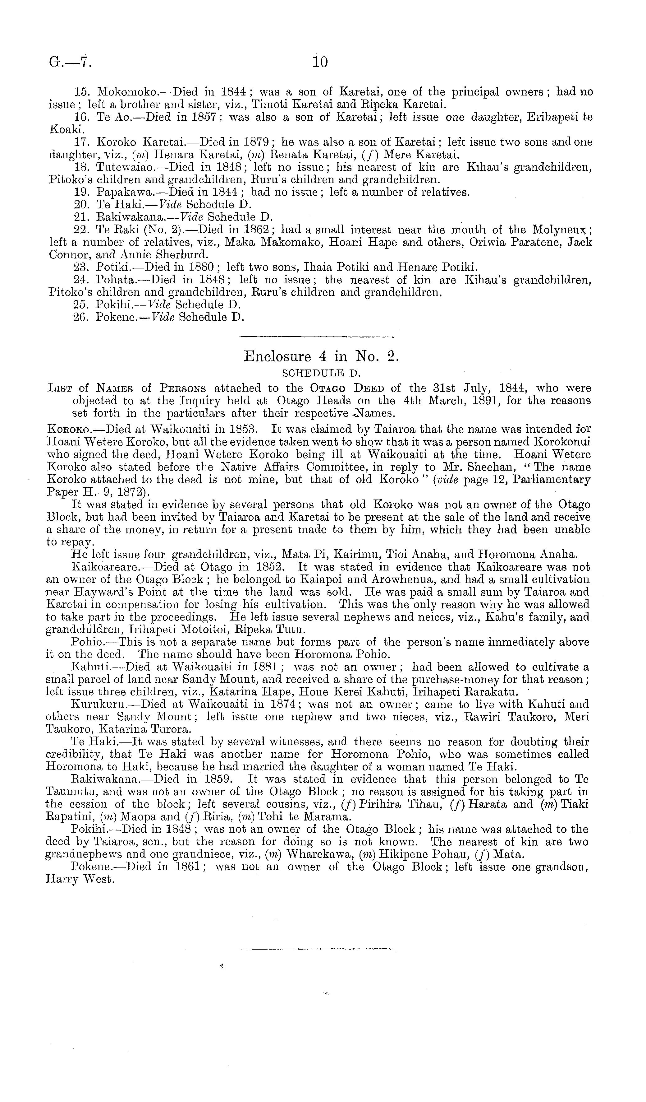 15. Mokomoko.—Died in 1844; was a son of Karetai, one of the principal owners; had no issue ; left a brother and sister, viz., Tinioti Karetai and Bipeka Karetai. 16. Te Ao.—Died in 1857; was also a son of Karetai; left issue one daughter, Erihapeti te Koaki. 17. Koroko Karetai.—Died in 1879 ; he was also a son of Karetai; left issue two sons and one daughter, viz., (m) Henara Karetai, (m) Eenata Karetai, (/) Mere Karetai. 18. Tutewaiao.—Died in 1848; left no issue; his nearest of kin are Kihau's grandchildren, Pitoko's children and grandchildren, Bum's children and grandchildren. 19. Papakawa.—Died in 1844 ; had no issue ; left a number of relatives. 20. Te Haki.— Vide Schedule D. 21. Eakiwakana.— Vide Schedule D. 22. Te Eaki (No. 2). —Died in 1862; had a small interest near the mouth of the Molyneux; left a number of relatives, viz., Maka Makomako, Hoani Hape and others, Oriwia Paratene, Jack Connor, and Annie Sherburd. 23. Potiki.—Died in 1880; left two sons, Ihaia Potiki and Henare Potiki. 24. Pohata.—Died in 1848; left no issue; the nearest of kin are Kihau's grandchildren, Pitoko's children and grandchildren, Buru's children and grandchildren. 25. Pokihi.— Vide Schedule D. 26. Pokene.— Vide Schedule D.