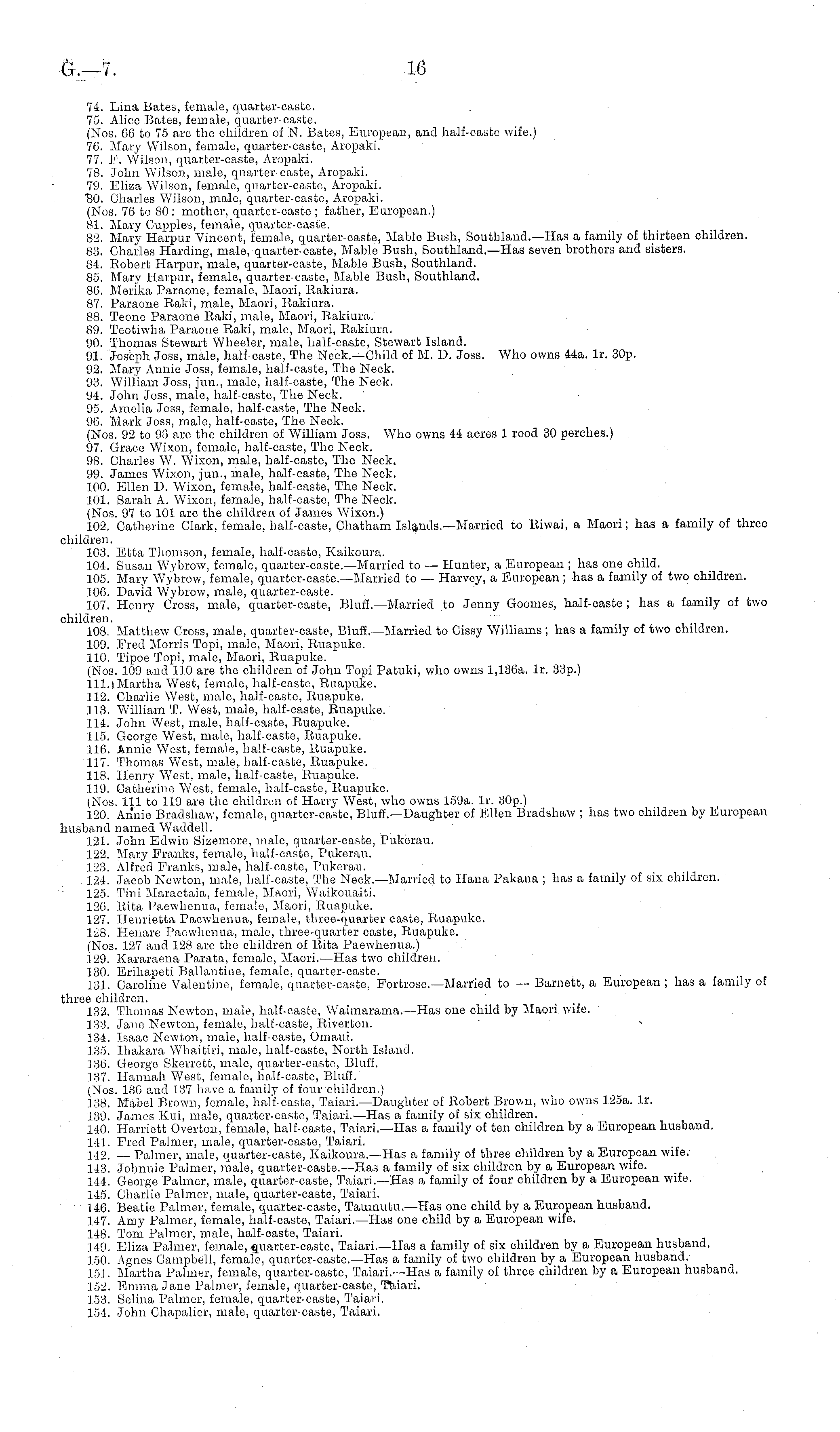 74. Lina Bates, female, quarter-caste. 75. Alice Bates, female, quarter-caste. (Nos. 66 to 75 are the children of N. Bates, European, and half-caste wife.) 76. Mary Wilson, female, quarter-caste, Aropaki. 77. F. Wilson, quarter-caste, Aropaki. 78. John Wilson, male, quarter caste, Aropaki. 79. Eliza Wilson, female, quarter-caste, Aropaki. HO. Charles Wilson, male, quarter-caste, Aropaki. (Nos. 76 to 80: mother, quarter-caste ; father, European.) 81. Mary Cupples, female, quarter-caste. 82. Mary Harpur Vincent, female, quarter-caste, Mablc Bush, Southland.—Has a family of thirteen children. 83. Charles Harding, male, quarter-caste, Mable Bush, Southland.—Has seven brothers and sisters. 84. Robert Harpur, male, quarter-caste, Mablc Bush, Southland. 85. Mary Harpur, female, quarter-caste, Mable Bush, Southland. 86. Merika Paraone, female, Maori, Rakiura. 87. Paraone Raki, male, Maori, Rakiura. 88. Teone Paraone Raki, male, Maori, Rakiura. 89. Teotiwha Paraone Raki, male, Maori, Rakiura. 90. Thomas Stewart Wheeler, male, half-caste, Stewart Island. 91. Joseph Joss, male, half-caste, The Neck.—Child of M. D. Joss. Who owns 44a. lr. 30p. 92. Mary Annie Joss, female, half-caste, The Neck. 93. William Joss, jun., male, half-caste, The Neck. 94. John Joss, male, half-caste, The Neck. 95. Amelia Joss, female, half-caste, The Neck. 90. Mark Joss, male, half-caste, The Neck. (Nos. 92 to 96 are the children of William Joss. Who owns 44 acres 1 rood 30 perches.) 97. Grace Wixon, female, half-caste, The Neck. 98. Charles W. Wixon, male, half-caste, The Neck. 99. James Wixon, jun., male, half-caste, 'The Neck. 100. Ellen D. Wixon, female, half-caste, The Neck. 101. Sarah A. Wixon, female, half-caste, The Neck. (Nos. 97 to 101 are the children of James Wixon.) 102. Catherine Clark, female, half-caste, Chatham Islands.—Married to Riwai, a Maori; has a family of three children. 103. Etta Thomson, female, half-caste, Kaikoura. 104. Susan Wybrow, female, quarter-caste. —Married to — Hunter, a European ; has one child. 105. Mary Wybrow, female, quarter-caste.—Married to — Harvey, a European; has a family of two children. 106. David Wybrow, male, quarter-caste. 107. Henry Cross, male, quarter-caste, Bluff.—Married to Jenny Goomes, half-caste ; has a family of two children. 108. Matthew Cross, male, quarter-caste, Bluff.—Married to Cissy Williams ; has a family of two children. 109. Fred Morris Topi, male, Maori, Ruapuke. 110. Tipoe Topi, male, Maori, Ruapuke. (Nos. 109 aud 110 are the children of John Topi Patuki, who owns 1,136 a. lr. 33p.) 111.! Martha West, female, half-caste, Ruapuke. 112. Charlie West, male, half-caste, Ruapuke. 113. William T. West, male, half-caste, Ruapuke. 114. John West, male, half-caste, Ruapuke. 115. George West, male, half-caste, Ruapuke. 116. Annie West, female, half-caste, Ruapuke. 117. Thomas West, male, half-caste, Ruapuke. 118. Henry West, male, half-caste, Ruapuke. 119. Catherine West, female, half-caste, Ruapuke. (Nos. 11l to 119 are the children of Harry West, who owns 159 a. lr. 30p.) 120. Annie Bradshaw, female, quarter-caste, Bluff.—Daughter of Ellen Bradshaw ; has two children by European husband named Waddell. 121. John Edwin Sizemore, male, quarter-caste, Pukerau. 122. Mary Franks, female, half-caste, Pukerau. 123. Alfred Franks, male, half-caste, Pukerau. 124. Jacob Newton, male, half-caste, The Neck.—Married to Hana Pakana ; has a family of six children. 125. Tini Maraetaia, female, Maori, Waikouaiti. 126. Rita Paewhenua, female, Maori, Ruapuke. 127. Henrietta Paewhenua, female, three-quarter caste, Ruapuke. 128. Henare Paewhenua, male, three-quarter caste, Ruapuke. (Nos. 127 and 128 are the children of Rita Paewhenua.) 129. Kararaena Parata, female, Maori. —Has two children. 130. Erihapeti Ballantine, female, quarter-caste. 131. Caroline Valentine, female, quarter-caste, Fortrose— Married to — Baruett, a European ; has a family of three children. 132. Thomas Newton, male, half-caste, Waimarama. —Has one child by Maori wife. 133. Jane Newton, female, half-caste, Riverton. 134. Isaac Newton, male, half-caste, Omaui. 135. Ihakara Whaitiri, male, half-caste, North Island. 136. Georgo Skerrett, male, quarfcer-caste, Bluff. 137. Hannah West, female, half-caste, Bluff. (Nos. 136 and 137 have a family of four children.) 138. Mabel Brown, female, half-caste, Taiari.—Daughter of Robert Brown, who owns 125 a. lr. 139. James Kui, male, quarter-caste, Taiari. —Has a family of six children. 140. Harriett Overton, female, half-caste, Taiari.—Has a family of ten children by a European husband. 141. Fred Palmer, male, quarter-caste, Taiari. 142. _ Palmer, male, quarter-caste, Kaikoura.—Has a family of three children by a European wife. 143. Johnnie Palmer, male, quarter-caste.—Has a family of six children by a European wife. 144. George Palmer, male, quarter-caste, Taiari.—Has a family of four children by a European wife. 145. Charlie Palmer, male, quarter-caste, Taiari. 146. Beatie Palmer, female, quarter-caste, Taumutu.—Has one child by a European husband. 147. Amy Palmer, female, half-caste, Taiari. —Has one child by a European wife. 148. Tom Palmer, male, half-caste, Taiari. 149. Eliza Palmer, female,-quarter-caste, Taiari.—Has a family of six children by a European husband. 150. Agnes Campbell, female, quarter-caste.—Has a family of two children by a European husband. 151. Martha Palmer, female, quarter-caste, Taiari.—Has a family of three children by a European husband. 152. Emma Jane Palmer, female, quarter-caste, Taiari. 153. Selina Palmer, female, quarter-caste, Taiari. 154. John Chapalicr, male, quarter-caste, Taiari.