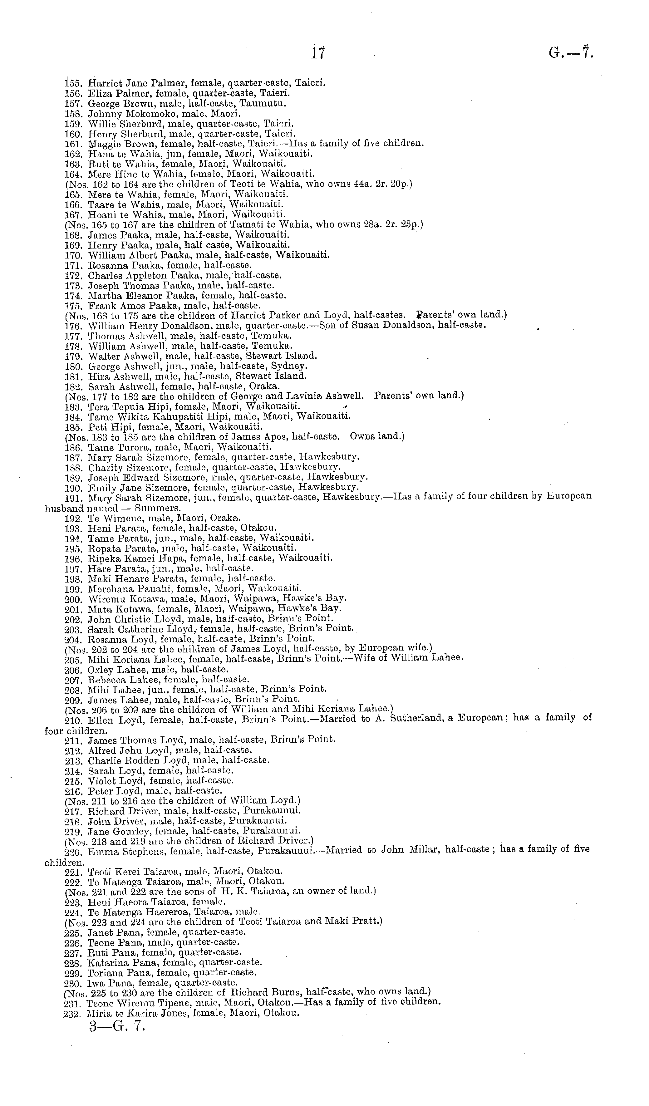 105. Harriet Jane Palmer, female, quarter-caste, Taieri. 156. Eliza Palmer, female, quarter-caste, Taieri. 157. George Brown, male, half-caste, Taumutu. 158. Johnny Mokomoko, male, Maori. 159. Willie Sherburd, male, quarter-caste, Taieri. 160. Henry Sherburd, male, quarter-caste, Taieri. 161. Maggie Brown, female, half-caste, Taieri.—Has a family of five children. 162. Hana te Wahia, jun, female, Maori, Waikouaiti. 163. Ruti te Wahia, female, Maori, Waikouaiti. 164. Mere Hine te Wahia, female, Maori, Waikouaiti. (Nos. 162 to 164 are the children of Teoti te Wahia, who owns 44a. 2r. 20p.) 165. Mere te Wahia, female, Maori, Waikouaiti. 166. Taare te Wahia, male, Maori, Waikouaiti. 167. Hoani te Wahia, male, Maori, Waikouaiti. (Nos. 165 to 167 are the children of Tamati te Wahia, who owns 28a. 2r. 23p.) 168. James Paaka, male, half-caste, Waikouaiti. 169. Henry Paaka, male, half-caste, Waikouaiti. 170. William Albert Paaka, male, half-caste, Waikouaiti. 171. Rosanna Paaka, female, half-caste. 172. Charles Appleton Paaka, male, half-caste. 173. Joseph Thomas Paaka, male, half-caste. 174. Martha Eleanor Paaka, female, half-caste. 175. Frank Amos Paaka, male, half-caste. (Nos. 168 to 175 are the children of Harriet Parker and Loyd, half-castes. Parents' own land.) 176. William Henry Donaldson, male, quarter-caste.—Son of Susan Donaldson, half-caste. 177. Thomas Ashwell, male, half-caste, Temuka. 178. William Ashwell, male, half-caste, Temuka. 179. Walter Ashwell, male, half-caste, Stewart Island. 180. George Ashwell, jun., male, half-caste, Sydney. 181. Hira Ashwell, male, half-caste, Stewart Island. 182. Sarah Ashwell, female, half-caste, Oraka. (Nos. 177 to 182 are the children of George and Lavinia Ashwell. Parents' own land.) 183. Tera Tepuia Hipi, female, Maori, Waikouaiti. 184. Tame Wikita Kahupatiti Hipi, male, Maori, Waikouaiti. 185. Peti Hipi, female, Maori, Waikouaiti. (Nos. 183 to 185 are the children of James Apes, half-caste. Owns land.) 186. Tame Turora, male, Maori, Waikouaiti. 187. Mary Sarah Sizemore, female, quarter-caste, Hawkesbury. 188. Charity Sizemore, female, quarter-caste, Hawkesbury. 189. Joseph Edward Sizemore, male, quarter-caste, Hawkesbury. 190. Emily Jane Sizemore, female, quarter-caste, Hawkesbury. 191. Mary Sarah Sizemore, jun., female, quarter-caste, Hawkesbury.—Has a family of four children by European husband named — Summers. 192. Te Wimene, male, Maori, Oraka. 193. Heni Parata, female, half-caste, Otakou. 194. Tame Parata, jun., male, half-caste, Waikouaiti. 195. Ropata Parata, male, half-caste, Waikouaiti. 196. Ripeka Kamei Hapa, female, half-caste, Waikouaiti. 197. Hare Parata, jun., male, half-caste. 198. Maki Henare Parata, female, half-caste. 199. Merehana Pauahi, female, Maori, Waikouaiti. 200. Wiremu Kotawa, male, Maori, Waipawa, Hawke's Bay. 201. Mata Kotawa, female, Maori, Waipawa, Hawke's Bay. 202. John Christie Lloyd, male, half-caste, Brinn's Point. 203. Sarah Catherine Lloyd, female, half-caste, Brinn's Point. 204. Rosanna Loyd, female, half-caste, Brinn's Point. (Nos. 202 to 204 are the children of James Loyd, half-caste, by European wife.) 205. Mihi Koriana Lahee, female, half-caste, Brinn's Point.—Wife of William Lahee. 206. Oxley Lahee, male, half-caste. 207. Rebecca Lahee, female, half-caste. 208. Mihi Lahee, jun., female, half-caste, Brinn's Point. 209. James Lahee, male, half-caste, Brinn's Point. (Nos. 206 to 209 are the children of William and Mihi Koriana Lahee.) 210. Ellen Loyd, female, half-caste, Brinn's Point.—Married to A. Sutherland, a European; has a family of four children. 211. James Thomas Loyd, male, half-caste, Brinn's Point. 212. Alfred John Loyd, male, half-caste. 213. Charlie Rodden Loyd, male, half-caste. 214. Sarah Loyd, female, half-caste. 215. Violet Loyd, female, half-caste. 216. Peter Loyd, male, half-caste. (Nos. 211 to 216 are the children of William Loyd.) 217. Richard Driver, male, half-caste, Purakaunui. 218. John Driver, male, half-caste, Purakaunui. 219. Jane Gourley, female, half-caste, Purakaunui. (Nos. 218 and 219 are the children of Richard Driver.) 220. Emma Stephens, female, half-caste, Purakaunui.—Married to John Millar, half-caste ; has a family of five children. 221. Teoti Kerei Taiaroa, male, Maori, Otakou. 222. Te Matenga Taiaroa, male, Maori, Otakou. (Nos. 221 and 222 aro the sons of H. K. Taiaroa, an owner of land.) 223. Heni Haeora Taiaroa, female. 224. Te Matenga Haereroa, Taiaroa, male. (Nos. 223 and 224 aro the children of Teoti Taiaroa and Maki Pratt.) 225. Janet Pana, female, quarter-caste. 226. Teone Pana, male, quarter-caste. 227. Ruti Pana, female, quarter-caste. 228. Katarina Pana, female, quarter-caste. 229. Toriana Pana, female, quarter-caste. 230. Iwa Pana, female, quartcr-casto. (Nos. 225 to 230 are the children of Richard Burns, half-caste, who owns land.) 231. Teone Wiremu Tipene, male, Maori, Otakou.—Has a family of five children. 232. Miria to Karira Jones, female, Maori, Otakou. 3—a. 7.