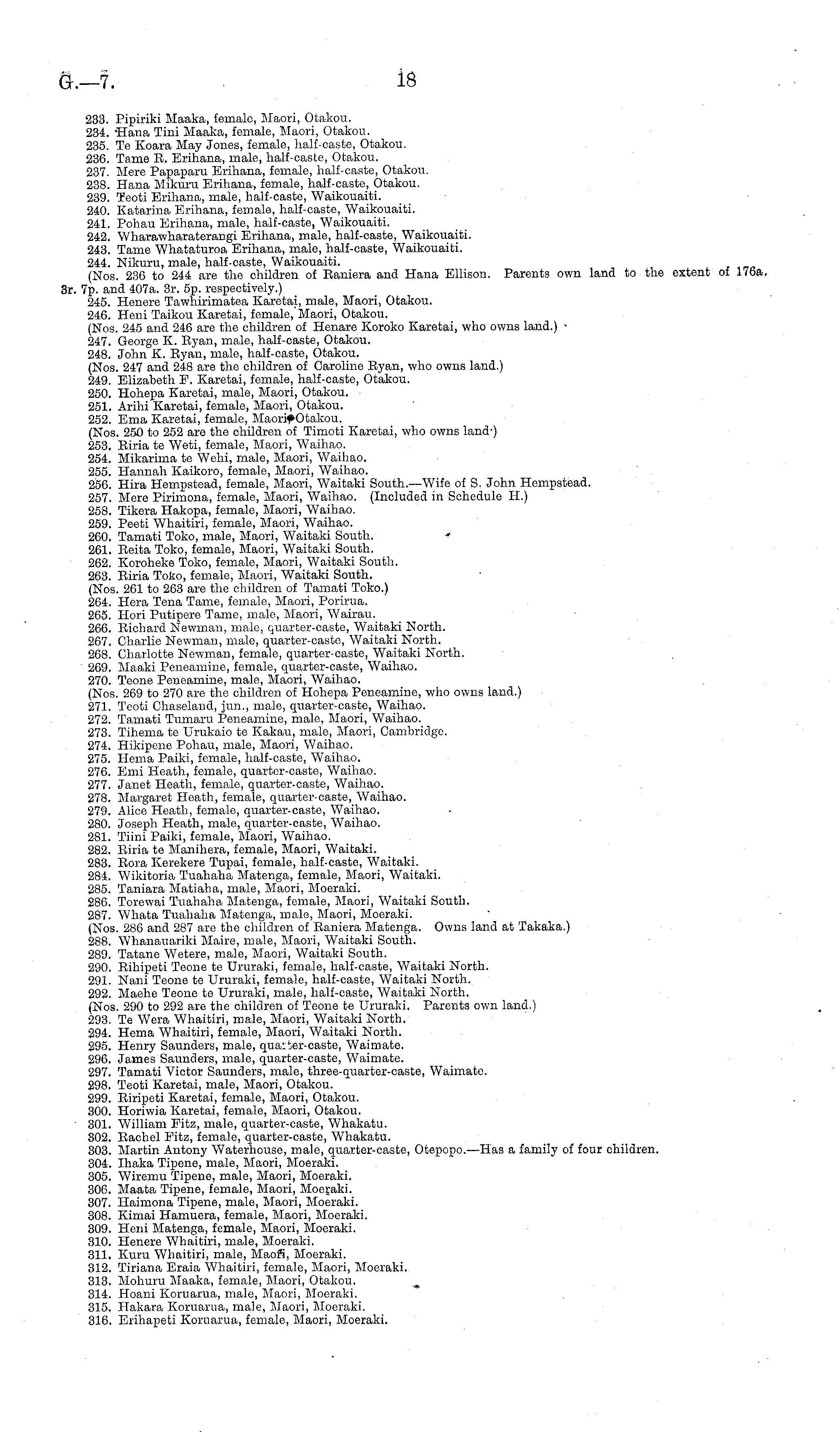 233. Pipiriki Maaka, female, Maori, Otakou. 234. Hana Tini Maaka, female, Maori, Otakou. 235. Te Koara May Jones, female, half-caste, Otakou. 236. Tame R. Erihana, male, half-caste, Otakou. 237. Mere Papaparu Erihana, female, half-caste, Otakou. 238. Hana Mikuru Erihana, female, half-caste, Otakou. 239. Teoti Erihana, male, half-caste, Waikouaiti. 240. Katarina Erihana, female, half-caste, Waikouaiti. 241. Pohau Erihana, male, half-caste, Waikouaiti. 242. Wharawharaterangi Erihana, male, half-caste, Waikouaiti. 243. Tame Whataturoa Erihana, male, half-caste, Waikouaiti. 244. Nikuru, male, half-caste, Waikouaiti. (Nos. 236 to 244 are the children of Raniera and Hana Ellison. Parents own land to the extent of 176 a. 3r. 7p. and 407 a. 3r. sp. respectively.) 245. Henere Tawhirimatea Karetai, male, Maori, Otakou. 246. Heni Taikou Karetai, female, Maori, Otakou. (Nos. 245 and 246 are the children of Henare Koroko Karetai, who owns land.) - 247. George K. Ryan, male, half-caste, Otakou. 248. John K. Ryan, male, half-caste, Otakou. (Nos. 247 and 248 are the children of Caroline Ryan, who owns land.) 249. Elizabeth F. Karetai, female, half-caste, Otakou. 250. Hohepa Karetai, male, Maori, Otakou. 251. Arihi Karetai, female, Maori, Otakou. 252. Ema Karetai, female, Maoris Otakou. (Nos. 250 to 252 are the children of Timoti Karetai, who owns land-) 253. Riria te Weti, female, Maori, Waihao. 254. Mikarima te Wehi, male, Maori, Waihao. 255. Hannah Kaikoro, female, Maori, Waihao. 256. Hira Hempstead, female, Maori, Waitaki South. —Wife of S. John Hempstead. 257. Mere Pirimona, female, Maori, Waihao. (Included in Schedule H.) 258. Tikera Hakopa, female, Maori, Waihao. 259. Peeti Whaitiri, female, Maori, Waihao. 260. Tamati Toko, male, Maori, Waitaki South. - 261. Reita Toko, female, Maori, Waitaki South. 262. Koroheke Toko, female, Maori, Waitaki South. 263. Riria Toko, female, Maori, Waitaki South. (Nos. 261 to 263 are the children of Tamati Toko.) 264. Hera Tena Tame, female, Maori, Porirua. 265. Hori Putipere Tame, male, Maori, Wairau. 266. Richard Newman, male, quarter-caste, Waitaki North. 267. Charlie Newman, male, quarter-caste, Waitaki North. 268. Charlotte Newman, female, quarter-caste, Waitaki North. ' 269. Maaki Peneamine, female, quarter-caste, Waihao. 270. Teone Peneamine, male, Maori, Waihao. (Nos. 269 to 270 are the children of Hohepa Peneamine, who owns land.) 271. Teoti Chaseland, jun., male, quarter-caste, Waihao. 272. Tamati Tumaru Peneamine, male, Maori, Waihao. 273. Tihema te Urukaio te Kakau, male, Maori, Cambridge. 274. Hikipene Pohau, male, Maori, Waihao. 275. Hema Paiki, female, half-caste, Waihao. 276. Emi Heath, female, quarter-caste, Waihao. 277. Janet Heath, female, quarter-caste, Waihao. 278. Margaret Heath, female, quarter-caste, Waihao. 279. Alice Heath, female, quarter-caste, Waihao. 280. Joseph Heath, male, quarter-caste, Waihao. 281. Tiini Paiki, female, Maori, Waihao. 282. Riria te Manihera, female, Maori, Waitaki. 283. Rora Kerekere Tupai, female, half-caste, Waitaki. 284. Wikitoria Tuahaha Matenga, female, Maori, Waitaki. 285. Taniara Matiaha, male, Maori, Moeraki. 286. Torewai Tuahaha Matenga, female, Maori, Waitaki South. 287. Whata Tuahaha Matenga, male, Maori, Moeraki. (Nos. 286 and 287 aro the children of Raniera Matenga. Owns land at Takaka.) 288. Whanauariki Mairc, male, Maori, W Taitaki South. 289. Tatane W Tetere, male, Maori, Waitaki South. 290. Rihipeti Teone te Ururaki, female, half-caste, Waitaki North. 291. Nani Teone te Ururaki, female, half-caste, Waitaki North. 292. Maehe Teone te Ururaki, male, half-caste, Waitaki North. (Nos. 290 to 292 are the children of Teone te Ururaki. Parents own land.) 293. Te Wera Whaitiri, male, Maori, Waitaki North. 294. Hema Whaitiri, female, Maori, Waitaki North. 295. Henry Saunders, male, quaiter-caste, Waimate. 296. James Saunders, male, quarter-caste, Waimate. 297. Tamati Victor Saunders, male, three-quarter-caste, Waimate. 298. Teoti Karetai, male, Maori, Otakou. 299. Riripeti Karetai, female, Maori, Otakou. 300. Horiwia Karetai, female, Maori, Otakou. ' 301. William Fitz, male, quarter-caste, Whakatu. 302. Rachel Fitz, female, quarter-caste, Whakatu. 303. Martin Antony Waterhouse, male, quarter-caste, Otepopo.—Has a family of four children. 304. Ihaka Tipene, male, Maori, Moeraki. 305. Wiremu Tipene, male, Maori, Moeraki. 306. Maata Tipene, female, Maori, Moeraki. 307. Haimona Tipene, male, Maori, Moeraki. 308. Kimai Hamuera, female, Maori, Moeraki. 309. Heni Matenga, female, Maori, Moeraki. 310. Henere Whaitiri, male, Moeraki. 311. Kuru Whaitiri, male, Maori, Moeraki. 312. Tiriana Eraia Whaitiri, female, Maori, Moeraki. 313. Mohuru Maaka, female, Maori, Otakou. 314. Hoani Koruarua, male, Maori, Moeraki. 315. Hakara Koruarua, male, Maori, Moeraki. 316. Erihapeti Koruarua, female, Maori, Moeraki.