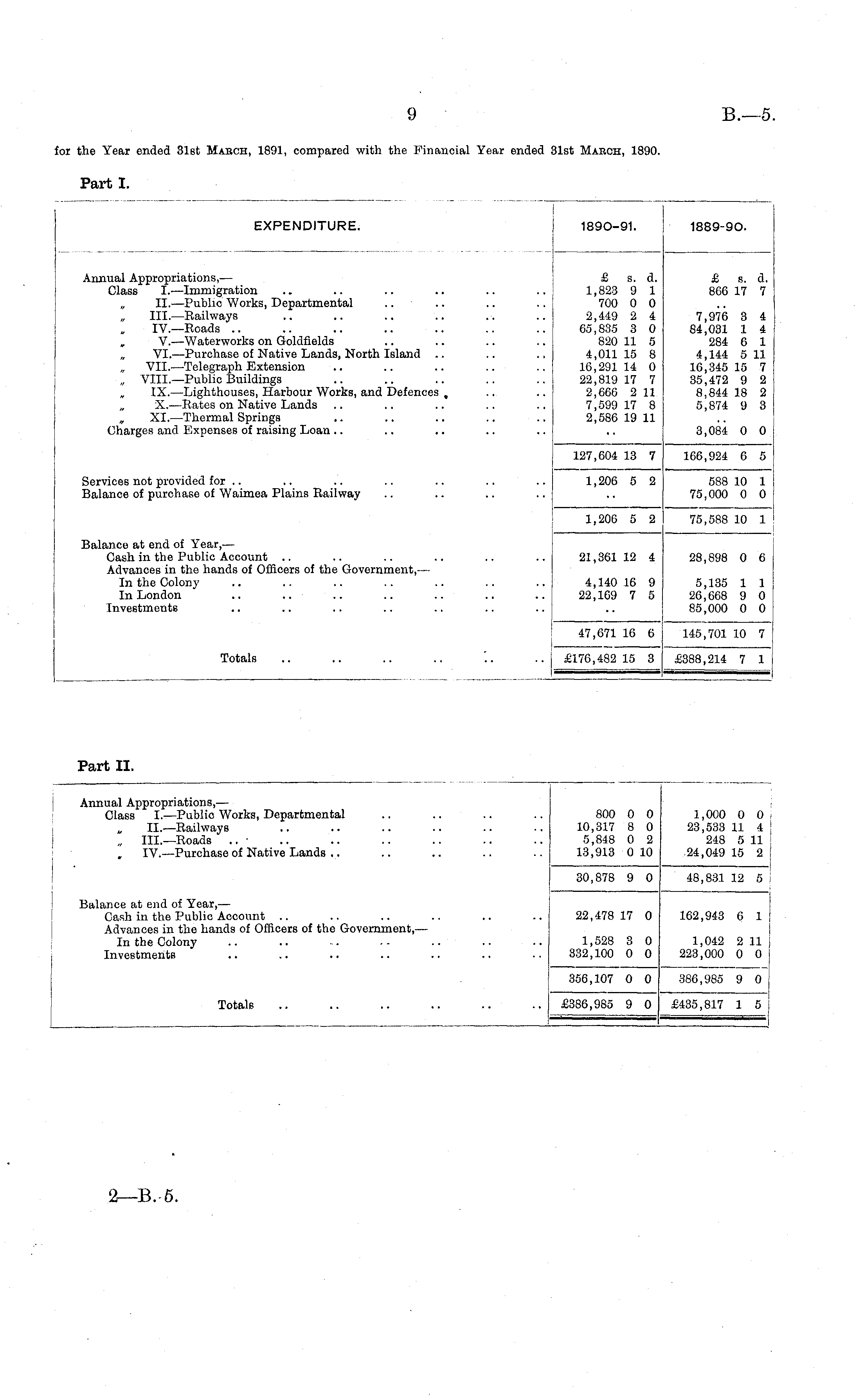 Part I. FYPFNiniTIJRF tAKfclMUI I UKfc. EXPENDITURE. 189O-91. 1889-9O. Annual Appropriations, — Class I.—Immigration „ II, —Public Works, Departmental „ III.—Eailways IV.—Roads .. „ V. —Waterworks on Goldfields VI. —Purchase of Native Lands, North Island .. VII. —Telegraph Extension „ VIII.—Public Buildings „ IX.—Lighthouses, Harbour Works, and Defences , „ X.—Rates on Native Lands XL—Thermal Springs Charges and Expenses of raising Loan .. £ s. d. 1,823 9 1 700 0 0 2,449 2 4 65,835 3 0 820 11 5 4,011 15 8 16,291 14 0 22,819 17 7 2,666 2 11 7,599 17 8 2,586 19 11 £ s. d. 866 17 7 7,976 3 4 84,031 1 i 284 6 1 4,144 5 11 16,345 15 7 35,472 9 2 8,844 18 2 5,874 9 3 3,084 0 0 Servicee not provided for Balance of purchase of Waimea Plains Railway 127,604 13 7 166,924 6 5 1,206 5 2 588 10 1 75,000 0 0 Balance at end of Year, — Cash in the Public Account Advances in the hands of Officers of the Government, — In the Colony In London Investments 1,206 5 2 75,588 10 1 21,361 12 4 28,898 0 6 4,140 16 9 22,169 7 5 5,135 1 1 26,668 9 0 85,000 0 0 Totals 47,671 16 6 145,701 10 7 £176,482 15 3 £388,214 7 1 Part II. Annual Appropriations, — Class I.—Public Works, Departmental „ II.—Railways „ III.—Roads .. ■ , IV.—Purchase of Native Lands 800 0 0 10,317 8 0 5,848 0 2 13,913 0 10 1,000 0 0 23,533 11 4 248 5 11 24,049 15 2 30,878 9 0 48,831 12 5 Balance at end of Year, — Cash in the Public Account Advances in the hands of Officers of the Government, — In the Colony Investments 22,478 17 0 162,943 6 1 1,528 3 0 332,100 0 0 1,042 2 11 223,000 0 0 i 356,107 0 0 386,985 9 0 Totals £386,985 9 0 £435,817 1 5