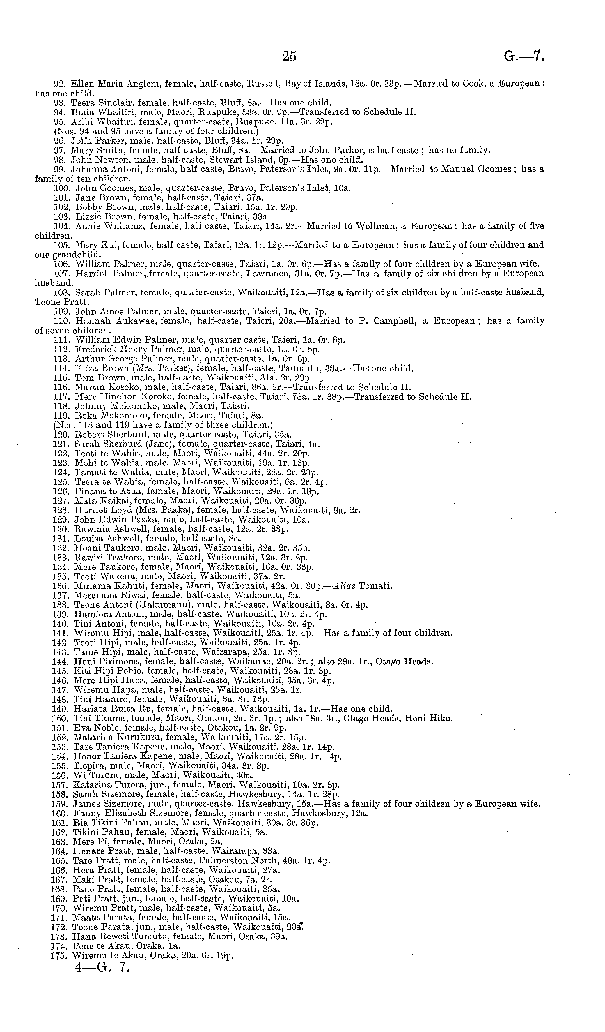 92. Eilen Maria Anglem, female, half-caste, Russell, Bay of Islands, 18a. Or. 33p. — Married to Cook, a European ; has one child. 93. Teera Sinclair, female, half-caste, Bluff, Ba.—Has one child. 94. Ihaia Whaitiri, male, Maori, Ruapuke, 83a. Or. 9p.—Transferred to Schedule H. 95. Arihi Whaitiri, female, quarter-caste, Ruapuke, 11a. 3r. 22p. (Nos. 94 and 95 have a family of four children.) 96. Jolih Parker, male, half-caste, Bluff, 34a. lr. 29p. 97. Mary Smith, female, half-caste, Bluff, Ba.—Married to John Parker, a half-caste ; has no family. 98. John Newton, male, half-caste, Stewart Island, 6p.—Has one child. 99. Johanna Antoni, female, half-caste, Bravo, Paterson's Inlet, 9a. Or. lip.—Married to Manuel Goomes ; has a family of ten children. 100. John Goomes, male, quarter-caste, Bravo, Paterson's Inlet, 10a. 101. Jane Brown, female, half-caste, Taiari, 37a. 102. Bobby Brown, male, half-caste, Taiari, 15a. lr. 29p. 103. Lizzie Brown, female, half-caste, Taiari, 38a. 104. Annie Williams, female, half-caste, Taiari, 14a. 2r. —Married to Wellman, a European; has a family of five children. 105. Mary Kui, female, half-caste, Taiari, 12a. lr. 12p.—Married to a European ; has a family of four childron and one grandchild. 106. William Palmer, male, quarter-caste, Taiari, la. Or. 6p.—Has a family of four children by a European wife. 107. Harriet Palmer, female, quarter-caste, Lawrence, 31a. Or. 7p.-—Has a family of six children by a European husband. 108. Sarah Palmer, female, quarter-caste, Waikouaiti, 12a.—Has a family of six children by a half-caste husband, Teone Pratt. 109. John Amos Palmer, male, quarter-caste, Taieri, la. Or. 7p. 110. Hannah Aukawae, female, half-caste, Taieri, 20a. —Married to P. Campbell, a European ; has a family of seven children. 111. William Edwin Palmer, male, quarter-caste, Taieri, la. Or. 6p. 112. Frederick Henry Palmer, male, quarter-caste, la. Or. 6p. 113. Arthur George Palmer, male, quarter-caste, la. Or. 6p. 114. Eliza Brown (Mrs. Parker), female, half-casto, Taumutu, 38a. —Has one child. 115. Tom Brown, male, half-caste, Waikouaiti, 31a. 2r. 29p. , 116. Martin Koroko, male, half-caste, Taiari, 86a. 2r. —Transferred to Schedule H. 117. Mere Hinchou Koroko, female, half-caste, Taiari, 78a. lr. 38p.—Transferred to Schedule H. 118. Johnny Mokomoko, male, Maori, Taiari. 119. Roka Mokomoko, female, Maori, Taiari, Ba. (Nos. 118 and 119 have a family of three children.) 120. Robert Sherburd, male, quarter-caste, Taiari, 35a. 121. Sarah Sherburd (Jane), female, quarter-caste, Taiari, 4a. 122. Teoti te Wahia, male, Maori, Waikouaiti, 44a. 2r. 20p. 123. Mohi te Wahia, male, Maori, Waikouaiti, 19a. lr. 13p. 124. Tamati te Wahia, male, Maori, Waikouaiti, 28a. 2r. 23p. 125. Teera te Wahia, female, half-caste, Waikouaiti, 6a. 2r. 4p. 126. Pinana te Atua, female, Maori, Waikouaiti, 29a. lr. 18p. 127. Mata Kaikai, female, Maori, Waikouaiti, 20a. Or. 36p. 128. Harriet Loyd (Mrs. Paaka), female, half-caste, Waikouaiti, 9a. 2r. 129. John Edwin Paaka, male, half-caste, Waikouaiti, 10a. 130. Rawinia Ashwell, female, half-caste, 12a. 2r. 33p. 131. Louisa Ashwell, female, half-caste, Ba. 132. Hoani Taukoro, male, Maori, Waikouaiti, 32a. 2r. 35p. 133. Rawiri Taukoro, male, Maori, Waikouaiti, 12a. 3r. 2p. 134. Mere Taukoro, female, Maori, Waikouaiti, 16a. Or. 33p. 135. Teoti Wakena, male, Maori, Waikouaiti, 37a. 2r. 136. Miriama Kahuti, female, Maori, Waikouaiti, 42a. Or. 30p.— Alias Tomati. 137. Merehana Riwai, female, half-caste, Waikouaiti, sa. 138. Teone Antoni (Hakumanu), male, half-caste, Waikouaiti, Ba. Or. 4p. 139. Hamiora Antoni, male, half-caste, Waikouaiti, 10a. 2r. 4p. 140. Tini Antoni, female, half-caste, Waikouaiti, 10a. 2r. 4p. 141. Wiremu Hipi, male, half-caste, Waikouaiti, 25a. lr. 4p.—Has a family of four children. 142. Teoti Hipi, male, half-caste, Waikouaiti, 25a. lr. 4p. 143. Tame Hipi, male, half-caste, Wairarapa, 25a. lr. 3p. 144. Heni Pirimona, female, half-caste, Waikanae, 20a. 2r. ; also 29a. lr., Otago Heads. 145. Kiti Hipi Pohio, female, half-caste, Waikouaiti, 23a. lr. 3p. 146. Mere Hipi Hapa, female, half-caste, Waikouaiti, 35a. 3r. 4p. 147. Wiremu Hapa, male, half-caste, Waikouaiti, 25a. lr. 148. Tini Hamiro, female, Waikouaiti, 3a. 3r. 13p. 149. Hariata Ruita Ru, female, half-caste, Waikouaiti, la. lr.—Has one child. 150. Tini Titama, female, Maori, Otakou, 2a. 3r. lp. ; also 18a. 3r., Otago Heads, Heni Hiko. 151. Eva Noble, female, half-caste, Otakou, la. 2r. 9p. 152. Matarina Kurukuru, female, Waikouaiti, 17a. 2r. 15p. 153. Tare Taniera Kapene, male, Maori, Waikouaiti, 28a. lr. 14p. 154. Honor Taniera Kapene, male, Maori, Waikouaiti, 28a. lr. 14p. 155. Tiopira, male, Maori, Waikouaiti, 34a. 3r. 3p. 156. Wi Turora, male, Maori, Waikouaiti, 30a. 157. Katarina Turora, jun., female, Maori, Waikouaiti, 10a. 2r. 3p. 158. Sarah Sizemore, female, half-caste, Hawkesbury, 14a. lr. 28p. 159. James Sizemore, male, quarter-caste, Hawkesbury, 15a.—Has a family of four children by a European wife. 160. Fanny Elizabeth Sizemore, female, quarter-caste, Hawkesbury, 12a. 161. Ria Tikini Pahau, male, Maori, Waikouaiti, 30a. 3r. 36p. 162. Tikini Pahau, female, Maori, Waikouaiti, sa. 163. Mere Pi, female, Maori, Oraka, 2a. 164. Henare Pratt, male, half-caste, Wairarapa, 33a. 165. Tare Pratt, male, half-caste, Palmerston North, 48a. lr. 4p. 166. Hera Pratt, female, half-caste, Waikouaiti, 27a. 167. Maki Pratt, female, half-caste, Otakou, 7a. 2r. 168. Pane Pratt, female, half-caste, Waikouaiti, 35a. 169. Peti Pratt, jun., female, half-caste, Waikouaiti, 10a. 170. Wiremu Pratt, male, half-caste, Waikouaiti, sa. 171. Maata Parata, female, half-caste, Waikouaiti, 15a. 172. Teone Parata, jun., male, half-caste, Waikouaiti, 20a. 173. Hana Reweti Tumutu, female, Maori, Oraka, 39a. 174. Pene te Akau, Oraka, la. 175. Wiremu te Akau, Oraka, 20a. Or. 19p. 4—G. 7.