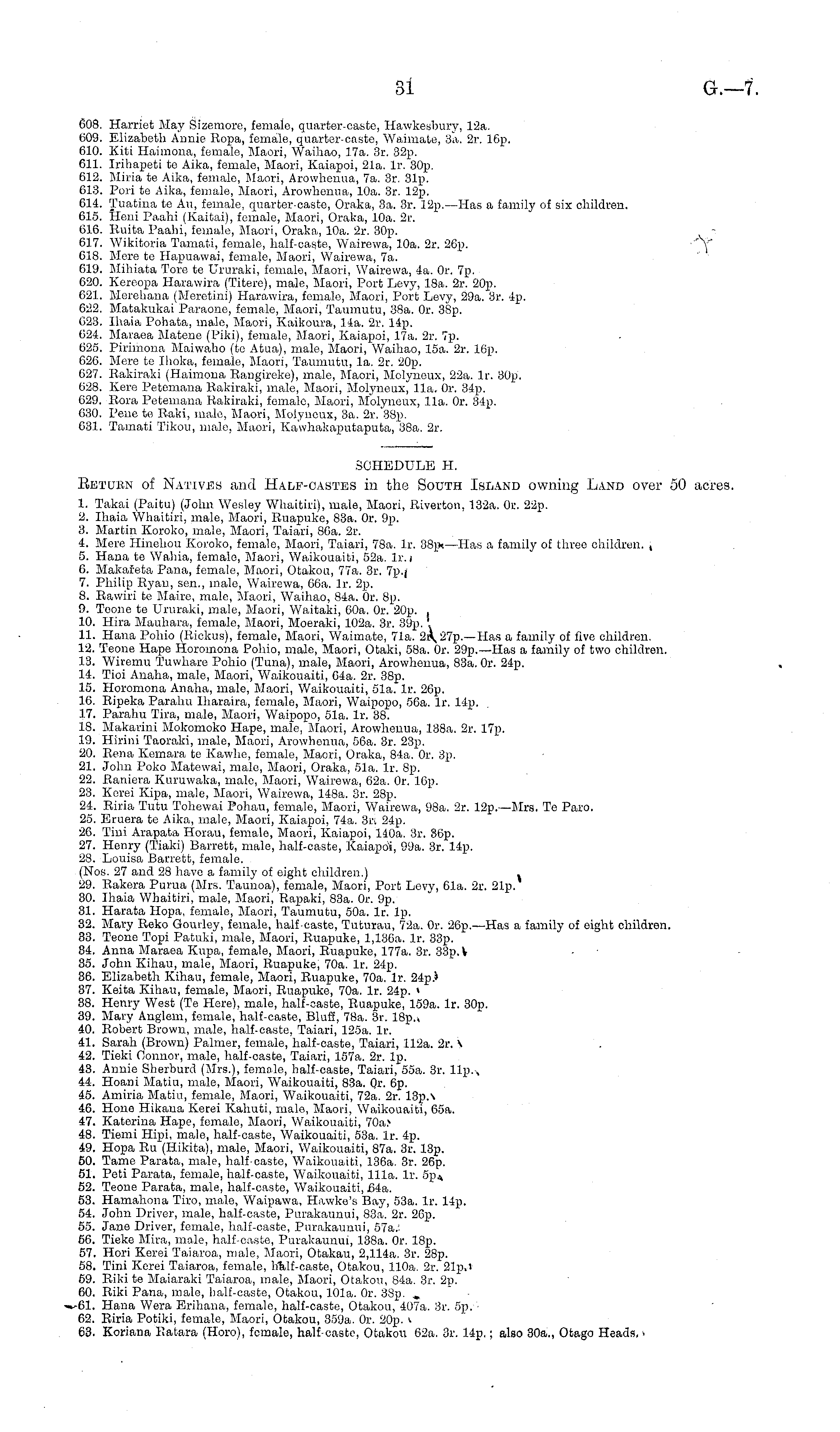 608. Harriet May Sizemore, female, quarter-caste, Hawkesbury, 12a. 609. Elizabeth Annie Ropa, female, quarter-caste, Waimate, 3a. 2r. 16p. 610. Kiti Haimona, fomale, Maori, Waihao, 17a. 3r. 32p. 611. Irihapeti to Aika, female, Maori, Kaiapoi, 21a. lr. 30p. 612. Miria to Aika, female, Maori, Arowhenua, 7a. 3r. 31p. 613. Pori te Aika, female, Maori, Arowhenua, 10a. 3r. 12p. 614. Tuatina te Au, female, quarter-caste, Oraka, 3a. 3r. 12p.—Has a family of six children. 615. Heni Paahi (Kaitai), female, Maori, Oraka, 10a. 2r. 616. Ruita Paahi, female, Maori, Oraka, 10a. 2r. 30p. - 617. Wikitoria Tamati, female, half-caste, Wairewa, 10a. 2r. 26p. 618. Mere te Hapuawai, female, Maori, Wairewa, 7a. 619. Mihiata Tore te Ururaki, female, Maori, Wairewa, 4a. Or. 7p. 620. Kereopa Harawira (Titero), male, Maori, Port Levy, 18a. 2r. 20p. 621. Merehana (Merotini) Harawira, fomale, Maori, Port Levy, 29a. 3r. 4p. 622. Matakukai Paraone, female, Maori, Taumutu, 38a. Or. 88p. 623. Ihaia Pohata, malo, Maori, Kaikoura, 14a. 2r. 14p. 624. Maraea Matene (Piki), female, Maori, Kaiapoi, 17a. 2r. 7p. 625. Pirimona Maiwaho (te Atua), male, Maori, Waihao, 15a.'2r. Hip. 626. Mere te Ihoka, female, Maori, Taumutu, la. 2r. 20p. 627. Rakiraki (Haimona Rangireke), male, Maori, Molyneux, 22a. lr. 30p. 628. Kere Petemana Rakiraki, male, Maori, Molyneux, 11a. Or. 34]). 629. Rora Petemana Rakiraki, female, Maori, Molyneux, 11a. Or. 34p. 630. Pene to Raki, male, Maori, Molyneux, 3a. 2r. 38p. 631. Tamati Tikou, malo, Maori, Kawhakaputaputa, 38a. 2r.