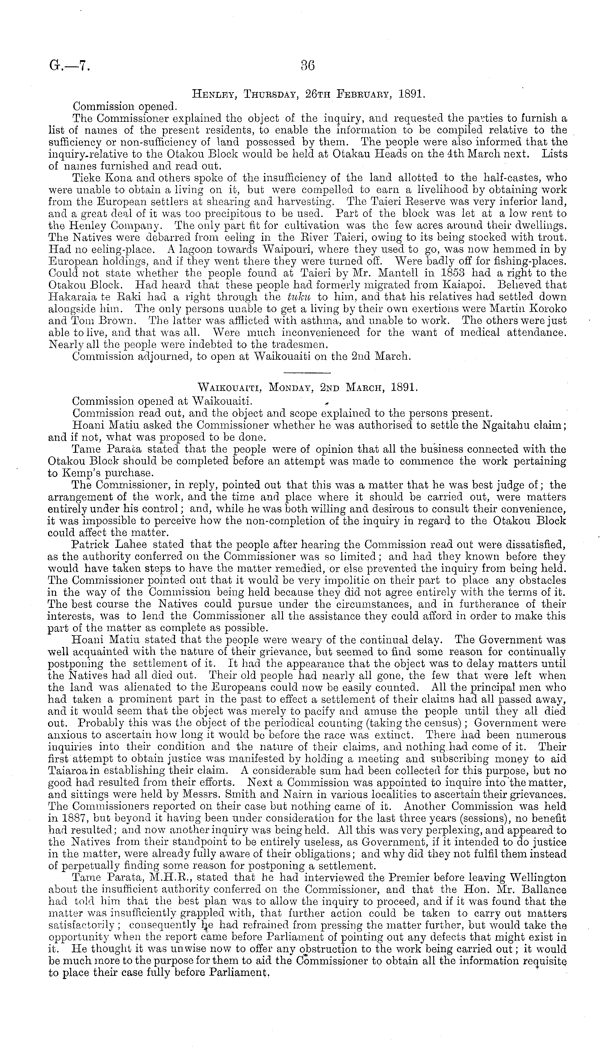 Waikouaiti, Monday, 2nd Maech, 1891. Commission opened at Waikouaiti. Commission read out, and the object and scope explained to the persons present. Hoani Matiu asked the Commissioner whether he was authorised to settle the Ngaitahu claim; and if not, what was proposed to be done. Tame Parata stated that the people were of opinion that all the business connected with the Otakou Block should be completed before an attempt was made to commence the work pertaining to Kemp's purchase. The Commissioner, in reply, pointed out that this was a matter that he was best judge of; the arrangement of the work, and the time and place where it should be carried out, were matters entirely under his control; and, while he was both willing and desirous to consult their convenience, it was impossible to perceive how the non-completion of the inquiry in regard to the Otakou Block could affect the matter. Patrick Lahee stated that the people after hearing the Commission read out were dissatisfied, as the authority conferred on the Commissioner was so limited; and had they known before they would have taken steps to have the matter remedied, or else prevented the inquiry from being held. The Commissioner pointed out that it would be very impolitic on their part to place any obstacles in the way of the Commission being held because they did not agree entirely with the terms of it. The best course the Natives could pursue under the circumstances, and in furtherance of their interests, was to lend the Commissioner all the assistance they could afford in order to make this part of the matter as complete as possible. Hoani Matiu stated that the people were weary of the continual delay. The Government was well acquainted with the nature of their grievance, but seemed to find some reason for continually postponing the settlement of it. It had the appearance that the object was to delay matters until the Natives had all died out. Their old people had nearly all gone, the few that were left when the land was alienated to the Europeans could now be easily counted. All the principal men who had taken a prominent part in the past to effect a settlement of their claims had all passed away, and it would seem that the object was merely to pacify and amuse the people until they all died out. Probably this was the object of the periodical counting (taking the census); Government were anxious to ascertain how long it would be before the race was extinct. There had been numerous inquiries into their condition and the nature of their claims, and nothing had come of it. Their first attempt to obtain justice was manifested by holding a meeting and subscribing money to aid Taiaroa in establishing their claim. A considerable sum had been collected for this purpose, but no good had resulted from their efforts. Next a Commission was appointed to inquire into the matter, and sittings were held by Messrs. Smith and Nairn in various localities to ascertain their grievances. The Commissioners reported on their case but nothing came of it. Another Commission was held in 1887, but beyond it having been under consideration for the last three years (sessions), no benefit had resulted; and now another inquiry was being held. All this was very perplexing, and appeared to the Natives from their standpoint to be entirely useless, as Government, if it intended to do justice in the matter, were already fully aware of their obligations; and why did they not fulfil them instead of perpetually finding some reason for postponing a settlement. Tame Parata, M.H.8., stated that he had interviewed the Premier before leaving Wellington about the insufficient authority conferred on the Commissioner, and that the Hon. Mr. Ballance had told him that the best plan was to allow the inquiry to proceed, and if it was found that the matter was insufficiently grappled with, that further action could be taken to carry out matters satisfactorily ; consequently he had refrained from pressing the matter further, but would take the opportunity when the report came before Parliament of pointing out any defects that might exist in it. He thought it was unwise now to offer any obstruction to the work being carried out; it would be much more to the purpose for them to aid the Commissioner to obtain all the information requisite to place their case fully before Parliament.