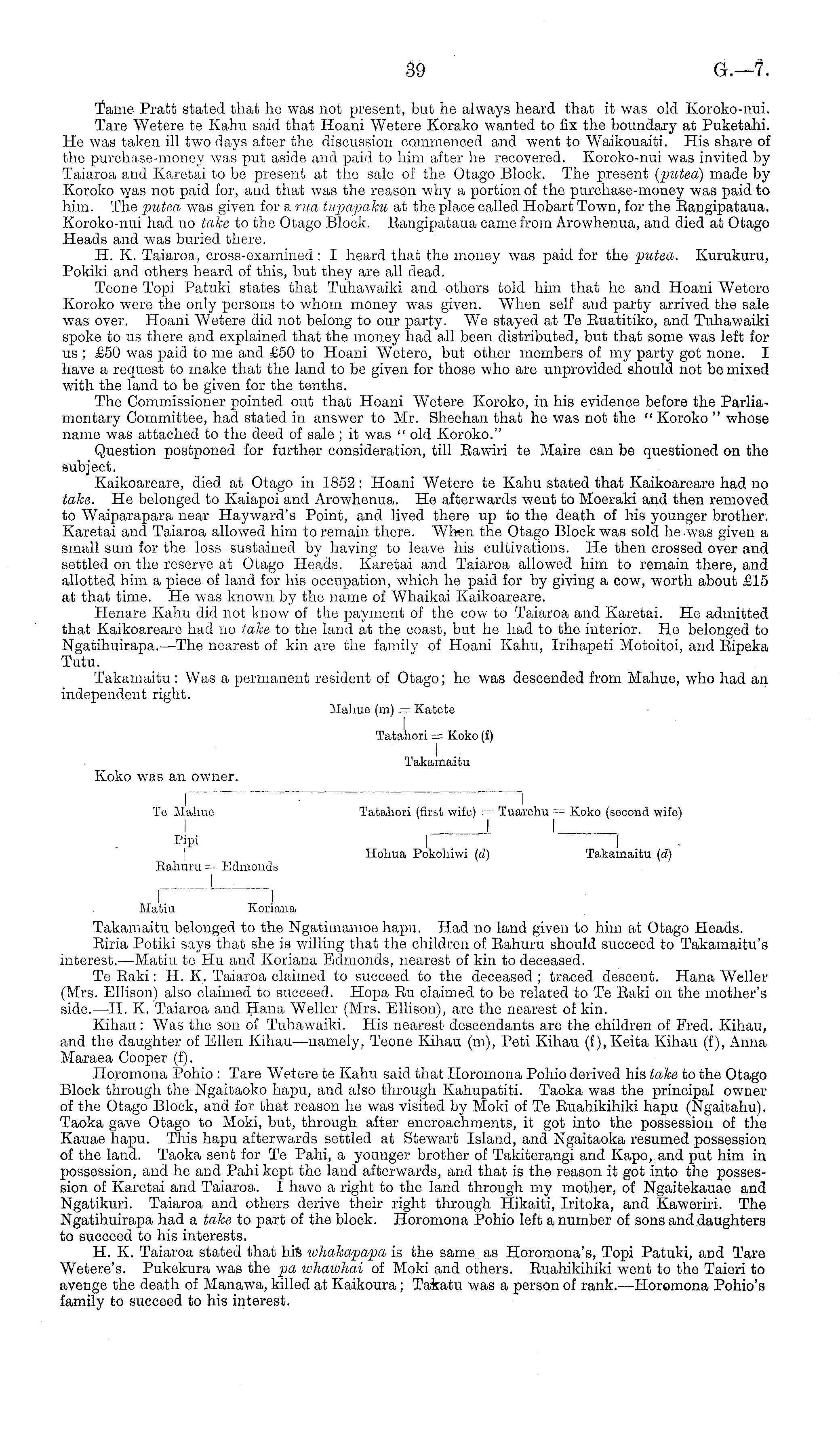 Tame Pratt stated that he was not present, but he always heard that it was old Koroko-nui. Tare Wetere te Kahu said that Hoani Wetere Korako wanted to fix the boundary at Puketahi. He was taken ill two days after the discussion commenced and went to Waikouaiti. His share of the purchase-money was put aside and paid to him after he recovered. Koroko-nui was invited by Taiaroa and Karetai to be present at the sale of the Otago Block. The present (putea) made by Koroko was not paid for, and that was the reason why a portion of the purchase-money was paid to him. The putea was given for a run tupapaku at the place called Hobart Town, for the Rangipataua. Koroko-nui had no take to the Otago Block. Rangipataua came from Arowhenua, and died at Otago Heads and was buried there. H. K. Taiaroa, cross-examined : I heard that the money was paid for the putea. Kurukuru, Pokiki and others heard of this, but they are all dead. Teone Topi Patuki states that Tuhawaiki and others told him that he and Hoani Wetere Koroko were the only persons to whom money was given. When self and party arrived the sale was over. Hoani Wetere did not belong to our party. We stayed at Te Buatitiko, and Tuhawaiki spoke to us there and explained that the money had all been distributed, but that some was left for us ; £50 was paid to me and £50 to Hoani Wetere, but other members of my party got none. I have a request to make that the land to be given for those who are unprovided should not be mixed with the land to be given for the tenths. The Commissioner pointed out that Hoani Wetere Koroko, in his evidence before the Parliamentary Committee, had stated in answer to Mr. Sheehan that he was not the "Koroko " whose name was attached to the deed of sale ; it was " old Koroko." Question postponed for further consideration, till Bawiri te Maire can be questioned on the subject. Kaikoareare, died at Otago in 1852: Hoani Wetere te Kahu stated that Kaikoareare had no take. He belonged to Kaiapoi and Arowhenua. He afterwards went to Moeraki and then removed to Waiparapara near Hayward's Point, and lived there up to the death of his younger brother. Karetai and Taiaroa allowed him to remain there. When the Otago Block was sold he-was given a small sum for the loss sustained by having to leave his cultivations. He then crossed over and settled on the reserve at Otago Heads. Karetai and Taiaroa allowed him to remain there, and allotted him a piece of land for his occupation, which he paid for by giving a cow, worth about £15 at that time. He was known by the name of Whaikai Kaikoareare. Henare Kahu did not know of the payment of the cow to Taiaroa and Karetai. He admitted that Kaikoareare had no take to the land at the coast, but he had to the interior. He belonged to Ngatihuirapa.—The nearest of kin are the family of Hoani Kahu, Irihapeti Motoitoi, and Bipeka Tutu. Takamaitu : Was a permanent resident of Otago; he was descended from Mahue, who had an independent right. Mahue (m) _= Katete Tatahori = Koko (f) Takamaitu Koko was an owner. r~ ~~ ' ~ i To Mahue Tatahori (first wife) = Tuarehu : = Koko (second wife) Pipi | | Hohua Pokohiwi (d) Takamaitu (d) Rahuru = Edmonds _____ I ~ I Matiu Koriana Takamaitu belonged to the Ngatimamoe hapu. Had no land given to him at Otago Heads. Biria Potiki says that she is willing that the children of Rahuru should succeed to Takamaitu's interest. —Matiu te Hu and Koriana Edmonds, nearest of kin to deceased. Te Raki: H. K. Taiaroa claimed to succeed to the deceased ; traced descent. Hana Weller (Mrs. Ellison) also claimed to succeed. Hopa Ru claimed to be related to Te Raki on the mother's side. —H. K. Taiaroa and Hana Weller (Mrs. Ellison), are the nearest of kin. Kihau : Was the son of Tuhawaiki. His nearest descendants are the children of Fred. Kihau, and the daughter of Ellen Kihau—namely, Teone Kihau (m), Peti Kihau (f), Keita Kihau (f), Anna Maraea Cooper (f). Horomona Pohio : Tare Wetere te Kahu said that Horomona Pohio derived his take to the Otago Block through the Ngaitaoko hapu, and also through Kahupatiti. Taoka was the principal owner of the Otago Block, and for that reason he was visited by Moki of Te Buahikihiki hapu (Ngaitahu). Taoka gave Otago to Moki, but, through after encroachments, it got into the possession of the Kauae hapu. This hapu afterwards settled at Stewart Island, and Ngaitaoka resumed possession of the land. Taoka sent for Te Pahi, a younger brother of Takiterangi and Kapo, and put him in possession, and he and Pahi kept the land afterwards, and that is the reason it got into the possession of Karetai and Taiaroa. I have a right to the land through my mother, of Ngaitekauae and Ngatikuri. Taiaroa and others derive their right through Hikaiti, Iritoka, and Kaweriri. The Ngatihuirapa had a take to part of the block. Horomona Pohio left a number of sons and daughters to succeed to his interests. H. K. Taiaroa stated that his whakapapa is the same as Horomona's, Topi Patuki, and Tare Wetere's. Pukekura was the pa whawhai of Moki and others. Buahikihiki went to the Taieri to avenge the death of Manawa, killed at Kaikoura; Takatu was a person of rank.—Horomona Bohio's family to succeed to his interest.