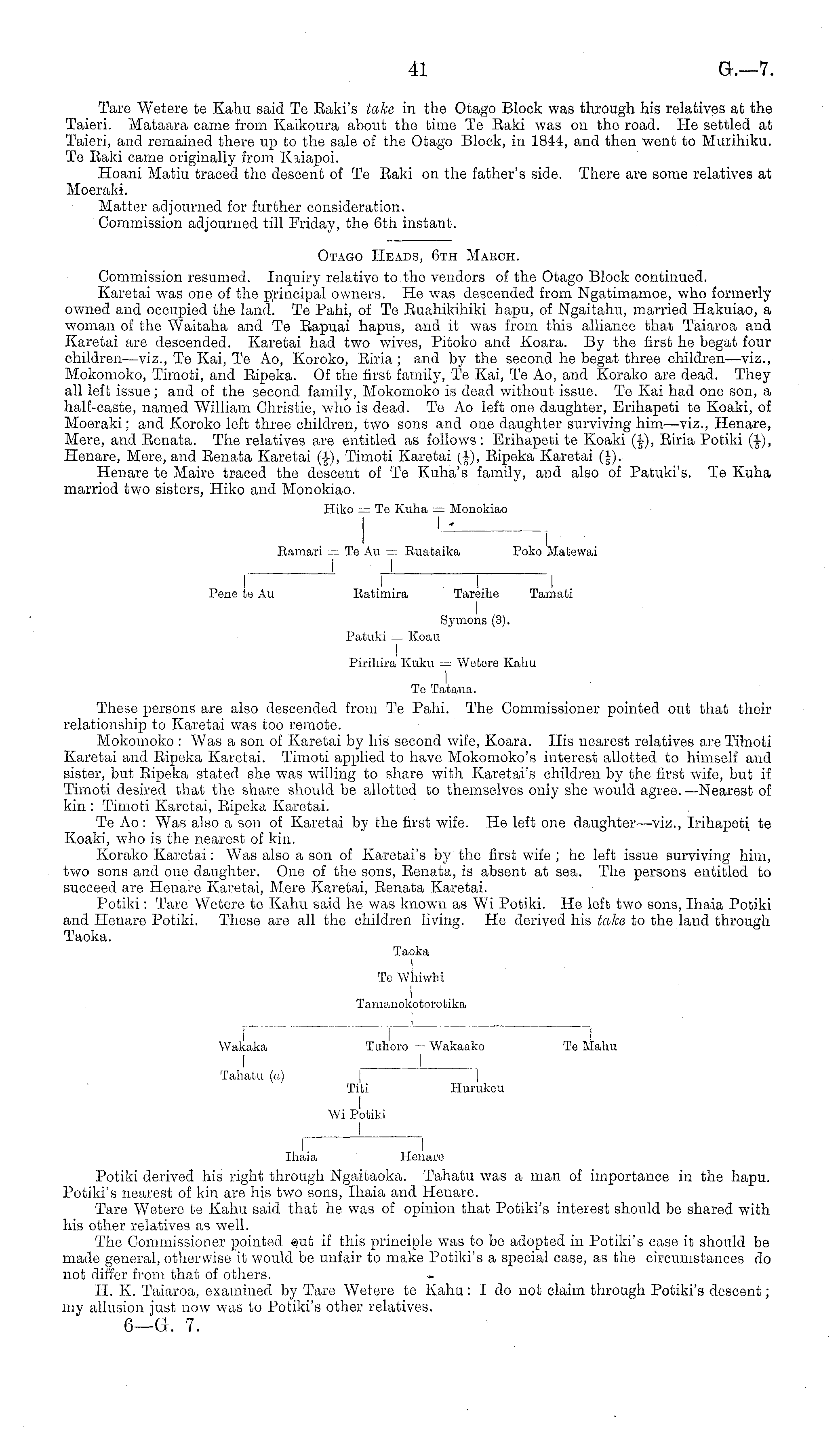 Tare Wetere te Kahu said Te Raki's lake in the Otago Block was through his relatives at the Taieri. Mataara came from Kaikoura about the time Te Raki was on the road. He settled at Taieri, and remained there up to the sale of the Otago Block, in 18-44, and then went to Murihiku. Te Raki came originally from Kaiapoi. Hoani Matiu traced the descent of Te Raki on the father's side. There are some relatives at Moeraki. Matter adjourned for further consideration. Commission adjourned till Friday, the 6th instant.