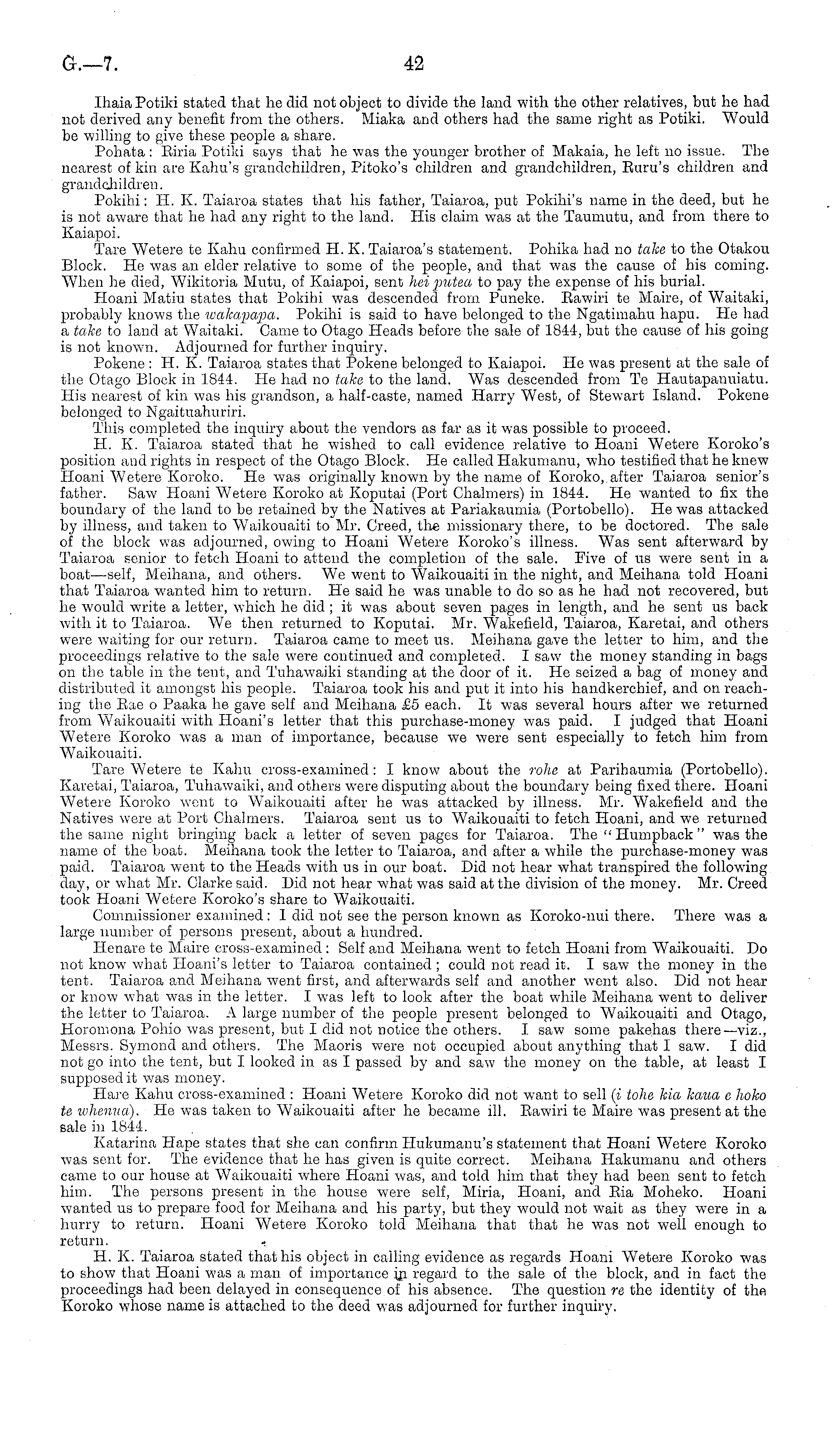 Ihaia Potiki stated that he did not object to divide the land with the other relatives, but he had not derived any benefit from the others. Miaka and others had the same right as Potiki. Would be willing to give these people a share. Pohata: Riria Potiki says that he was the younger brother of Makaia, he left no issue. The nearest of kin are Kahu's grandchildren, Pitoko's children and grandchildren, Buru's children and grandchildren. Pokihi: H. K. Taiaroa states that his father, Taiaroa, put Pokihi's name in the deed, but he is not aware that he had any right to the land. His claim was at the Taumutu, and from there to Kaiapoi. Tare Wetere te Kahu confirmed H. K. Taiaroa's statement. Pohika had no take to the Otakou Block. He was an elder relative to some of the people, and that was the cause of his coming. When he died, Wikitoria Mutu, of Kaiapoi, sent hei putea to pay the expense of his burial. Hoani Matiu states that Bokihi was descended from Puneke. Rawiri te Maire, of Waitaki, probably knows the ivakapapa. Pokihi is said to have belonged to the Ngatimahu hapu. He had a take to land at Waitaki. Came to Otago Heads before the sale of 1844, but the cause of his going is not known. Adjourned for further inquiry. Pokene :H. K. Taiaroa states that Pokene belonged to Kaiapoi. He was present at the sale of the Otago Block in 1844. He had no take to the land. Was descended from Te Hautapanuiatu. His nearest of kin was his grandson, a half-caste, named Harry West, of Stewart Island. Pokene belonged to Ngaituahuriri. This completed the inquiry about the vendors as far as it was possible to proceed. H. K. Taiaroa stated that he wished to call evidence relative to Hoani Wetere Koroko's position and rights in respect of the Otago Block. He called Hakumanu, who testified that he knew Hoani Wetere Koroko. He was originally known by the name of Koroko, after Taiaroa senior's father. Saw Hoani Wetere Koroko at Koputai (Port Chalmers) in 1844. He wanted to fix the boundary of the land to be retained by the Natives at Pariakaumia (Portobello). He was attacked by illness, and taken to Waikouaiti to Mr. Creed, tlie missionary there, to be doctored. The sale of the block was adjourned, owing to Hoani Wetere Koroko's illness. Was sent afterward by Taiaroa senior to fetch Hoani to attend the completion of the sale. Five of us were sent in a boat—self, Meihana, and others. We went to Waikouaiti in the night, and Meihana told Hoani that Taiaroa wanted him to return. He said he was unable to do so as he had not recovered, but he would write a letter, which he did; it was about seven pages in length, and he sent us back with it to Taiaroa. We then returned to Koputai. Mr. Wakefield, Taiaroa, Karetai, and others were waiting for our return. Taiaroa came to meet us. Meihana gave the letter to him, and the proceedings relative to the sale were continued and completed. I saw the money standing in bags on the table in the tent, and Tuhawaiki standing at the door of it. He seized a hag of money and distributed it amongst his people. Taiaroa took his and put it into his handkerchief, and on reaching the Bae o Paaka he gave self and Meihana £5 each. It was several hours after we returned from Waikouaiti with Hoani's letter that this purchase-money was paid. I judged that Hoani Wetere Koroko was a man of importance, because we were sent especially to fetch him from Waikouaiti. Tare Wetere te Kahu cross-examined: I know about the rohe at Parihaumia (Portobello). Karetai, Taiaroa, Tuhawaiki, and others were disputing about the boundary being fixed there. Hoani W'etere Koroko went to Waikouaiti after he was attacked by illness. Mr. Wakefield and the Natives were at Port Chalmers. Taiaroa sent us to Waikouaiti to fetch Hoani, and we returned the same night bringing back a letter of seven pages for Taiaroa. The "Humpback" was the name of the boat. Meihana took the letter to Taiaroa, and after a while the purchase-money was paid. Taiaroa went to the Heads with us in our boat. Did not hear what transpired the following day, or what Mr. Clarke said. Did not hear what was said at the division of the money. Mr. Creed took Hoani Wetere Koroko's share to Waikouaiti. Commissioner examined: I did not see the person known as Koroko-nui there. There was a large number of persons present, about a hundred. Henare te Maire cross-examined : Self and Meihana went to fetch Hoani from Waikouaiti. Do not know what Hoani's letter to Taiaroa contained ; could not read it. I saw the money in the tent. Taiaroa and Meihana went first, and afterwards self and another went also. Did not hear or know what was in the letter. I was left to look after the boat while Meihana went to deliver the letter to Taiaroa. A large number of the people present belonged to Waikouaiti and Otago, Horoinona Pohio was present, but I did not notice the others. I saw some pakehas there—viz., Messrs. Symond and others. The Maoris were not occupied about anything that I saw. I did not go into the tent, but I looked in as I passed by and saw the money on the table, at least I supposed it was money. Hare Kahu cross-examined : Hoani Wetere Koroko did not want to sell (i tohe kia kaua c hoko te ivhenua). He was taken to Waikouaiti after he became ill. Bawiri te Maire was present at the sale in 1844. Katarina Hape states that she can confirm Hukumanu's statement that Hoani Wetere Koroko was sent for. The evidence that he has given is quite correct. Meihana Hakumanu and others came to our house at Waikouaiti where Hoani was, and told him that they had been sent to fetch him. The persons present in the house were self, Miria, Hoani, and Bia Moheko. Hoani wanted us to prepare food for Meihana and his party, but they would not wait as they were in a hurry to return. Hoani Wetere Koroko told Meihana that that he was not well enough to return. H. K. Taiaroa stated that his object in calling evidence as regards Hoani Wetere Koroko was to show that Hoani was a man of importance in r