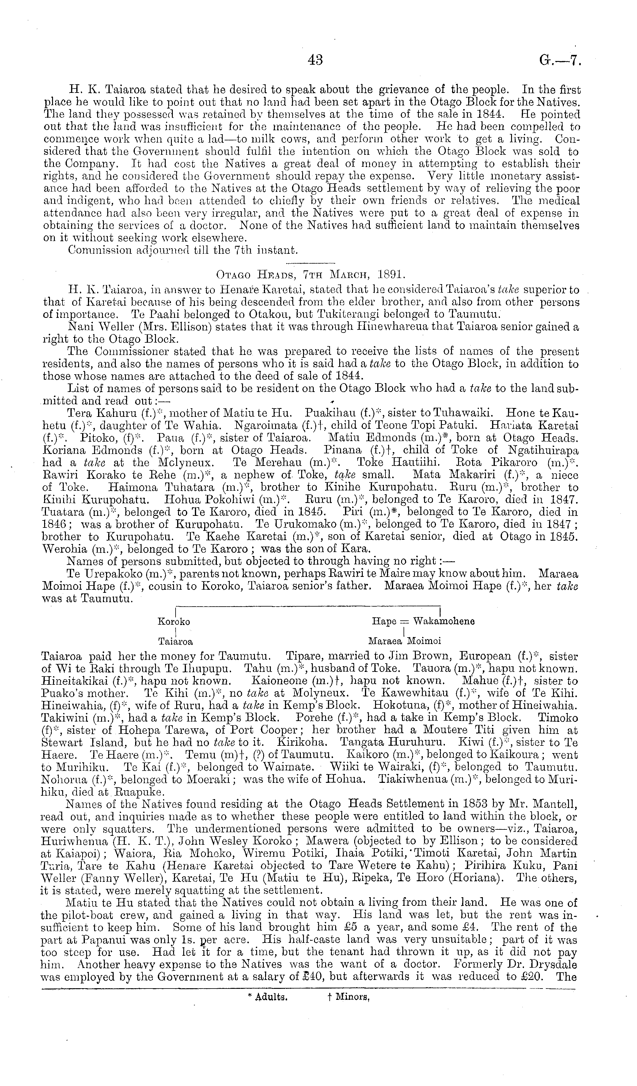 Otago Heads, 7th Maeoh, 1891. 11. K. Taiaroa, in answer to Henare Karetai, stated that lie considered Taiaroa's lake superior to that of Karetai because of his being descended from the elder brother, and also from other persons of importance. Te Paahi belonged to Otakou, but Tukiterangi belonged to Taumutu. Nani Weller (Mrs. Ellison) states that it was through Hinewhareua that Taiaroa senior gained a right to the Otago Block. The Commissioner stated that he was prepared to receive the lists of names of the present residents, and also the names of persons who it is said had a take to the Otago Block, in addition to those whose names are attached to the deed of sale of 1844. List of names of persons said to be resident on the Otago Block who had a take to the land submitted and read out:— Tera Kahuru (f .)*, mother of Matiu te Hit. Puakihau (f.)*, sister to Tuhawaiki. Hone te Kauhetu (f.) :|:, daughter of Te Wahia. Ngaroimata (f.)|, child of Teone Topi Patuki. Hariata Karetai (f.)*. Pitoko, ({)■•'■. Pana (f.)*, sister of Taiaroa. Matiu Edmonds (in.)*, born at Otago Heads. Koriana Edmonds (f.)*, born at Otago Heads. Pinana (f.)f, child of Toke of Ngatihuirapa had a take at the Molyneux. Te Merehau (m.)*. Toke Hautiihi. Bota Pikaroro (m.).*. Rawiri Korako te Belie (m.)*, a nephew of Toke, take small. Mata Makariri (f.) :l!, a niece of Toke. Haimona Tuhatara (m.)*, brother to Kinihe Kurupohatu. Buru (m.)*, brother to Kinihi Kurupohatu. Hohua Pokohiwi (__.)*. Buru (m.)*, belonged to Te Karoro, died in 1847. Tuatara (m.)*, belonged to Te Karoro, died in 1845. Piri (m.)*, belonged to Te Karoro, died in 1846; was a brother of Kurupohatu. Te Urukomako (m.)*, belonged to Te Karoro, died in 1847 ; brother to Kurupohatu. Te Kaehe Karetai (m,)*, son of Karetai senior, died at Otago in 1845. Werohia (m.);;:, belonged to Te Karoro ; was the son of Kara. Names of persons submitted, but objected to through having no right:— Te Urepakoko (m.)*, parents not known, perhaps Bawiri te Maire may know about him. Maraea Moimoi Hape (f.):;:, cousin to Koroko, Taiaroa senior's father. Maraea Moimoi Hape (f.)*, her take was at Taumutu. Koroko Hape = Wakamohene I I Taiaroa Maraea Moimoi Taiaroa paid her the money for Taumutu. Tipare, married to Jim Brown, European (_.)*, sister of Wi te Baki through Te Ihupupu. Tahu (m.)*, husband of Toke. Tauora (m.)*, hapu not known. Hineitakikai (f.)*, hapu not known. Kaioneone (m.)f, hapu not known. Mahue (f.)t, sister to Puako's mother. Te Kihi (m.)*, no take at Molyneux. Te Kawewhitau (1)*, wife of Te Kihi. Hineiwahia, (f)*, wife of Buru, had a take in Kemp's Block. Hokotuna, (f)*, mother of Hineiwahia. Takiwini (m.)*, had a take in Kemp's Block. Porehe (f.)*, had a take in Kemp's Block. Timoko (f)*, sister of Hohepa Tarewa, of Port Cooper; her brother had a Moutere Titi given him at Stewart Island, but he had no take to it. Kirikoha. Tangata Huruhuru. Kiwi (f.):;;, sister to To Haere. Te Haere (m.)*. Temu (m)|, (?) of Taumutu. Kaikoro (m.)*, belonged to Kaikoura ; went to Murihiku. Te Kai (f.)*, belonged to Waimate. Wiiki te Wairaki, (f)*, belonged to Taumutu. Nohorua (_,)*, belonged to Moeraki; was the wife of Hohua. Tiakiwhenua (m.)*, belonged to Murihiku, died at Buapuke. Names of the Natives found residing at the Otago Heads Settlement in 1853 by Mr. Mantell, read out, and inquiries made as to whether these people were entitled to land within the block, or were only squatters. The undermentioned persons were admitted to be owners—viz., Taiaroa, Huriwhenua (H. K. T.), John Wesley Koroko ; Mawera (objected to by Ellison ; to be considered at Kaiapoi); Waiora, Ria Mohoko, Wiremu Botiki, Ihaia Potiki,' Timoti Karetai, John Martin Turia, Tare te Kahu (Henare Karetai objected to Tare Wetere te Kahu); Pirihira Kuku, Pani Weller (Fanny Weller), Karetai, Te Hu (Matiu te Hu), Bipeka, Te Horo (Horiana). The others, it is stated, were merely squatting at the settlement. Matiu te Hu stated that the Natives could not obtain a living from their land. He was one of the pilot-boat crew, and gained a living in that way. His land was let, but the rent was insufficient to keep him. Some of his land brought him £5 a year, and some £4. The rent of the part at Papanui was only Is. per acre. His half-caste land was very unsuitable; part of it was too steep for use. Had let it for a time, but the tenant had thrown it up, as it did not pay him. Another heavy expense to the Natives was the want of a doctor. Formerly Dr. Drysdale was employed by the Government at a salary of £40, but afterwards it was reduced to £20. The