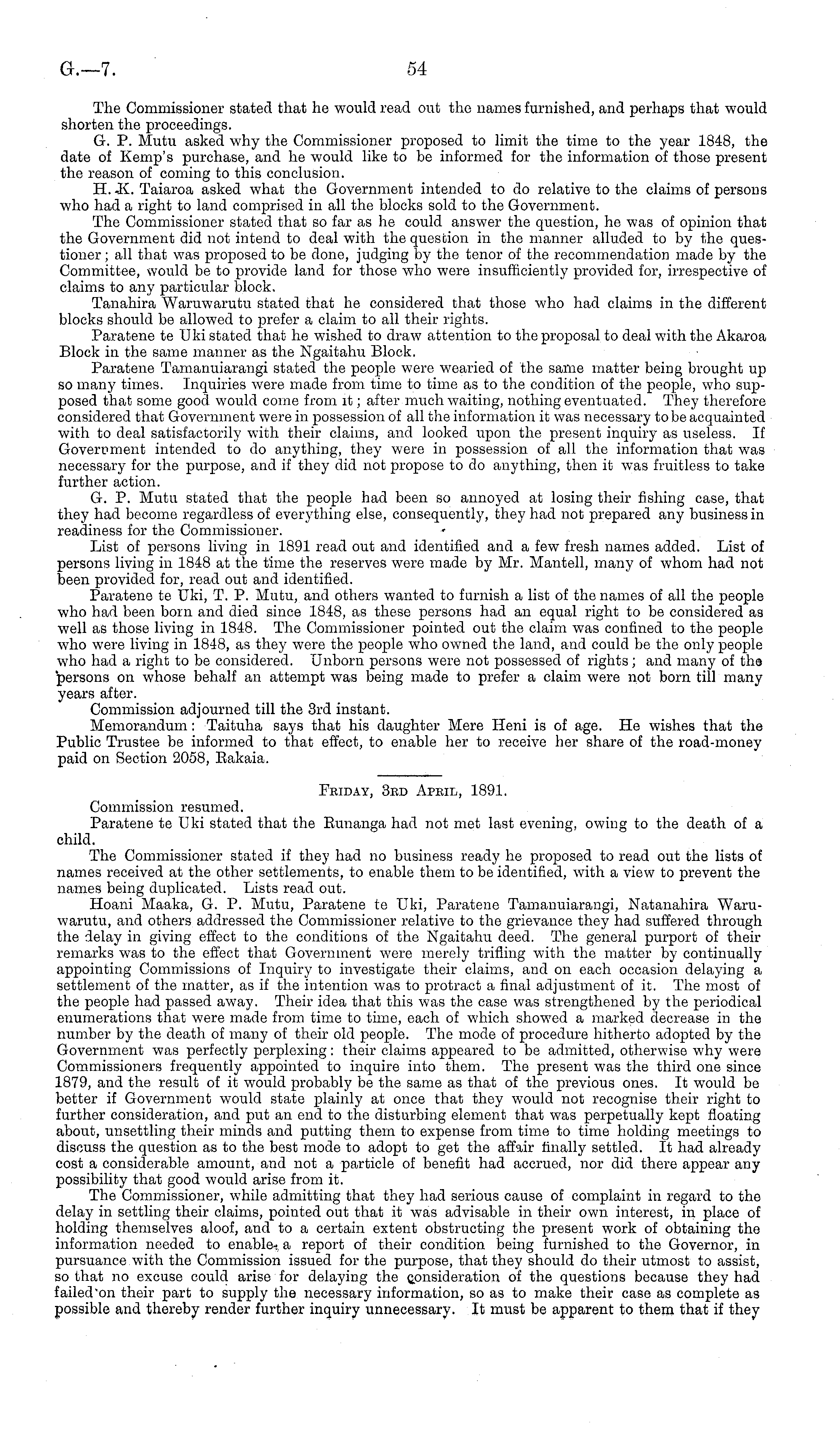 The Commissioner stated that he would read out the names furnished, and perhaps that would shorten the proceedings. G. P. Mutu asked why the Commissioner proposed to limit the time to the year 1848, the date of Kemp's purchase, and he would like to be informed for the information of those present the reason of coming to this conclusion. H. -K. Taiaroa asked what the Government intended to do relative to the claims of persons who had a right to land comprised in all the blocks sold to the Government. The Commissioner stated that so far as he could answer the question, he was of opinion that the Government did not intend to deal with the question in the manner alluded to by the questioner ; all that was proposed to be done, judging by the tenor of the recommendation made by the Committee, would be to provide land for those who were insufficiently provided for, irrespective of claims to any particular block, Tanahira Waruwarutu stated that he considered that those who had claims in the different blocks should be allowed to prefer a claim to all their rights. Paratene te Uki stated that he wished to draw attention to the proposal to deal with the Akaroa Block in the same manner as the Ngaitahu Block. Paratene Tamanuiarangi stated the people were wearied of the same matter being brought up so many times. Inquiries were made from time to time as to the condition of the people, who supposed that some good w rould come from it; after much waiting, nothing eventuated. They therefore considered that Government were in possession of all the information it was necessary to be acquainted with to deal satisfactorily with their claims, and looked upon the present inquiry as useless. If Government intended to do anything, they were in possession of all the information that was necessary for the purpose, and if they did not propose to do anything, then it was fruitless to take further action. G. P. Mutu stated that the people had been so annoyed at losing their fishing case, that they had become regardless of everything else, consequently, they had not prepared any business in readiness for the Commissioner. List of persons living in 1891 read out and identified and a few fresh names added. List of persons living in 1848 at the time the reserves were made by Mr. Man-tell, many of whom had not been provided for, read out and identified. Paratene te Uki, T. P. Mutu, and others wanted to furnish a list of the names of all the people who had been born and died since 1848, as these persons had an equal right to be considered as well as those living in 1848. The Commissioner pointed out the claim was confined to the people who were living in 1848, as they were the people who owned the land, and could be the only people who had a right to be considered. Unborn persons were not possessed of rights; and many of the persons on whose behalf an attempt was being made to prefer a claim were not born till many years after. Commission adjourned till the 3rd instant. Memorandum: Taituha says that his daughter Mere Heni is of age. He wishes that the Public Trustee be informed to that effect, to enable her to receive her share of the road-money paid on Section 2058, Bakaia.