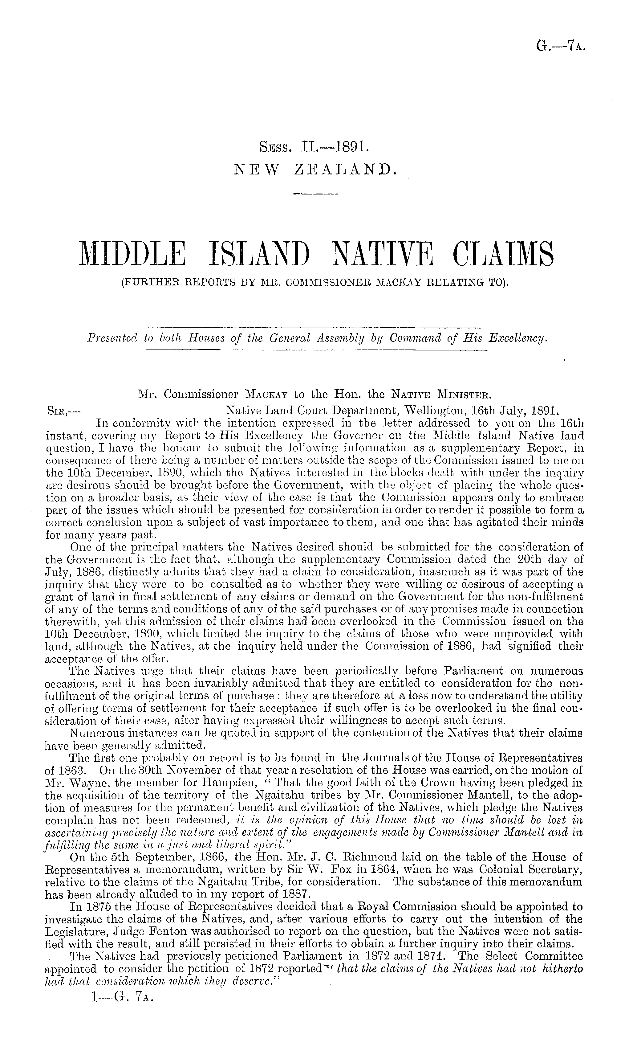 Mr. Commissioner Mackay to the Hon. the Native Minister. Sir, — Native Land Court Department, Wellington, 16th July, 1891. In conformity with the intention expressed in the letter addressed to you on the 16th instant, covering my Eeport to His Excellency the Governor on the Middle Island Native land question, I have the honour to submit the folloAving information as a supplementary Eeport, in consequence of there being a number of matters outside the scope of the Commission issued to me on the 10th December, 1890, Avhich the Natives interested in the blocks dealt with under the inquiry are desirous should be brought before the Government, with the object of placing the Avhole question on a broader basis, as tlieir A'ieAV of the case is that the Commission appears only to embrace part of the issues which should be presented for consideration in order to render it possible to form a correct conclusion upon a subject of vast importance to them, and one that has agitated their minds for many years past. One of the principal matters the Natives desired should be submitted for the consideration of the GoA'ernment is the fact that, although the supplementary Commission dated the 20th day of July, 1886, distinctly admits that they had a claim to consideration, inasmuch as it was part of the inquiry that they were to be consulted as to whether they were willing or desirous of accepting a grant of land in final settlement of any claims or demand on the Government for the non-fulfilment of any of the terms and conditions of any of the said purchases or of any promises made in connection thereAvith, yet this admission of their claims had been overlooked in the Commission issued on the 10th December, 1890, which limited the inquiry to the claims of those who Avere unprovided Avith land, although the NatiA 7es, at the inquiry held under the Commission of 1886, had signified their acceptance of the offer. The Natives urge that their claims have been periodically before Parliament on numerous occasions, and it has been invariably admitted that they are entitled to consideration for the nonfulfilment of the original terms of purchase : they are therefore at a loss now to understand the utility of offering terms of settlement for their acceptance if such offer is to be overlooked in the final consideration of their case, after having expressed their willingness to accept such terms. Numerous instances can be quoted in support of the contention of the Natives that their claims have been generally admitted. The first one probably on record is to be found in the Journals of the House of Eepresentatives of 1863. On the 30th November of that year a resolution of the House was carried, on the motion of Mr. Wayne, the member for Hampden, " That the good faith of the Crown haA 7ing been pledged in the acquisition of the territory of the Ngaitahu tribes by Mr. Commissioner Mantell, to the adoption of measures for the permanent benefit and civilization of the Natives, Avhich pledge the Natives complain has not been redeemed, it is the opinion of this House that no time should be lost in ascertaining precisely the nature and extent of the engagements made by Commissioner Mantell and in fulfilling the same in a just and liberal spirit." On the sth September, 1866, the Hon. Mr. J. C. Eichmond laid on the table of the House of Eepresentatives a memorandum, Avritten by Sir W. Fox in 1864, when he was Colonial Secretary, relative to the claims of the Ngaitahu Tribe, for consideration. The substance of this memorandum has been already alluded to in my report of 1887. In 1875 the House of Eepresentatives decided that a Eoyal Commission should be appointed to investigate the claims of the Natives, and, after various efforts to carry out the intention of the Legislature, Judge Fenton was authorised to report on the question, but the Natives were not satisfied AA'ith the result, and still persisted in their efforts to obtain a further inquiry into their claims. The Natives had previously petitioned Parliament in 1872 and 1874. The Select Committee appointed to consider the petition of 1872 reported"" that the claims of the Natives had not hitherto had that consideration xvhich they deserve." I— G. 7a.