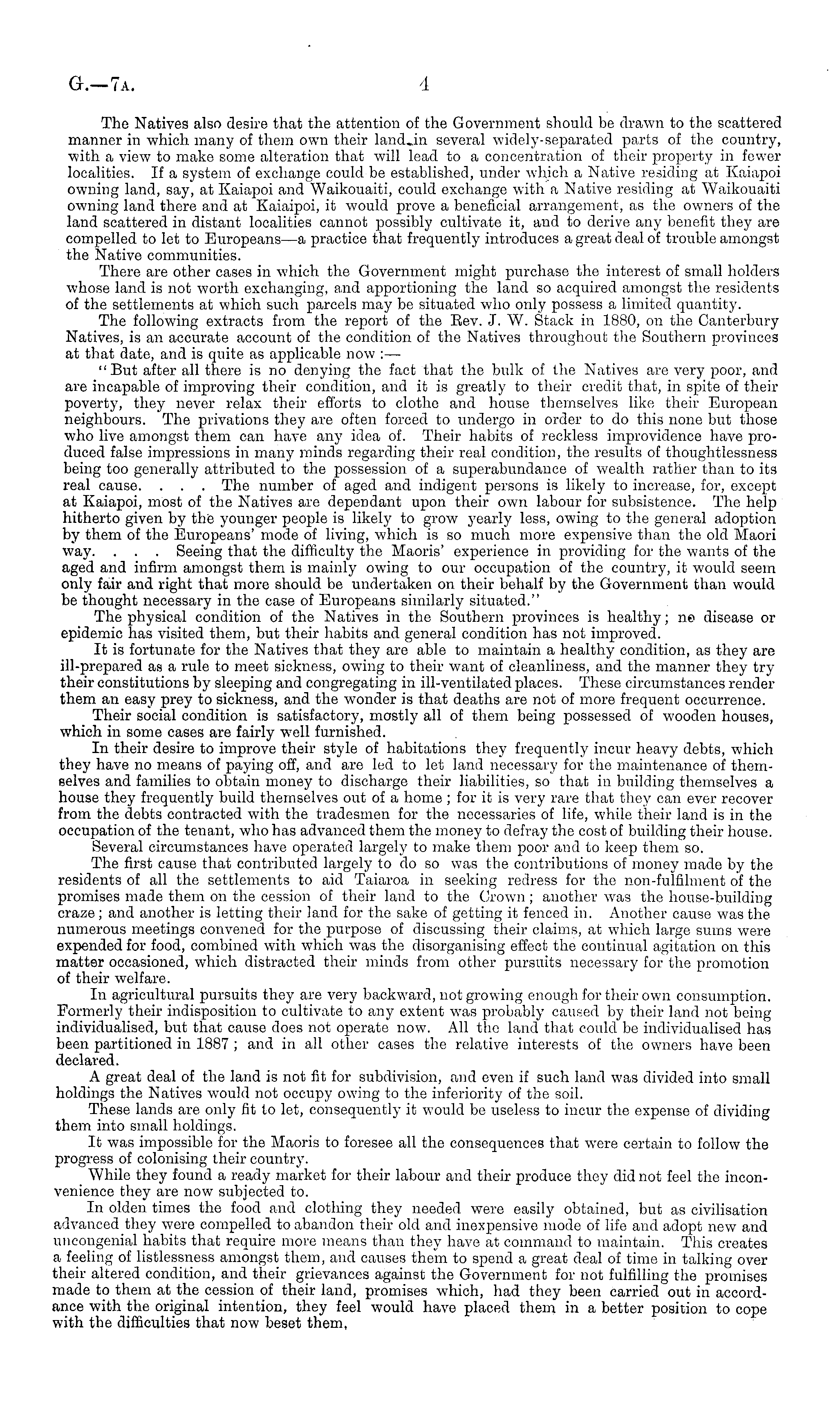 The Natives also desire that the attention of the Government should be draAvn to the scattered manner in which many of them own their land.in several widely-separated parts of the country, with a vieAV to make some alteration that will lead to a concentration of tlieir property in fewer localities. If a system of exchange could be established, under which a Native residing at Kaiapoi owning land, say, at Kaiapoi and Waikouaiti, could exchange Avith a Native residing at Waikouaiti owning land there and at Kaiaipoi, it would prove a beneficial arrangement, as the owners of the land scattered in distant localities cannot possibly cultivate it, and to derive any benefit they are compelled to let to Europeans —a practice that frequently introduces a great deal of trouble amongst the Native communities. There are other cases in Avhich the Government might purchase the interest of small holders Avhose land is not worth exchanging, and apportioning the land so acquired amongst the residents of the settlements at Avhich such parcels may be situated Avho only possess a limited quantity. The following extracts from the report of the Eev. J. W. Stack in 1880, on the Canterbury Natives, is an accurate account of the condition of the Natives throughout the Southern provinces at that date, and is quite as applicable iioav : — "But after all there is no denying the fact that the bulk of the NatiA 7es are A 7ery poor, and are incapable of improving their condition, and it is greatly to their credit that, in spite of thenpoverty, they never relax their efforts to clothe and house themselves like their European neighbours. The privations they are often forced to undergo in order to do this none but those Avho live amongst them can have any idea of. Their habits of reckless improvidence have produced false impressions in many minds regarding their real condition, the results of thoughtlessness being too generally attributed to the possession of a superabundance of Avoalth rather than to its real cause. . . . The number of aged and indigent persons is likely to increase, for, except at Kaiapoi, most of the Natives are dependant upon their own labour for subsistence. The help hitherto given by the younger people is likely to groAv yearly less, owing to the general adoption by them of the Europeans' mode of living, which is so much more expensive than the old Maori Avay. . . . Seeing that the difficulty the Maoris' experience in providing for the wants of the aged and infirm amongst them is mainly owing to our occupation of the country, it would seem only fair and right that more should be undertaken on their behalf by the Government than would be thought necessary in the case of Europeans similarly situated." The physical condition of the Natives in the Southern provinces is healthy; no disease or epidemic has visited them, but their habits and general condition has not improved. It is fortunate for the NatiA'es that they are able to maintain a healthy condition, as they are ill-prepared as a rule to meet sickness, owing to their want of cleanliness, and the manner they try their constitutions by sleeping and congregating in ill-ventilated places. These circumstances render them an easy prey to sickness, and the wonder is that deaths are not of more frequent occurrence. Their social condition is satisfactory, mostly all of them being possessed of wooden houses, Avhich in some cases are fairly well furnished. In their desire to improve their style of habitations they frequently incur heavy debts, Avhich they have no means of paying off, and are led to let land necessary for the maintenance of themselves and families to obtain money to discharge their liabilities, so that in building themselves a house they frequently build themselves out of a home ; for it is very rare that they can ever recover from the debts contracted Avith the tradesmen for the necessaries of life, Avhile their land is in the occupation of the tenant, Avho has advanced them the money to defray the cost of building their house. Several circumstances haA'e operated largely to make them poor and to keep them so. The first cause that contributed largely to do so was the contributions of money made by the residents of all the settlements to aid Taiaroa in seeking redress for the non-fulfilment of the promises made them on the cession of their land to the CroAvn; another Avas the house-building craze ; and another is letting tlieir land for the sake of getting it fenced in. Another cause Avas the numerous meetings convened for the purpose of discussing their claims, at which large sums were expended for food, combined with Avhich Avas the disorganising effect the continual agitation on this matter occasioned, which distracted their minds from other pursuits necessary for the promotion of their Avelfare. In agricultural pursuits they are very backAvard, not growing enough for their own consumption. Formerly their indisposition to cultivate to any extent Avas probably caused by their land not being individualised, but that cause does not operate hoav. All the land that could be individualised has been partitioned in 1887 ; and in all other cases the relative interests of the owners have been declared. A great deal of the land is not fit for subdivision, and even if such land Avas divided into small holdings the Natives would not occupy owing to the inferiority of the soil. These lands are only fit to let, consequently it Avould be useless to incur the expense of dividing them into small holdings. It was impossible for the Maoris to foresee all the consequences that were certain to follow the progress of colonising their country. While they found a ready market for their labour and their produce they did not feel the inconvenience they are now subjected to. In olden times the food and clothing they needed Avere easily obtained, but as civilisation adA'anced they Avere compelled to abandon their old and inexpensive mode of life and adopt neav an