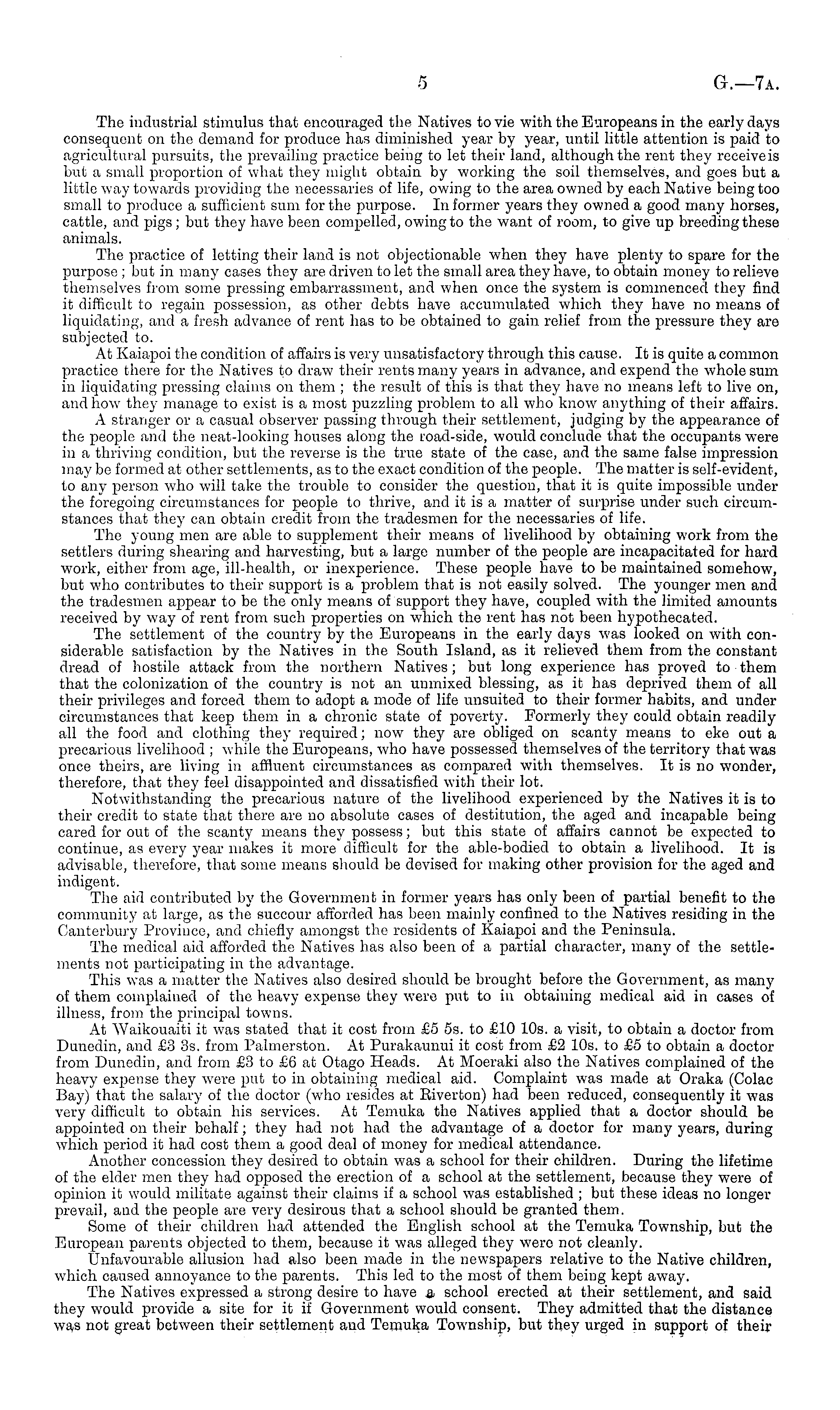 The industrial stimulus that encouraged the Natives to vie Avith the Europeans in the early days consequent on the demand for produce has diminished year by year, until little attention is paid to agricultural pursuits, the piwailiiig practice being to let their land, although the rent they receiveis but a small proportion of Avhat they might obtain by working the soil themselves, and goes but a little Avay toAvards providing the necessaries of life, OAA'ing to the area owned by each Native being too small to produce a sufficient sum for the purpose. In former years they owned a good many horses, cattle, and pigs; but they have been compelled, owing to the Avant of room, to give up breeding these animals. The practice of letting their land is not objectionable when they have plenty to spare for the purpose ; but in many cases they are driven to let the small area they have, to obtain money to relieve themselves from some pressing embarrassment, and Avhen once the system is commenced they find it difficult to regain possession, as other debts haA'e accumulated Avhich they have no means of liquidating, and a fresh advance of rent has to be obtained to gain relief from the pressure they are subjected to. At Kaiapoi the condition of affairs is very unsatisfactory through this cause. It is quite a common practice there for the Natives to draw their rents many years in advance, and expend the whole sum in liquidating pressing claims on them ; the result of this is that they haA 7e no means left to live on, andliOAv they manage to exist is a most puzzling problem to all Avho know anything of their affairs. A stranger or a casual observer passing through their settlement, judging by the appearance of the people and the neat-looking houses along the toad-side, would conclude that the occupants were in a thriving condition, but the reverse is the true state of the case, and the same false impression may be formed at other settlements, as to the exact condition of the people. The matter is self-evident, to any person who will take the trouble to consider the question, that it is quite impossible under the foregoing circumstances for people to thrive, and it is a matter of surprise under such circumstances that they can obtain credit from the tradesmen for the necessaries of life. The young men are able to supplement their means of livelihood by obtaining work from the settlers during shearing and harvesting, but a large number of the people are incapacitated for hard work, either from age, ill-health, or inexperience. These people haA 7e to be maintained somehow, but who contributes to their support is a problem that is not easily solved. The younger men and the tradesmen appear to be the only means of support they have, coupled with the limited amounts received by way of rent from such properties on which the rent has not been hypothecated. The settlement of the country by the Europeans in the early days was looked on with considerable satisfaction by the Natives in the South Island, as it relieved them from the constant dread of hostile attack from the northern Natives; but long experience has proved to them that the colonization of the country is not an unmixed blessing, as it has deprived them of all their privileges and forced them to adopt a mode of life unsuited to their former habits, and under circumstances that keep them in a chronic state of poverty. Formerly they could obtain readily all the food and clothing they required; now they are obliged on scanty means to eke out a precarious livelihood ; while the Europeans, who have possessed themselves of the territory that was once theirs, are living in affluent circumstances as compared with themselves. It is no wonder, therefore, that they feel disappointed and dissatisfied with their lot. Notwithstanding the precarious nature of the livelihood experienced by the Natives it is to their credit to state that there are no absolute cases of destitution, the aged and incapable being cared for out of the scanty means they possess; but this state of affairs cannot be expected to continue, as every year makes it more difficult for the able-bodied to obtain a livelihood. It is advisable, therefore, that some means should be devised for making other provision for the aged and indigent. The aid contributed by the Government in former years has only been of partial benefit to the community at large, as the succour afforded has been mainly confined to the Natives residing in the Canterbury Province, and chiefly amongst the residents of Kaiapoi and the Peninsula. The medical aid afforded the Natives has also been of a partial character, many of the settlements not participating in the advantage. This was a matter the Natives also desired should be brought before the Government, as many of them complained of the heavy expense they were put to in obtaining medical aid in cases of illness, from the principal towns. At Waikouaiti it was stated that it cost from £5 ss. to £10 10s. a visit, to obtain a doctor from Dunedin, and £3 3s. from Palmerston. At Purakaunui it cost from £2 10s. to £5 to obtain a doctor from Dunedin, and from £3 to £6 at Otago Heads. At Moeraki also the Natives complained of the heavy expense they were put to in obtaining medical aid. Complaint was made at Oraka (Colac Bay) that the salary of the doctor (who resides at Eiverton) had been reduced, consequently it AA'as very difficult to obtain his sendees. At Temuka the Natives applied that a doctor should be appointed on tlieir behalf; they had not had the advantage of a doctor for many years, during which period it had cost them a good deal of money for medical attendance. Another concession they desired to obtain was a school for their children. During the lifetime of the elder men they had opposed the erection of a school at the settlement, because they were of opinion it Avould militate against their claims if a school Avas established ; but these ideas no longer prevail, and
