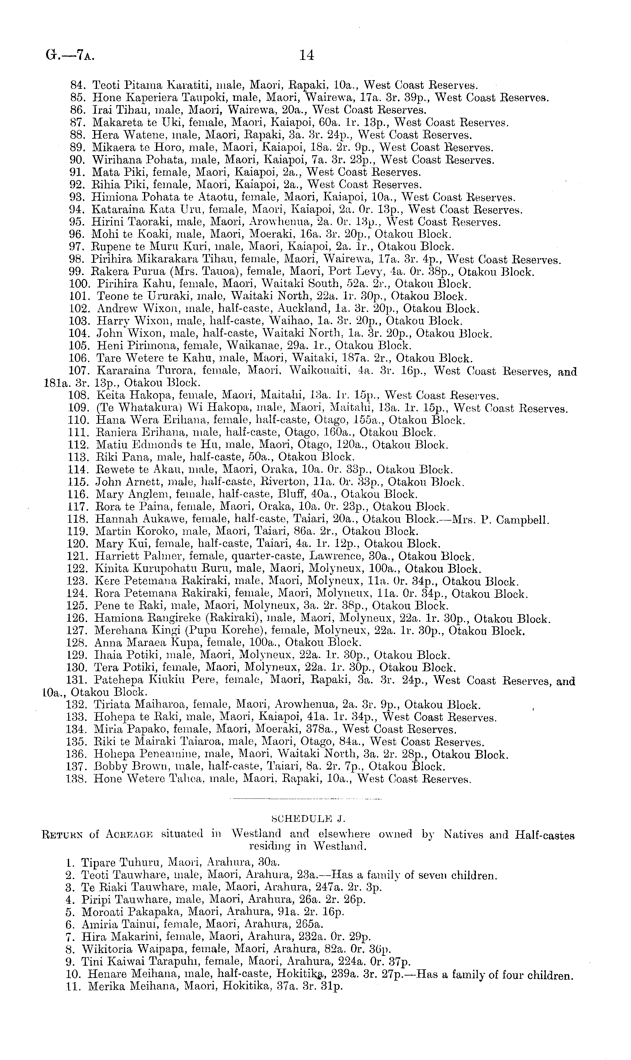 SCHEDULE J. Return of Acreage situated in Westland and elsewhere owned by Natives and Half-castes residing in Westland; 1. Tipare Tuhuru, Maori, Aralmra, 30a. 2. Teoti Tauwhare, male, Maori, Arahura, 23a.--Has a family of seven children. 3. Te Riaki TauAvhare, male, Maori, Arahura, 247a. 2r. 3p. 4. Piripi Tauwhare, male, Maori, Arahura, 26a. 2r. 26p. 5. Moroati Pakapaka, Maori, Arahura, 91a. 2r. 16p. 6. Amiria Tainui, female, Maori, Arahura, 265a. 7. Hira Makarini, female, Maori, Arahura, 232a. Or. 29p. 8. Wikitoria Waipapa, female, Maori, Arahura, 82a. Or. 86p. 9. Tini KaiAvai Tarapuhi, female, Maori, Arahura, 224a. Or. 37p. 10. Henare Meihana, male, half-caste, Hokitika, 239a. 3r. 27p.—Has a family of four children 11. Merika Meihana, Maori, Hokitika, 37a. Br. Sip.