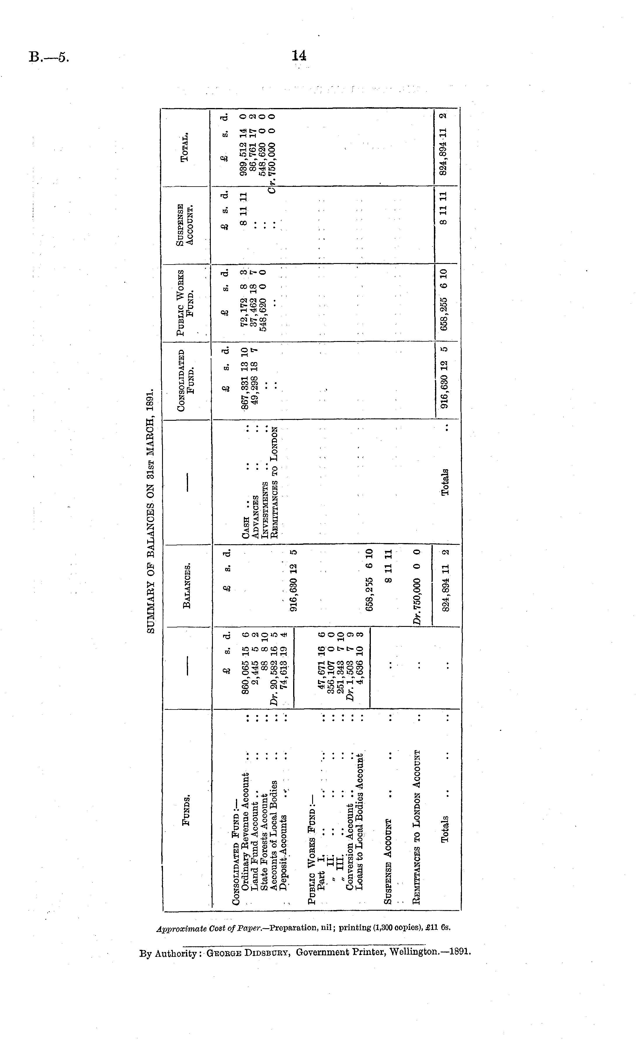 Funds. Balances. Consolidated Fund. Public Woeks Fund. Suspense Account. Total. Consolidated Fund :— Ordinary Revenue Account Land Fund Account State Forests Account Accounts of Local Bodies Deposit Accounts £ s. d. £ s. d. £ s. d. £ s. d. £ s. a. & s. d. 860,065 15 6 2,445 5 2 88 8 10 Dr. 20,582 16 5 74,613 19 4 Cash .. Advances Investments Remittances to London 867,331 13 10 49,298 18 7 72,172 8 3 37,462 18 7 548,620 0 0 8 11 11 •• c 939,512 14 0 86,761 17 2 548,620 0 0 r. 750,000 0 0 916,630 12 5 Public Woeks Fund: — Part I. .. .. ■ -..• „ II. .. .. „ III. Conversion Account Loans to Local Bodies Account 47,671 16 6 356,107 0 0 251,343 7 10 Dr. 1,503 7 9 4,636 10 3 658,255 6 10 Suspense Account 8 11 11 Remittances to London Account Dr. 750,000 0 0 Totals Totals 824,894 11 2 916,630 12 5 658,255 6 10 8 11 11 824,894 11 2