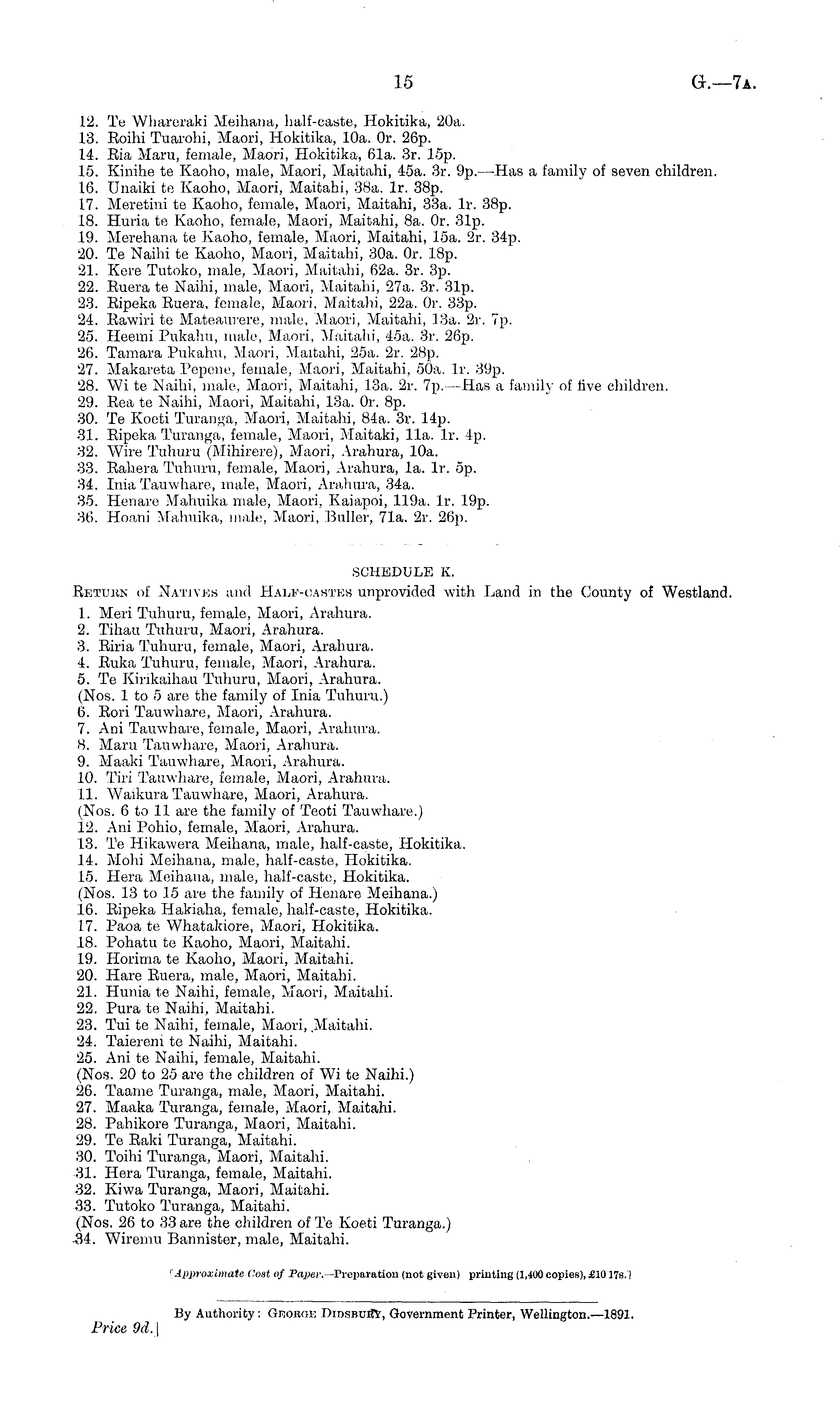 12. Te Whareraki Meihana, half-caste, Hokitika, 20a. 13. Eoihi Tuarohi, Maori, Hokitika, 10a. Or. 26p. 14. Eia Maru, female, Maori, Hokitika, 61a. 3r. 15p. 15. Kinihe te Kaoho, male, Maori, Maitahi, 45a. Sr. 9p.—Has a family of seven children. 16. Unaiki te Kaoho, Maori, Maitahi, 38a. lr. 38p. 17. Meretini te Kaoho, female, Maori, Maitahi, 33a. lr. 38p. 18. Huria te Kaoho, female, Maori, Maitahi, Ba. Or. Sip. 19. Merehana te Kaoho, female, Maori, Maitahi, 15a. 2r. 34p. 20. Te Naihi te Kaoho, Maori, Maitahi, 30a. Or. 18p. 21. Kere Tutoko, male, Maori, Maitahi, 62a. 3r. 3p. 22. Euera te Naihi, male, Maori, Maitahi, 27a. Sr. Sip. 23. Eipeka Euera, female, Maori, Maitahi, 22a. Or. 83p. 24. Eawiri te Mateaurere, male, Maori, Maitahi, 13a. 2r. 7p. 25. Heemi Pukahu, male, Maori, Maitahi, 45a. Br. 26p. 26. Tarnara Pukahu, Maori, Maitahi, 25a. 2r. 28p. 27. Makareta Pepene, female, Maori, Maitahi, 50a. lr. 89p. 28. Wi te Naihi, male, Maori, Maitahi, 13a. 2r. 7p.—Has a family of live children. 29. Eea te Naihi, Maori, Maitahi, 13a. Or. Bp. 30. Te Koeti Turanga, Maori, Maitahi, 84a. Sr. 14p. 31. Eipeka Turanga, female, Maori, Maitaki, 11a. lr. 4p. 32. Wire Tulmru (Mihirere), Maori, Arahura, 10a. 33. Eahera Tuhuru, female, Maori, Arahura, la. lr. sp. 34. Inia TauAvhare, male, Maori, Arahura, 34a. 35. Henare Mahuika male, Maori, Kaiapoi, 119a. lr. 19p. 36. Hoani Mahuika, male, Maori, Buller, 71a. 2r. 26]i. SCHEDULE K. Return of Natives and Half-castes unprovided with Land in the County of Westland. 1. Meri Tuhuru, female, Maori, Arahura. 2. Tihau Tuhuru, Maori, Arahura. 3. Eiria Tuhuru, female, Maori, Arahura. 4. Euka Tuhuru, female, Maori, Arahura. 5. Te Kirikaihau Tuhuru, Maori, Arahura. (Nos. 1 to 5 are the family of Inia Tuhuru.) 6. Eori Tauwhare, Maori, Arahura. 7. Ani Tauwhare, female, Maori, Arahura. 8. Maru Tauwhare, Maori, Arahura. 9. Maaki Tauwhare, Maori, Arahura. 10. Tiri Tauwhare, female, Maori, Arahura. 1.1. Waikura Tauwhare, Maori, Arahura. (Nos. 6 to 11 are the family of Teoti Tauwhare.) 12. Ani Pohio, female, Maori, Arahura. 13. Te Hikawera Meihana, male, half-caste, Hokitika. 14. Mohi Meihana, male, half-caste, Hokitika. 15. Hera Meihana, male, half-caste, Hokitika. (Nos. 13 to 15 are the family of Henare Meihana.) 16. Eipeka Hakiaha, female, half-caste, Hokitika. 17. Paoa te Whatakiore, Maori, Hokitika. 18. Pohatu te Kaoho, Maori, Maitahi. 19. Horima te Kaoho, Maori, Maitahi. 20. Hare Euera, male, Maori, Maitahi. 21. Hunia te Naihi, female, Maori, Maitahi. 22. Pura te Naihi, Maitahi. 23. Tui te Naihi, female, Maori, .Maitahi. 24. Taierem te Naihi, Maitahi. 25. Ani te Naihi, female, Maitahi. (Nos. 20 to 25 are the children of Wi te Naihi.) 26. Taame Turanga, male, Maori, Maitahi. 27. Maaka Turanga, female, Maori, Maitahi. 28. Pahikore Turanga, Maori, Maitahi. 29. Te Eaki Turanga, Maitahi. 30. Toihi Turanga, Maori, Maitahi. 31. Hera Turanga, female, Maitahi. 32. KiAva Turanga, Maori, Maitahi. 33. Tutoko Turanga, Maitahi. (Nos. 26 to 33 are the children of Te Koeti Turanga.) ■34. Wiremu Bannister, male, Maitahi. [Approximate Host of Paper. --Preparation (not given) printing (1,100 copies), £lti 17s. I