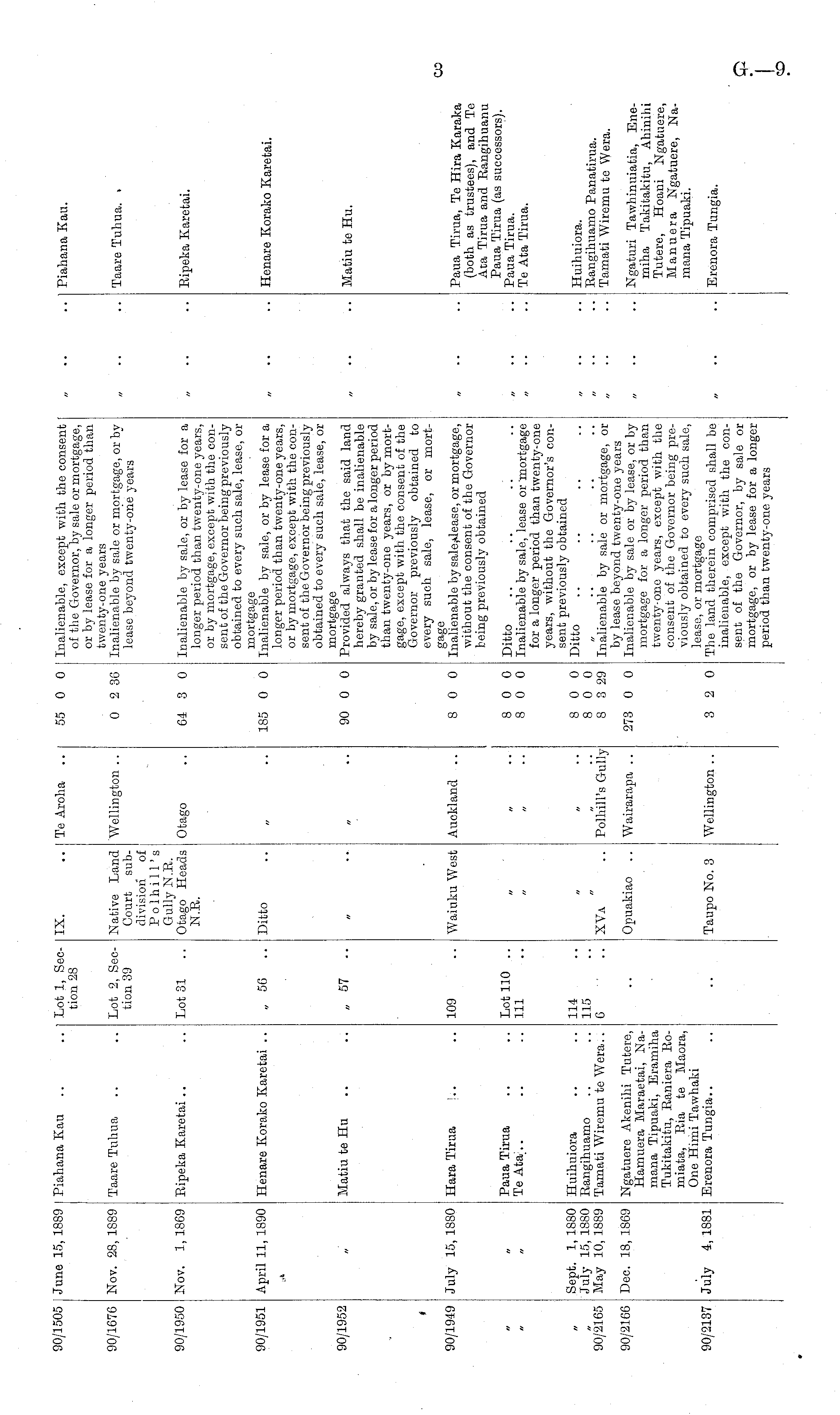 June 15, 1889 Piahana Kau Lot 1, Section 28 IX. Te Aroha 55 0 0 Inalienable, except with the consent of the Governor, by sale or mortgage, or by lease for a longer period than twenty-one years Inalienable by sale or mortgage, or by lease beyond twenty-one years Piahana Kau. Nov. 28, 18S9 Taare Tuhua Lot 2, Section 39 Native Land Court subdivision of Polhill's Gully N.E. Otago Heads N.R. Wellington .. 0 2 30 Taare Tuhua. . '0/1676 10/1950 Nov. 1, 1869 Ripeka Karetai Lot 31 .. Otago 64 3 0 Inalienable by sale, or by lease for a longer period than twenty-one years, or by mortgage, except with the consent of the Governor being previously obtained to every such sale, lease, or mortgage Inalienable by sale, or by lease for a longer period than twenty-one years, or by mortgage, except with the consent of the Governor being previously obtained to every such sale, lease, or mortgage Provided always that the said land hereby granted shall be inalienable by sale, or by lease for a longer period than twenty-one years, or by mortgage, except with the consent of the Governor previously obtained to every such sale, lease, or mortgage Inalienable by sale.Uease, or mortgage, without the consent of the Governor being previously obtained Ripeka Karetai. April 11, 1890 Henare Korako Karetai .. ,,56 .. Ditto Henare Korako Karetai. 10/1951 185 0 0 Matiu te Hu ,,57 Matiu te Hu. 10/1952 90 0 0 10/1949 Hara Tirua !.. Waiuku West Paua Tirua, Te Hira Karaka (both as trustees), and Te Ata Tirua and Rangihuanu Paua Tirua (as successors). Paua Tirua. Te Ata Tirua. July 15, 1880 109 Auckland 8 0 0 Paua Tirua TeAta.. Lot 110 .. Ill I 8 0 0 8 0 0 Ditto Inalienable by sale, lease or'mortgage for a longer period than twenty-one years, without the Governor's consent previously obtained Ditto Sept. 1, 1880 July 15, 1880 May 10, 1889 Huihuiora Rangihuamo Tamati Wiremu te Wera.. 114 115 8 0 0 8 0 0 8 3 29 Huihuiora. Rangihuamo Panatirua. Tamati Wiremu te Wora. 10/2165 XVa Polhill's Gully Inalienable by sale or mortgage, or by lease beyond twenty-one years Inalienable by sale or by lease, or by mortgage for a longer period than twenty-one years, except with the consent of the Governor being previously obtained to every such sale, lease, or mortgage The land therein comprised shall be inalienable, except with the consent of the Governor, by sale or mortgage, or by lease for a longer period than twenty-one years 10/2166 Dec. 18, 1869 July 4, 1881 Ngatuere Akenihi Tutere, Hamuera Maraetai, Namana Tipuaki, Eramilia Tukitakitu, Raniera Romiata, Ria te I\Iaora, One Himi Tawhaki Erenora Tungia.. Opuakiao Wairarapa .. 273 0 0 Ngaturi Tawhinuiatia, Enemiha Takitakitu, Ahinihi Tutere, Hoani Ngatuere, Manuera Ngatuere, Namana Tipuaki. Taupo No. 3 Wellington .. 10/2137 3 2 0 Erenora Tungia.