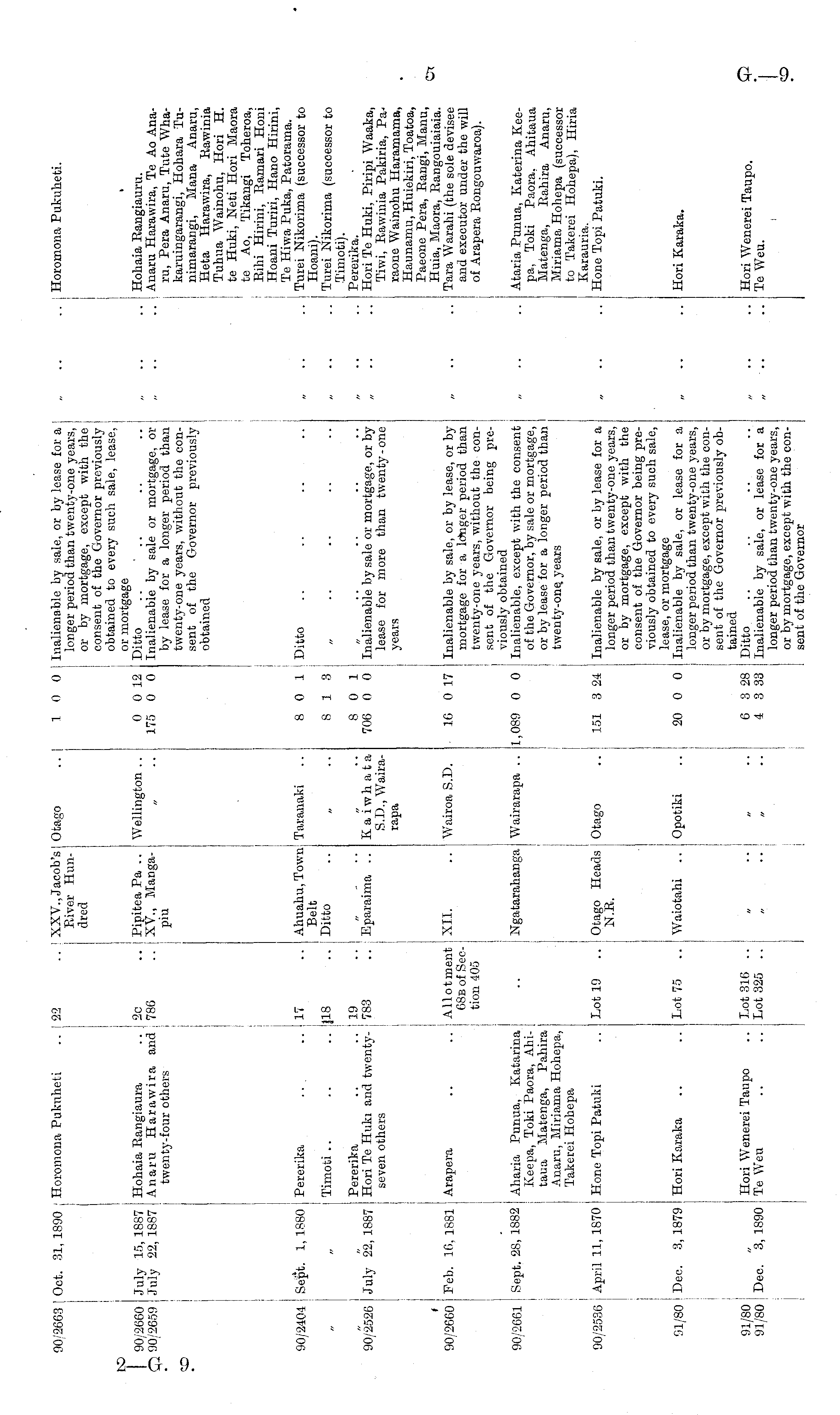 90/2663 ] Oct. 31, 1890 90 2663 S Oct. 31, 1890 ! Horomona Pukuheti .. i 22 .. ! XXV., Jacob's] Rivfii* Him- i XXV., Jacob's River Hundred I Otago 10 0 Inalienable by sale, or by lease for a I longer period than twenty-one years, | | or by mortgage, except with the i consent of the Governor previously I obtained to every such sale, lease, j or mortgage 0 0 12 Ditto .. ' .. 175 0 0 Inalienable by sale or mortgage, or \ by lease for a longer period than ; twenty-one years, without the con- j sent of the Governor previously obtained 8 0 1 I Ditto 8 13 8 0 1 | „ 706 0 0 j Inalienable by sale or mortgage, or by lease for more than twenty-one , years 16 0 17 Inalienable by sale, or by lease, or by ; mortgage for a longer period than ! twenty-one years, without the conj sent of the Governor being pre- | viously obtained 1,089 0 0 | Inalienable, except with the consent ' of the Governor, by sale or mortgage, I or by lease for a longer period than . twenty-one, years 151 3 24 Inalienable by sale, or by lease for a j longer period than twenty-one years, or by mortgage, except with the consent of the Governor being previously obtained to everj' such sale, lease, or mortgage 20 0 0 Inalienable by sale, or lease for a i longer period than twenty-one years, I or by mortgage, except with the con- | sent of the Governor previously ob- | tained 6 3 28 Ditto 4 3 33 ! Inalienable by sale, or lease for a : longer period than twenty-one years, ] or by mortgage, except with the con- j .. Horomona Pukuheti. .. Hohaia Eangiauru. .. Anaru Harawira, Te Ao Anaru, Pera Anaru, Tute Whakaruingarangi, Hohara Tunimarangi, Mana Anaru, Heta Harawira, Rawinia Tuhua Wainohu, Hori H. te Huki, Neti Hori Maora te Ao, Tikangi Toheroa, Rihi Hirini, Ramari Honi Hoani Turiri, Hano Hirini, | Te Hiwa Puka, Patorarna. .. ! Turei Nikorima (successor to Hoani). .. Turei Nikorima (successor to Timoti). .. Pererika. .. Hori Te Huki, Piripi Waaka, Tiwi, Rawinia Pakiria, Paraone Wainohu Haramama, Haunamu, Huiekiri, Toatoa, Paeone Pera, Rangi, Manu, Huia, Maora, Rangouiaiaia. .. Tara Warahi (the sole devisee | and executor under the will of Arapera Eongouwaroa). .. Ataria Punua, Katerina Keepa, Toki Paora, Ahitaua Matenga, Rahira Anaru, Miriama Hohepa (successor to Takerei Hohepa), Hiria Karauria. .. Hone Topi Patuki. .. Hori Karaka. .. Hori Wenerei Taupo. .. Te Weu. io .raver tiuni a r *A dreci ulcu | 90/2660 July 15, 1887 P 90/2659 July 22, 1887 I 90/2660 July 15, 1887 Hohaia Rangiaura .. j 2c .. Pipitea Pa .. 90/2659 July 22,1887 Anaru Harawira and j 786 .. XV., Manga-twenty-four others piu Pipitea Pa .. XV., Mangapiu Wellington .. 0 0 12 175 0 0 :o I — 90/2404 i Sept. 1, 1880 ! Pererika .. .. 17 .. Ahuahu, Town ' Belt I Timoti .. .. .. IJ18 .. j Ditto „ Pererika .. .. j 19 .. j „ 90/2526 July 22, 1887 Hori Te Huki and twenty- 783 .. Eparaima .. i seven others | 902660 Feb. 16,1881 Arapera .. .. Allotment I XII. ! 68b of Sec- ', tion 405 90/2661 Sept. 28, 1882 Aharia Purma, Katarina | .. i Ngatarahanga | Keepa, Toki Paora, Ahi- [ ] taua Matenga, Pahira j } Anaru, Miriama Ilohepa, Takerei Hohepa I Taranaki Kaiwhata S.D., Wairarapa Wairoa S.D. Wairarapa .. 90/2536 ! April 11, 1870 Hone Topi Patuki .. ! Lot 19 .. Otago Heads N.K. Otago 151 3 24 | i ■ 91/80 ' Deo. 3, 1879 j Hori Karaka .. .. Lot 75 .. Waiotahi .. ! Opotiki 20 0 0 i I 91/80 „ Hori Wenerei Taupo .. Lot 316 91/80 Dec. 3, 1890 Te Weu .. .. Lot 325 j I ! II 6 3 28 4 3 33