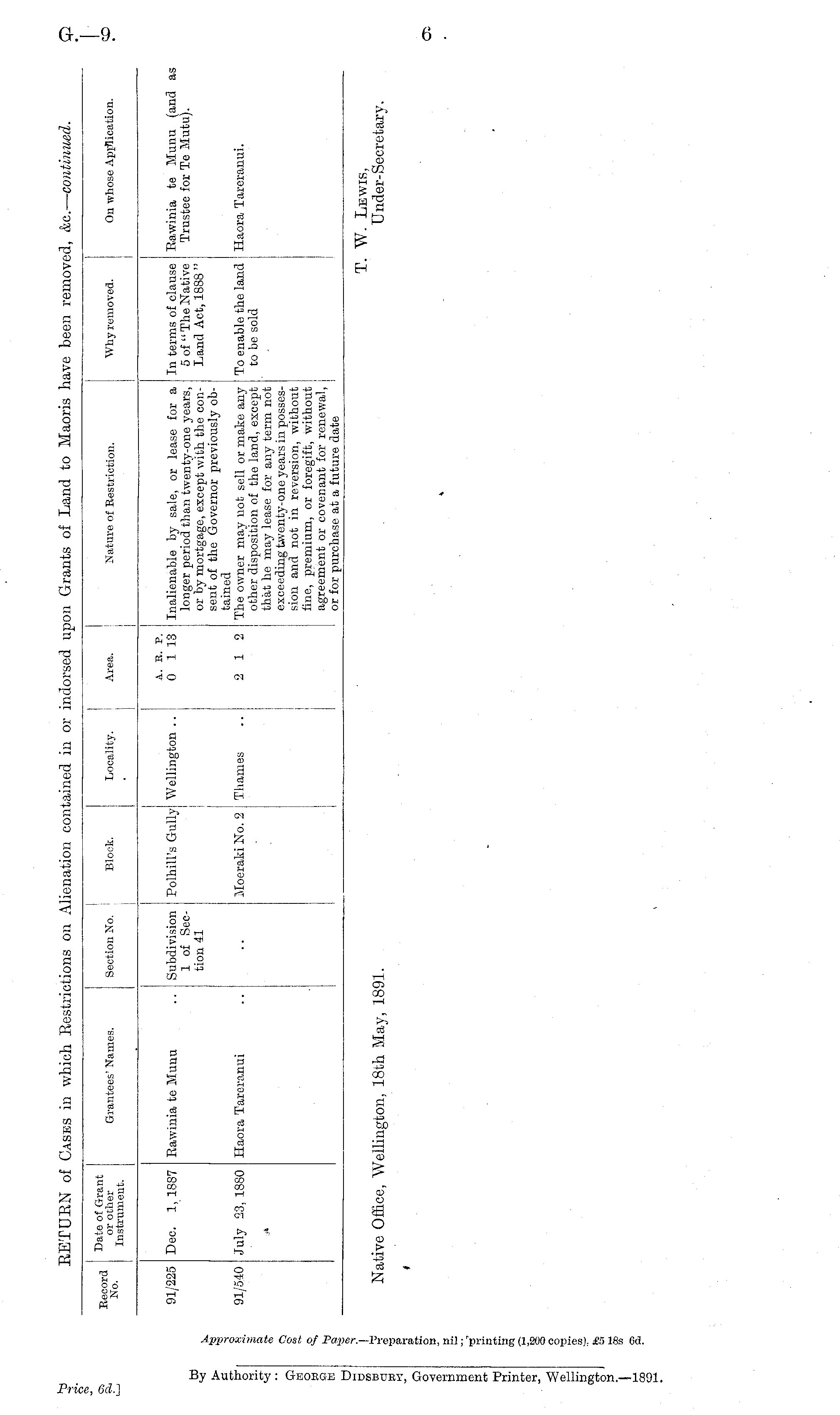 T. W. Lewis, Native Office, Wellington. 18th May, 1891. Under-Secretary.