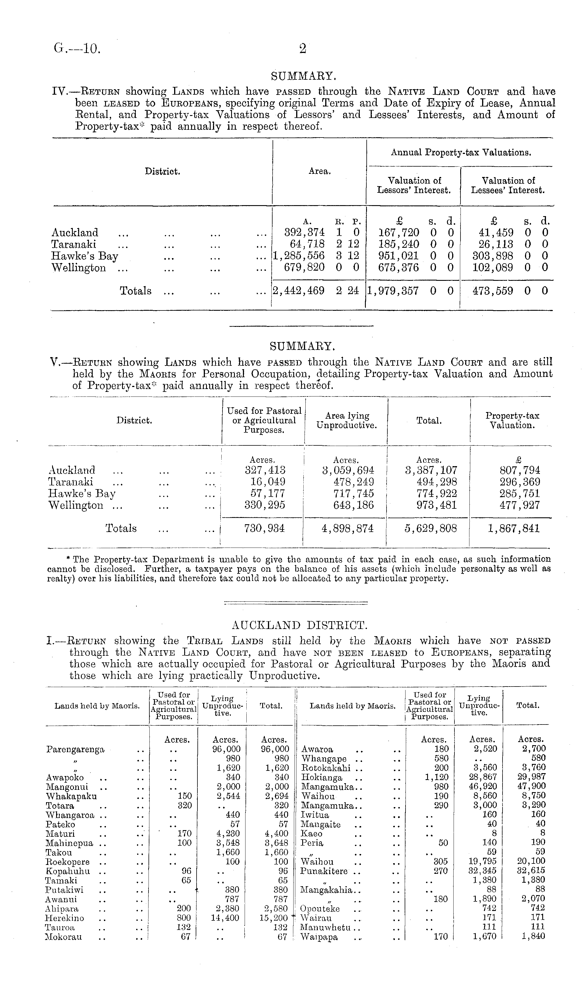 SUMMARY. V.—Return showing Lands which have passed through the Native Land Court and are still held by the Maoris for Personal Occupation, detailing Property-tax Valuation and Amount of Property-tax* paid annually in respect thereof.
