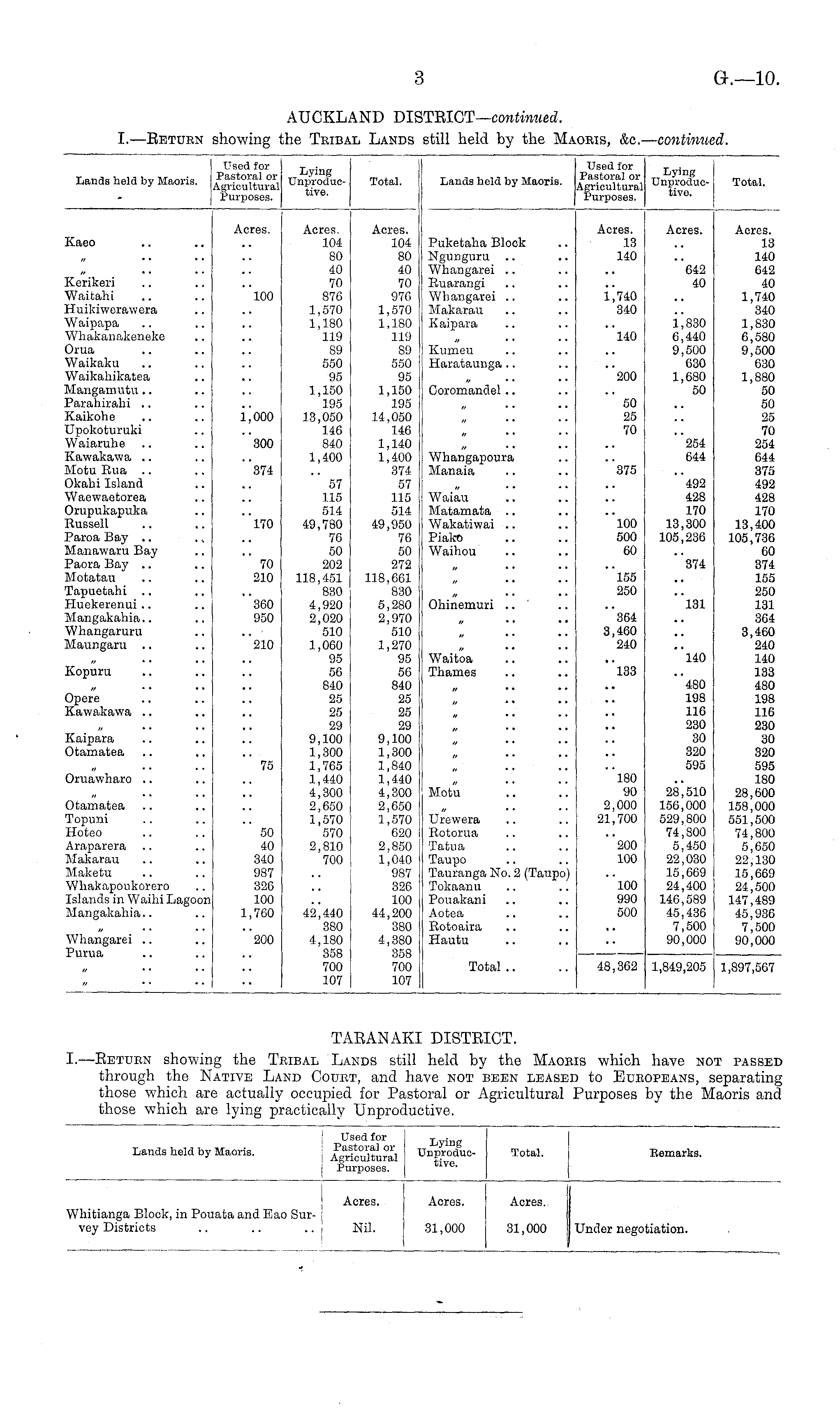 AUCKLAND DISTRICT— continued. I.—Return showing the Tribal Lands still held by the Maoris, &c.— continued.