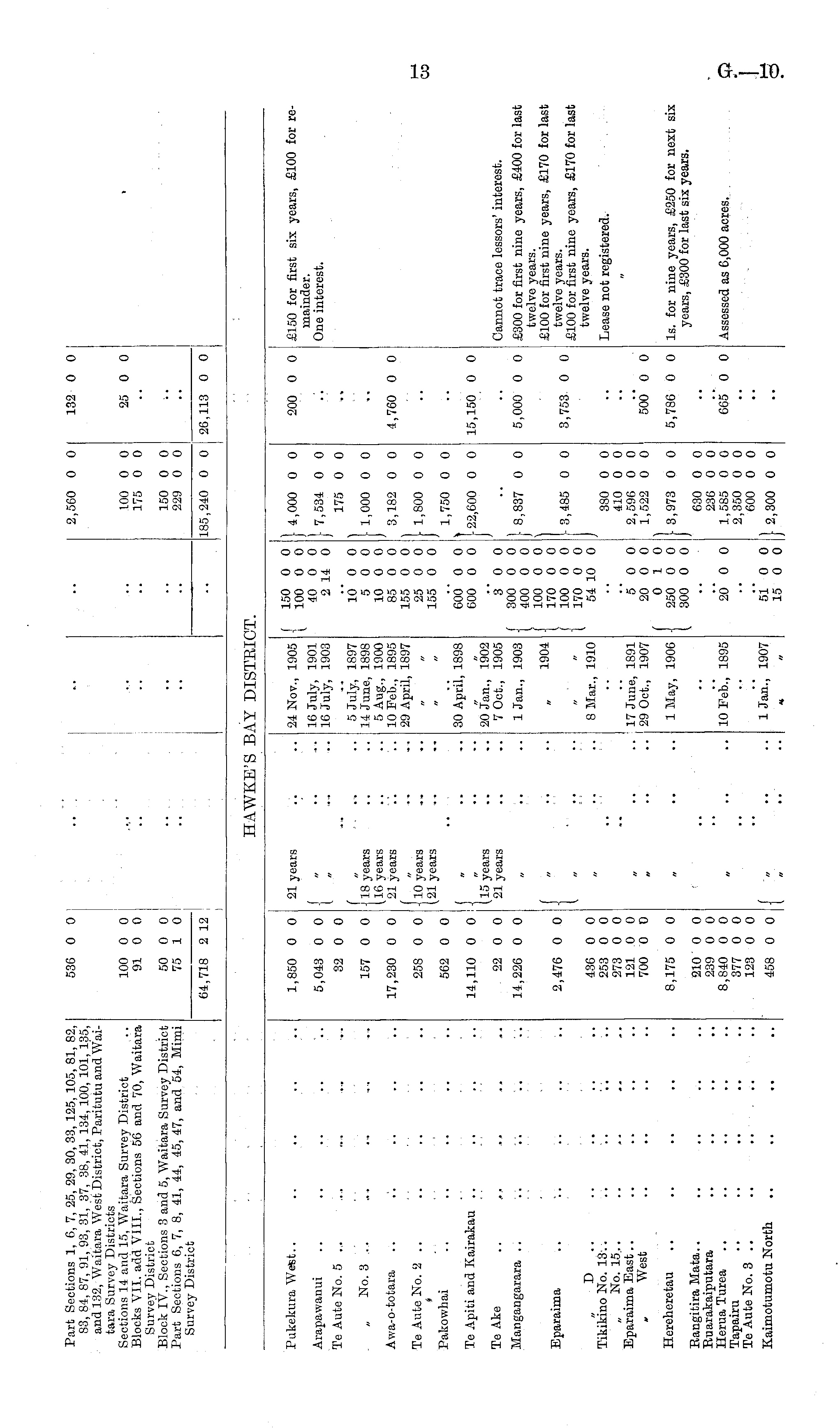 Pukekura West.. 1,850 0 0 21 years 24 Nov., 1905 1 150 0 0 100 0 0 40 0 0 2 14 0 - 4,000 0 0 200 0 0 £150 for first six years, £100 for remainder. One interest. Arapawanui 5,043 0 0 f „ 16 July, 1901 16 July, 1903 I 7,534 0 0 Te Aute No. 5 .. 32 0 0 5 July, 1897 14 June, 1898 5 Aug., 1900 10 Feb., 1895 29 April, 1897 10 0 0 5 0 0 10 0 0 85 0 0 155 0 0 25 0 0 155 0 0 175 0 0 No. 3 .. Awa-o-totara 157 0 0 17,230 0 0 \ 18 years (16 years 21 years ■j 10 years (21 years I 1,000 0 0 3,182 0 0 1 4,760 0 0 Te Aute No. 2 .. 258 0 0 I 1,800 0 0 Pakowhai 562 0 0 30 April, 1898 600 0 0 600 0 0 1,750 0 0 Cannot trace lessors' interest. Te Apiti and Kairakau .. 14,110 0 0 [lo years 21 years 20 Jan., 1902 7 Oct., 1905 j 3 0 0 300 0 0 400 0 0 100 0 0 170 0 0 100 0 0 170 0 0 54 10 0 j-22,600 0 0 15,150 0 0 Te Ake 22 0 0 1 MangaDgarara .. 14,226 0 0 1 Jan., 1903 \ 8,837 0 0 5,000 0 0 £300 for first nine years, £400 for lasl twelve years. £100 for first nine years, £170 for lasl twelve years. £100 for first nine years, £170 for lasl twelve years. Eparaima 2,476 0 0 I: 1904 - 3,485 0 0 3,753 0 0 Tikikino No. 13.. No. 15.. Eparaima East West 436 0 0 253 0 0 273 0 0 121 0 0 700 0 0 8 Mar., 1910 17 June, 1891 29 Oct., 1907 { 5 0 0 20 0 0 0 10 250 0 0 300 0 0 380 0 0 410 0 0 2,596 0 0 1,522 0 0 Lease not registered. 500* 0 0 Hereheretau 8,175 0 0 1 May, 1906 I 3,973 0 0 5,786 0 0 Is. for nine years, £250 for next sb years, £300 for last six years. Bangitira Mata.. Ruarakaiputara Herua Turea Tapairu Te Aute No. 3 .. 210 0 0 239 0 0 8,840 0 0 377 0 0 123 0 0 10 Feb.', 1895 26' 0 0 630 0 0 236 0 0 1,585 0 0 2,350 0 0 600 0 0 665' 0 0 Assessed as 6,000 acres. Kaimotumotu North ■ i 1 Jan.", 1907 si 0 0 15 0 0 I 2,300 0 0 458 0 0 * 'I
