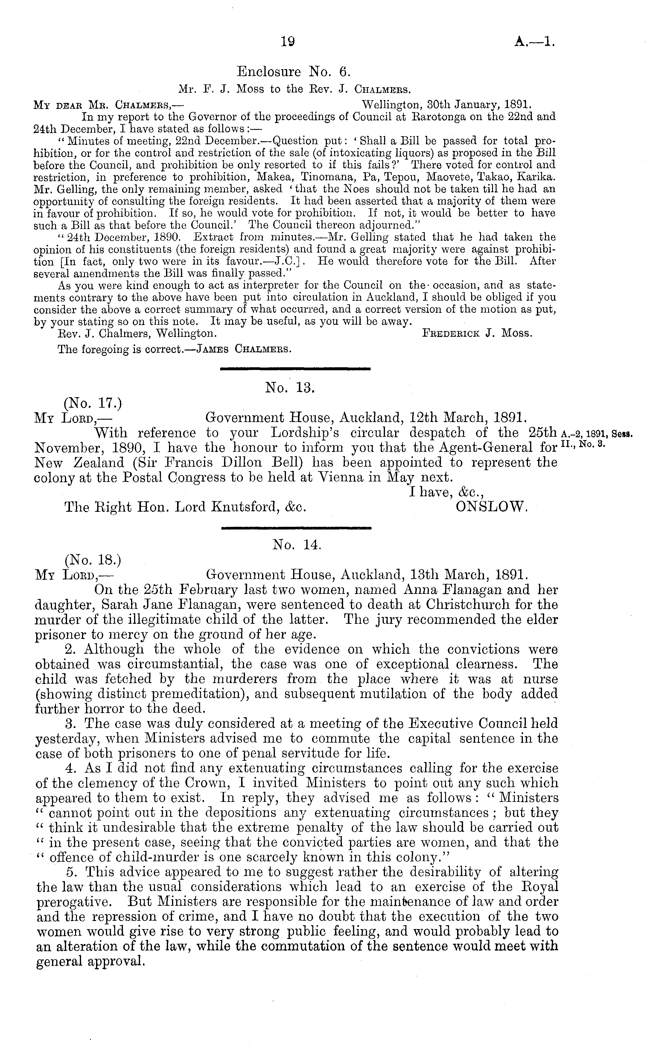 No. 14. (No. 18.) My Lord,— Government House, Auckland, 13th March, 1891. On the 25th February last two women, named Anna Flanagan and her daughter, Sarah Jane Flanagan, were sentenced to death at Christchurch for the murder of the illegitimate child of the latter. The jury recommended the elder prisoner to mercy on the ground of her age. 2. Although the whole of the evidence on which the convictions were obtained was circumstantial, the case was one of exceptional clearness. The child was fetched by the murderers from the place where it was at nurse (showing distinct premeditation), and subsequent mutilation of the body added further horror to the deed. 3. The case was duly considered at a meeting of the Executive Council held yesterday, when Ministers advised me to commute the capital sentence in the case of both prisoners to one of penal servitude for life. 4. As I did not find any extenuating circumstances calling for the exercise of the clemency of the Crown, I invited Ministers to point out any such which appeared to them to exist. In reply, they advised me as follows : " Ministers " cannot point out in the depositions any extenuating circumstances ; but they " think it undesirable that the extreme penalty of the law should be carried out " in the present case, seeing that the convicted parties are women, and that the " offence of child-murder is one scarcely known in this colony." 5. This advice appeared to me to suggest rather the desirability of altering the law than the usual considerations which lead to an exercise of the Royal prerogative. But Ministers are responsible for the maintenance of law and order and the repression of crime, and I have no doubt that the execution of the two women would give rise to very strong public feeling, and would probably lead to an alteration of the law, while the commutation of the sentence would meet with general approval,