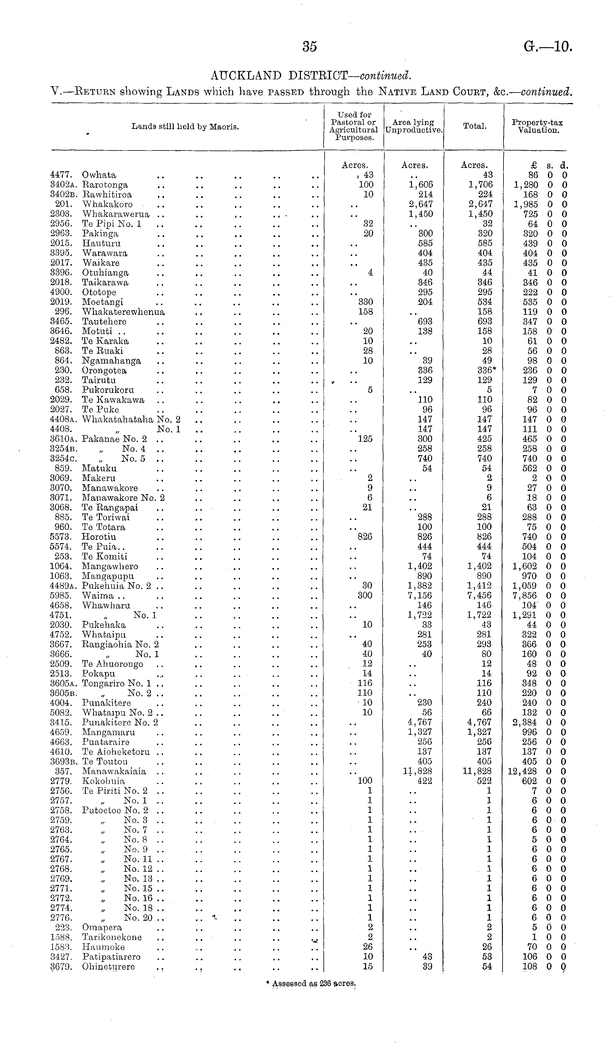 AUCKLAND DISTRICT-continued. V.—Return showing Lands which have passed through the Native Land Court, &c.— continued.