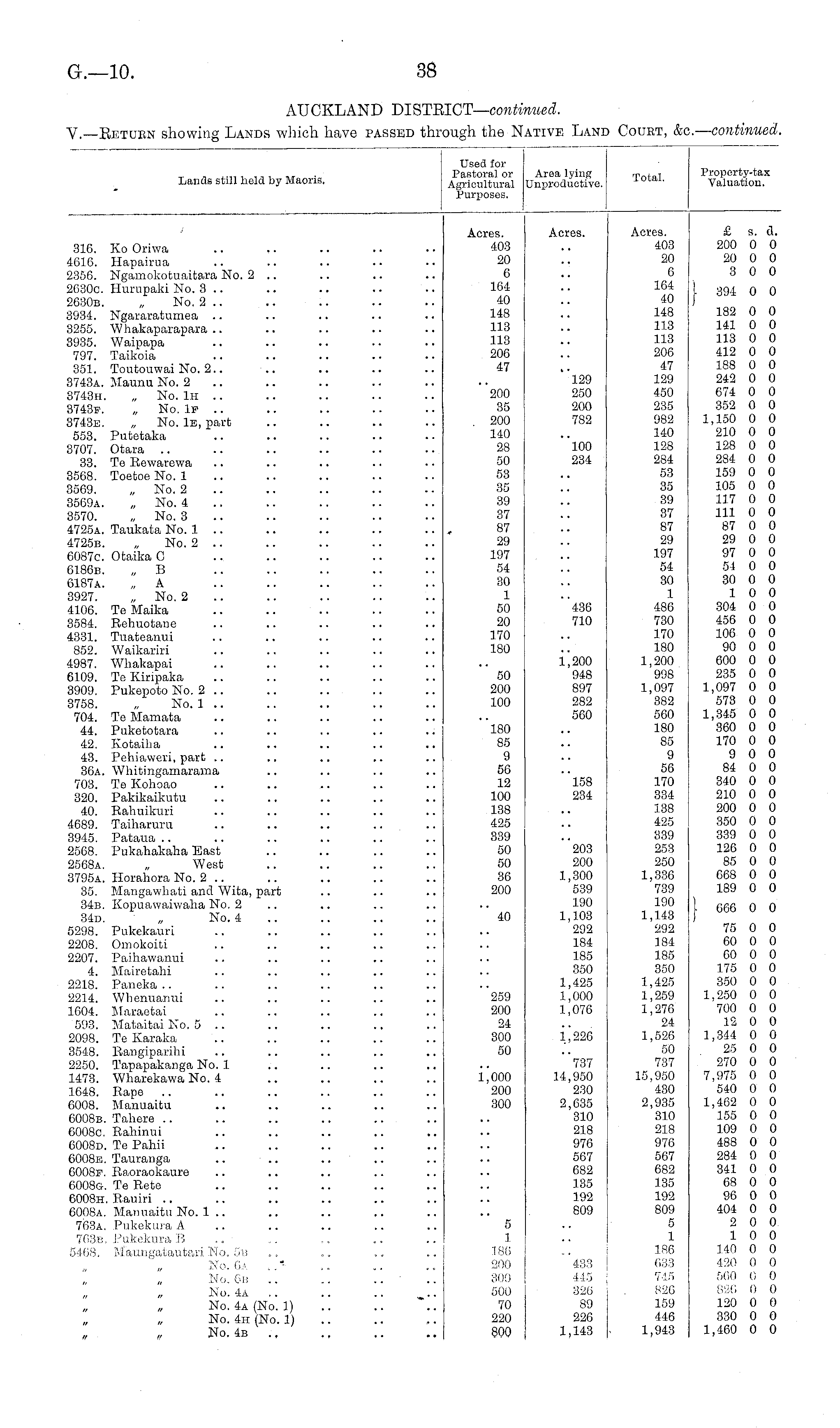 AUCKLAND DISTRICT-continued. V.—Return showing Lands which have passed through the Native Land Court, &c.— continued.