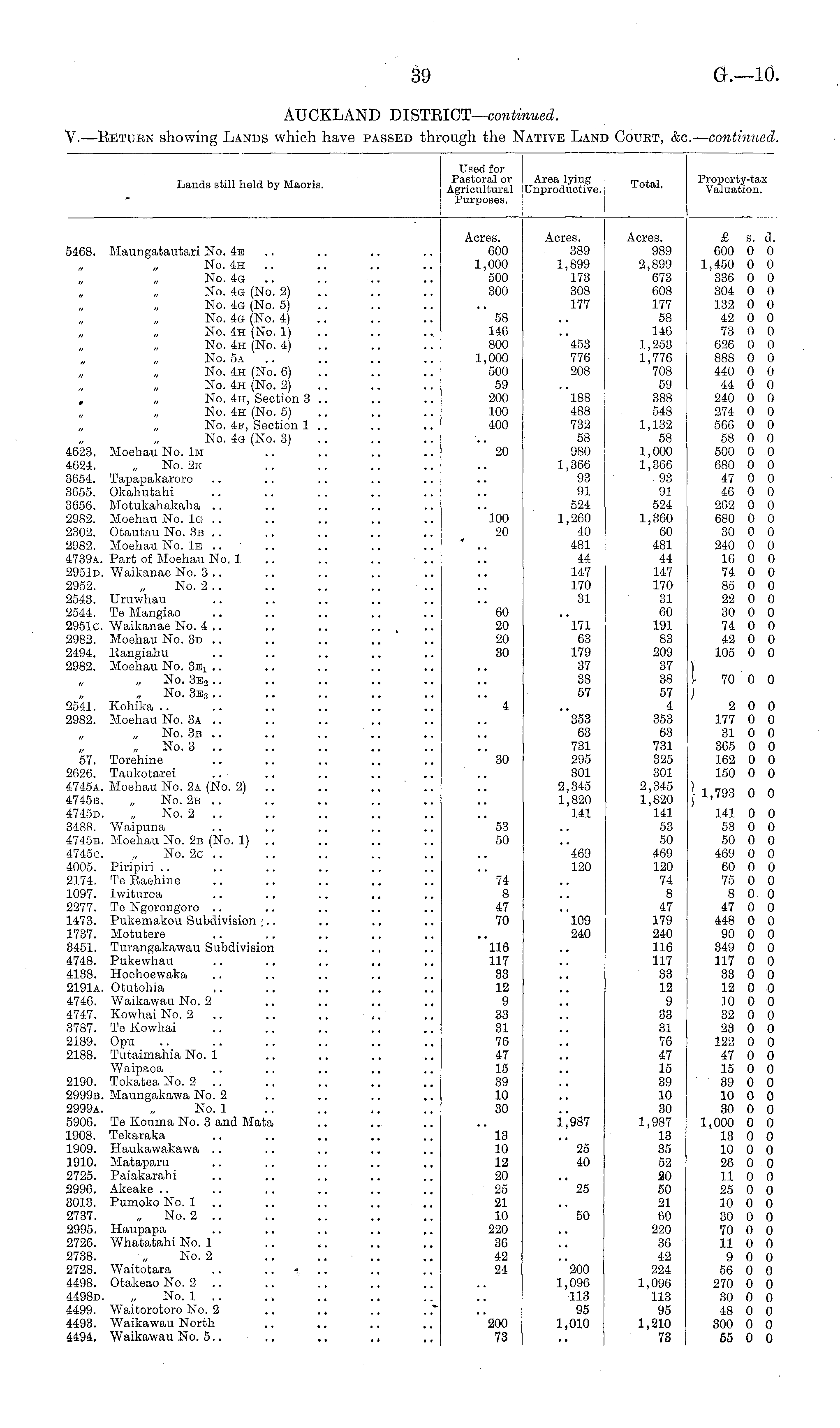 AUCKLAND DISTRICT-continued. V.—Return showing Lands which have passed through the Native Land Court, &c.— continued.